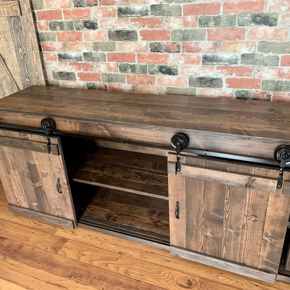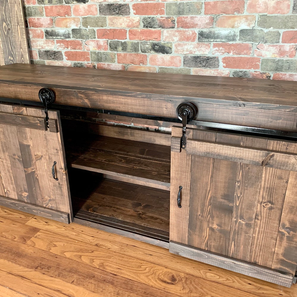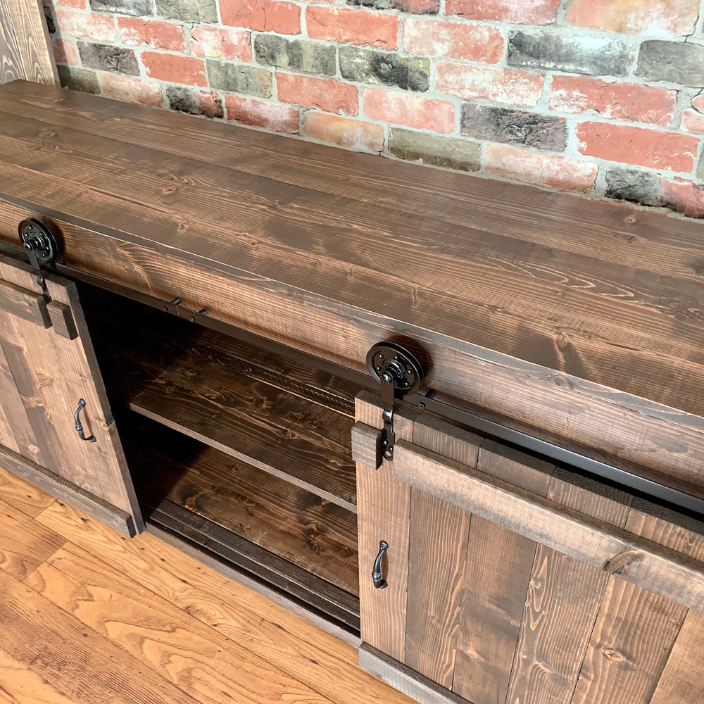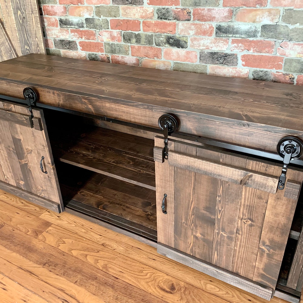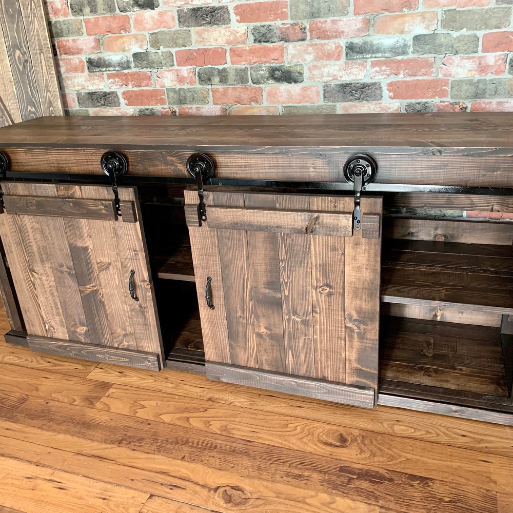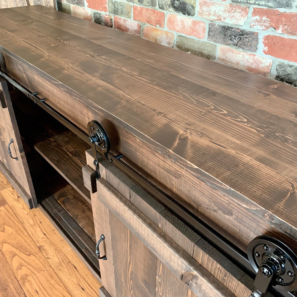 Sliding Barn Doors and metal wheels give this TV Stand its rustic farmhouse appeal.
