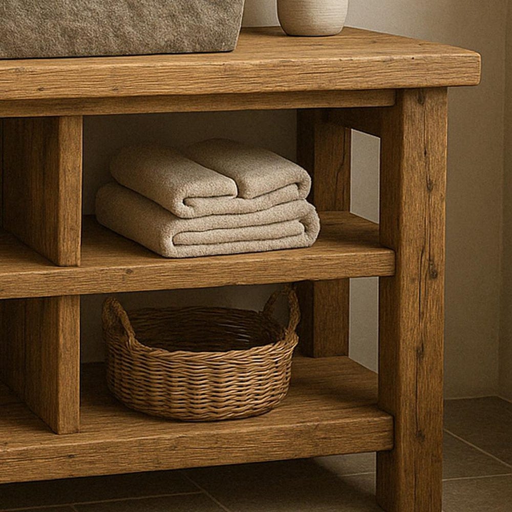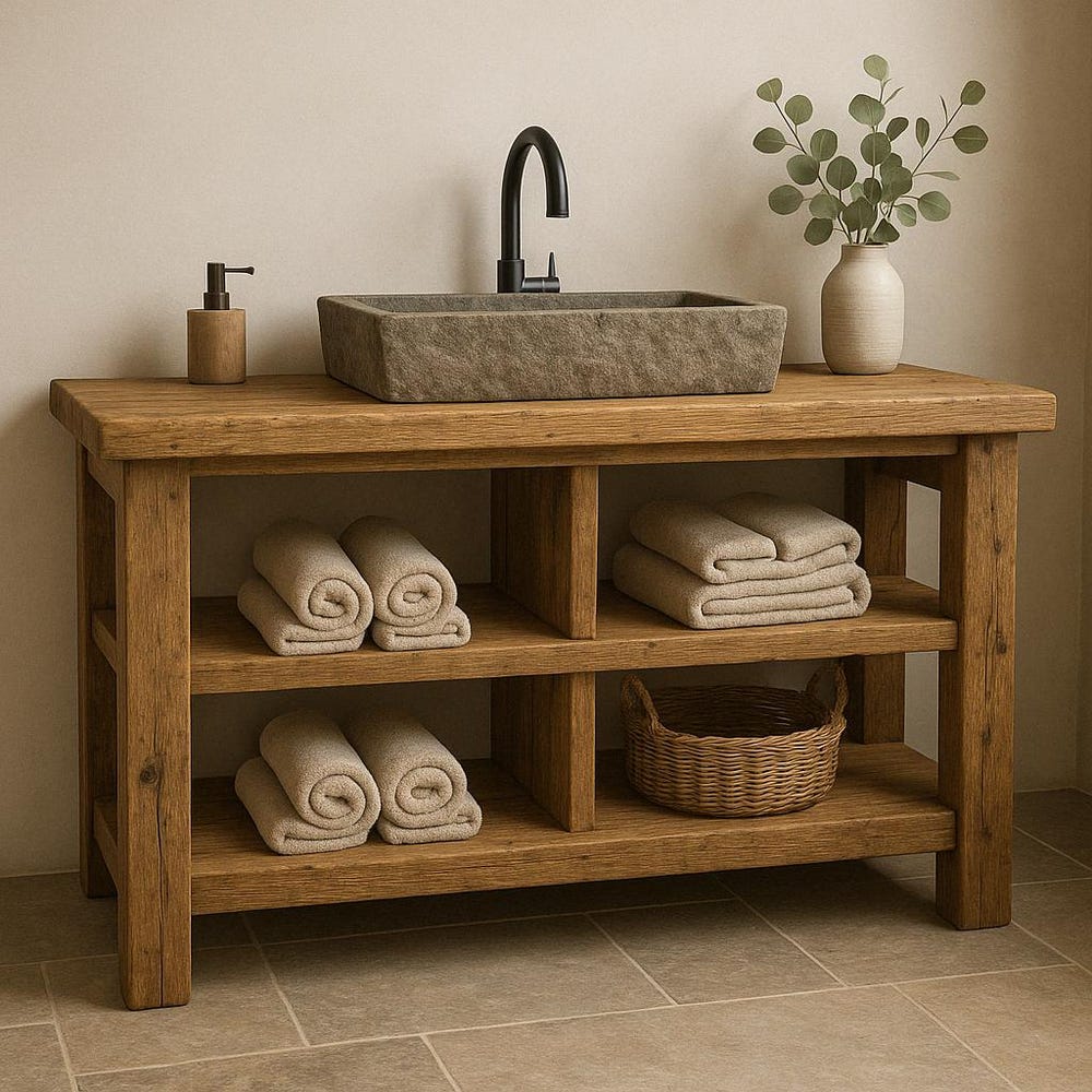 Transform your bathroom with this handmade rustic wood bathroom vanity, crafted from solid reclaimed wood for both beauty and durability. The spacious storage shelves offer a perfect solution for organizing towels, toiletries, and other bathroom essentials. With its farmhouse design, this washbasin table brings warmth and character to any bathroom, while the natural wood finish highlights its unique textures. 🛁🌿