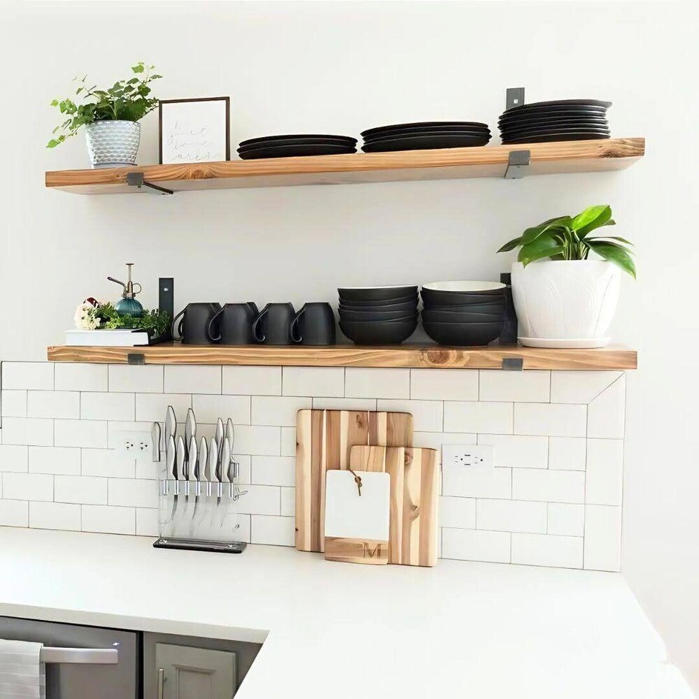Transform your walls with our set of 2 solid wood shelves — the perfect combination of modern farmhouse style and functional design! These floating shelves include 4 sturdy industrial brackets and all the hardware you need for quick, hassle-free installation. Instantly enhance your living room, bathroom, kitchen, bar, or office with charm, style, and organization.