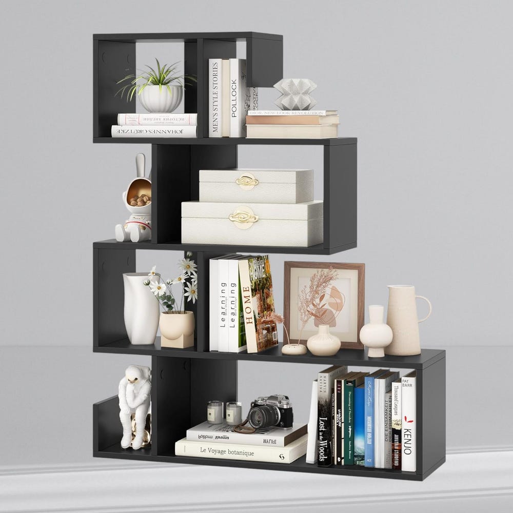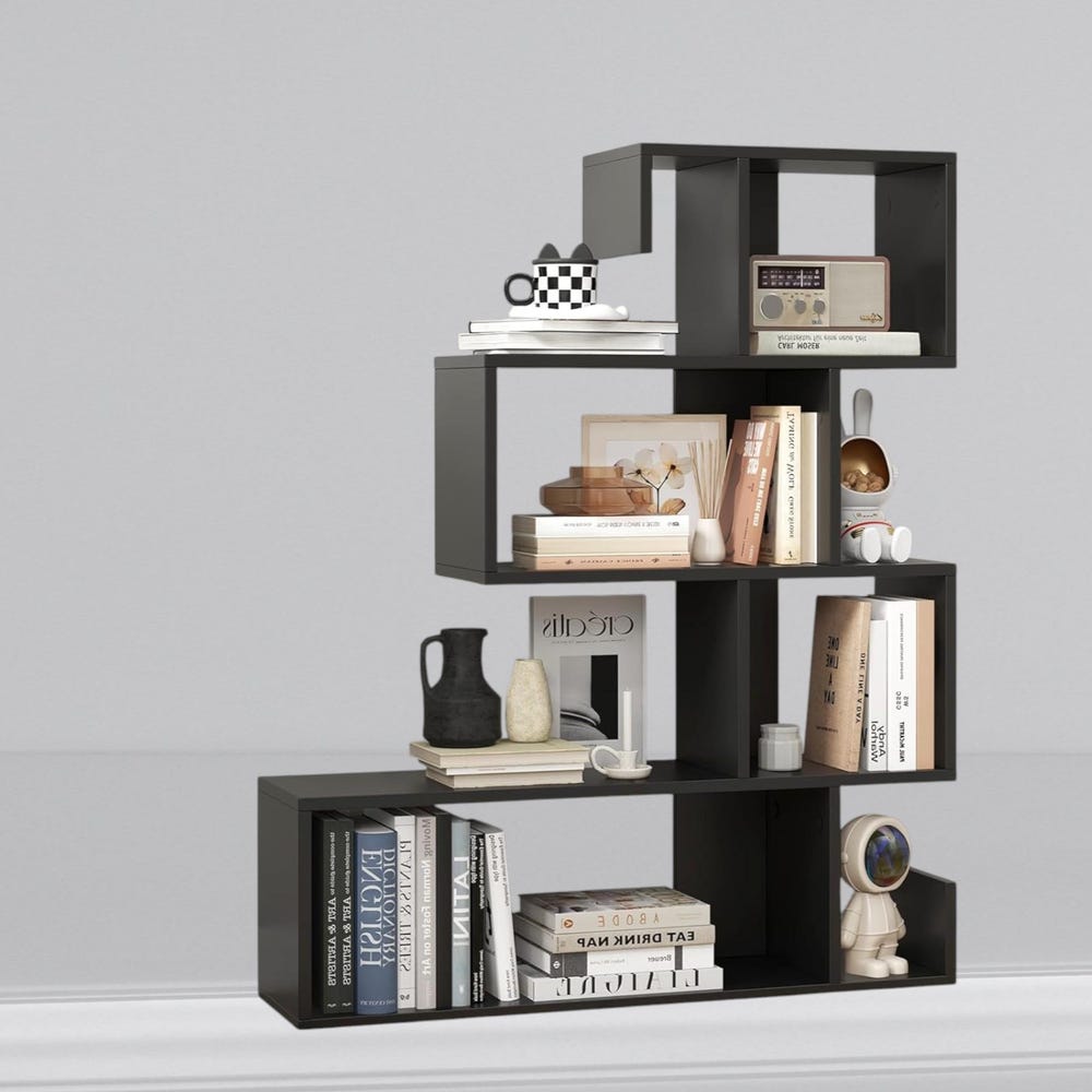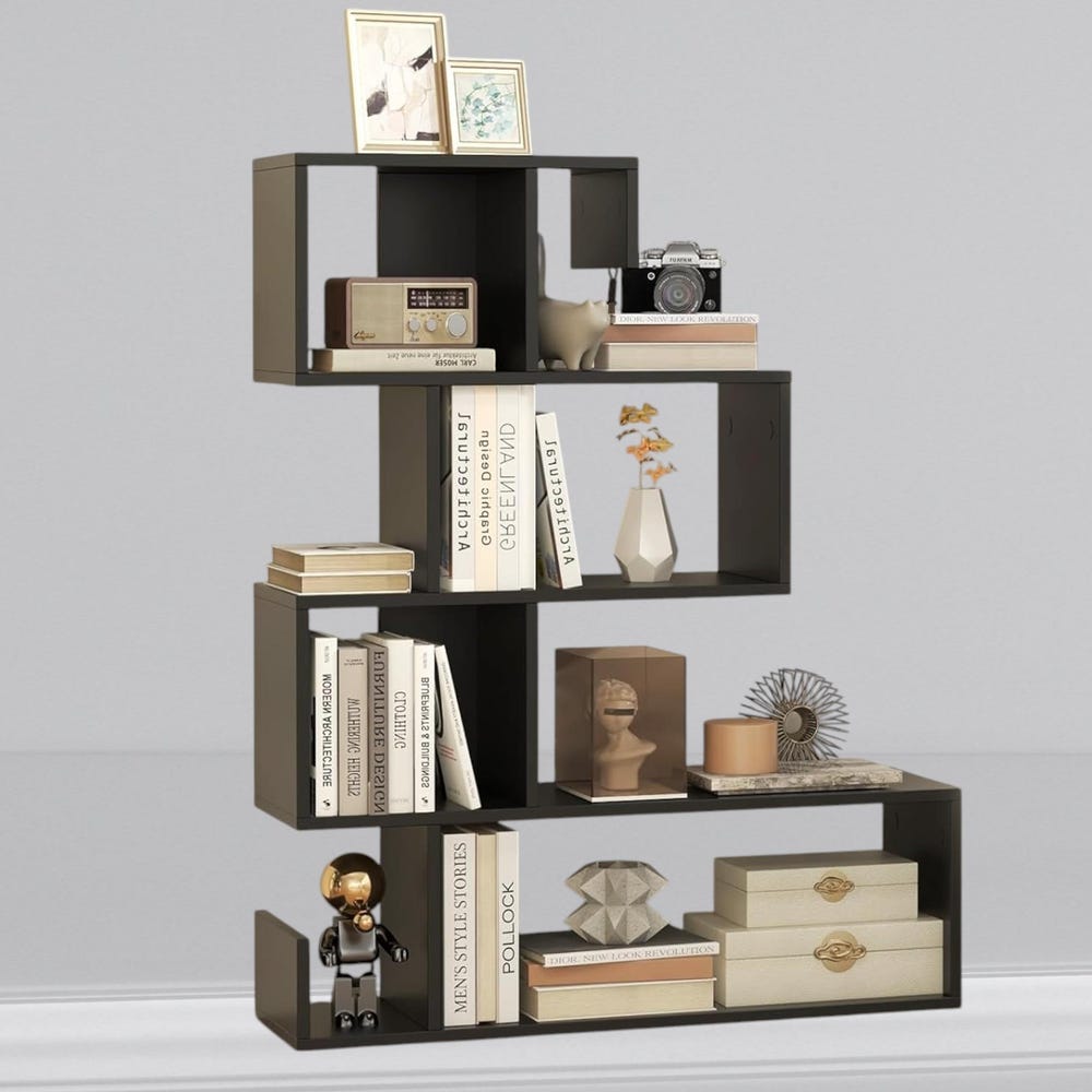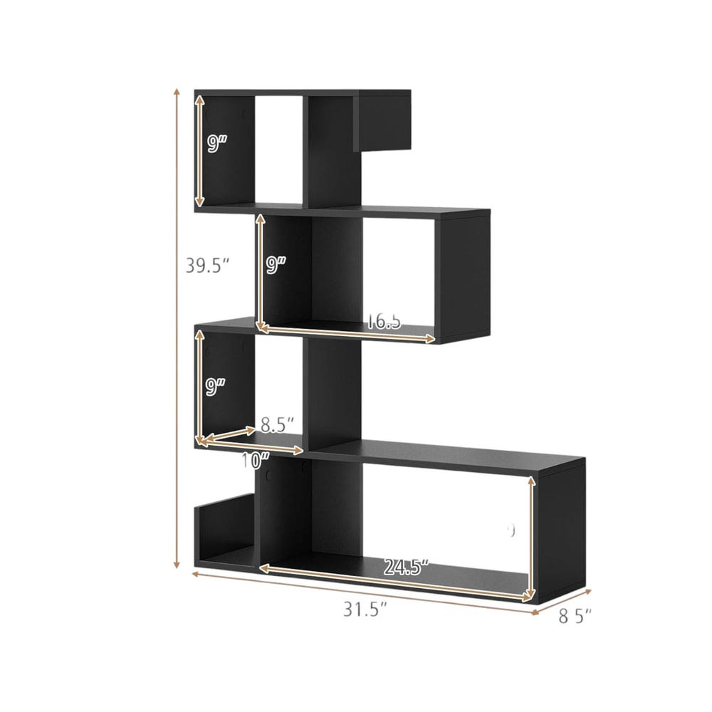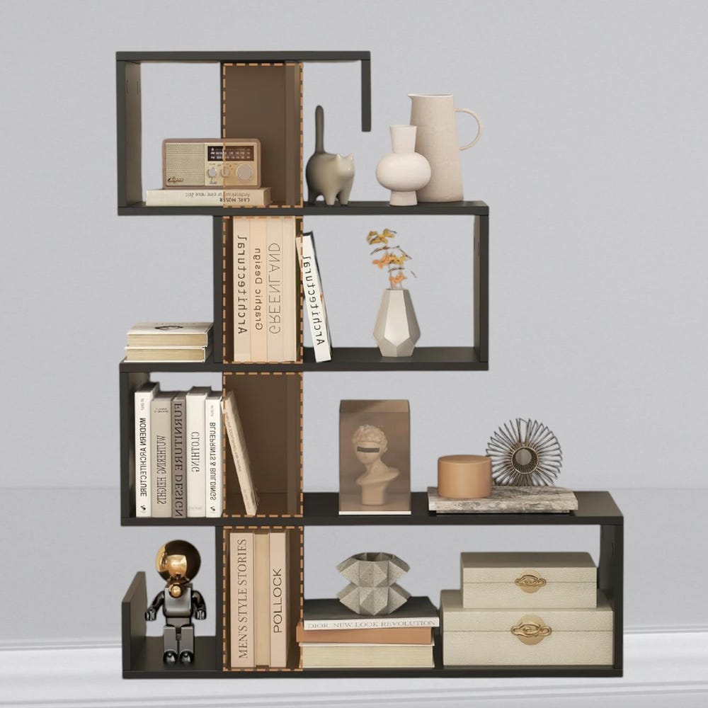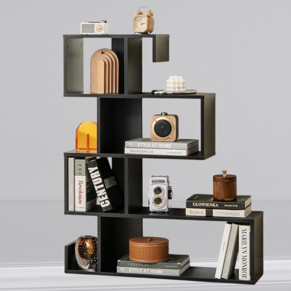 S-Shaped Bookshelf | 5-Tier Modern Geometric Stepped Bookcase with Anti-Tipping Kits | Black