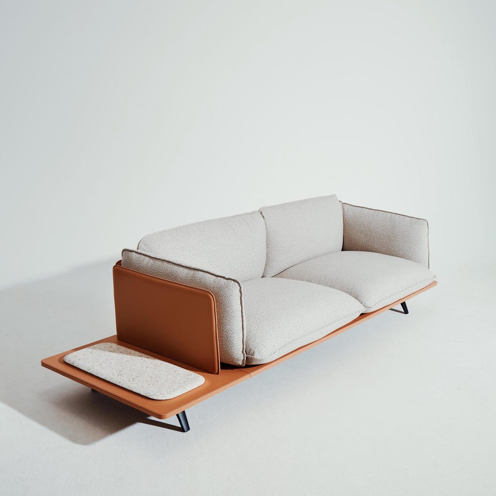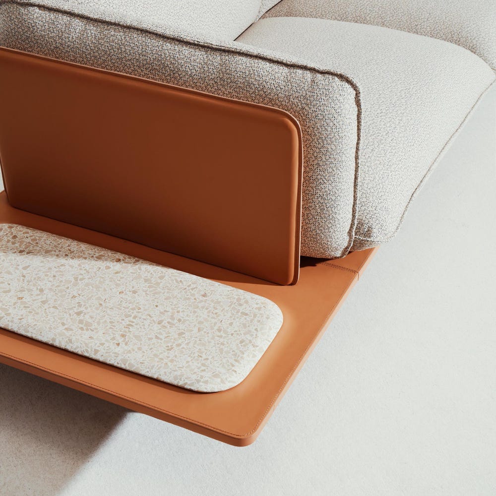 This 2-seat modular design features plush, cloud-like cushions resting freely on a lacquered MDF platform. The extended base at one end creates a built-in side table, available in a selection of high-end finishes like glossy marble or terrazzo. A leather-upholstered back panel and rounded vertical supports add sculptural elegance to the overall silhouette, inspired by the traditional curved khaima tents of the Sahara.