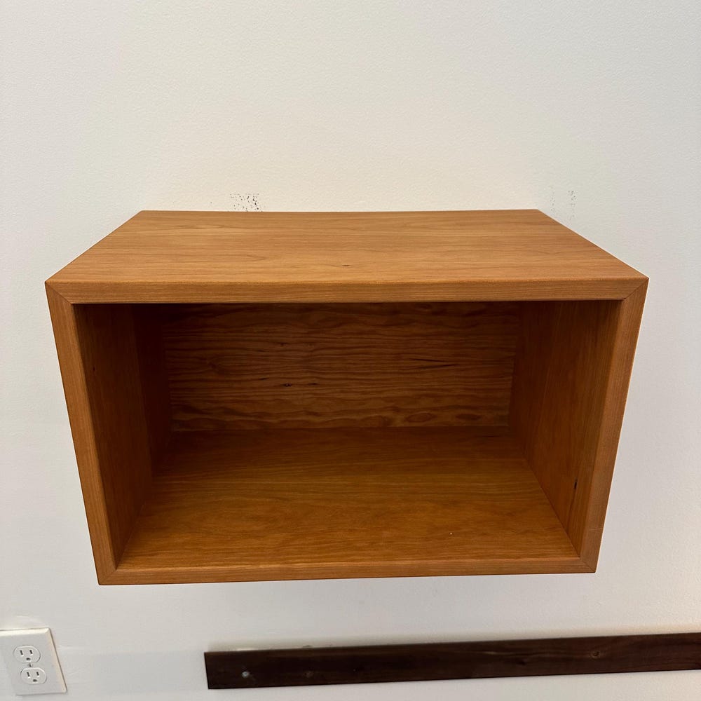 SAMPLE/ SECOND SALE ITEM Cherry floating bookshelf16″ wide x 10″ tall x 10″ deepInside dimensions 14.75″ wide x 8.75″ tall x 8.75 ” deep Why is it for sale?We now sell our bookshelves at 12″ tall so this is a bit short for many books. Perfect as a display case. * Ships with all necessary […]