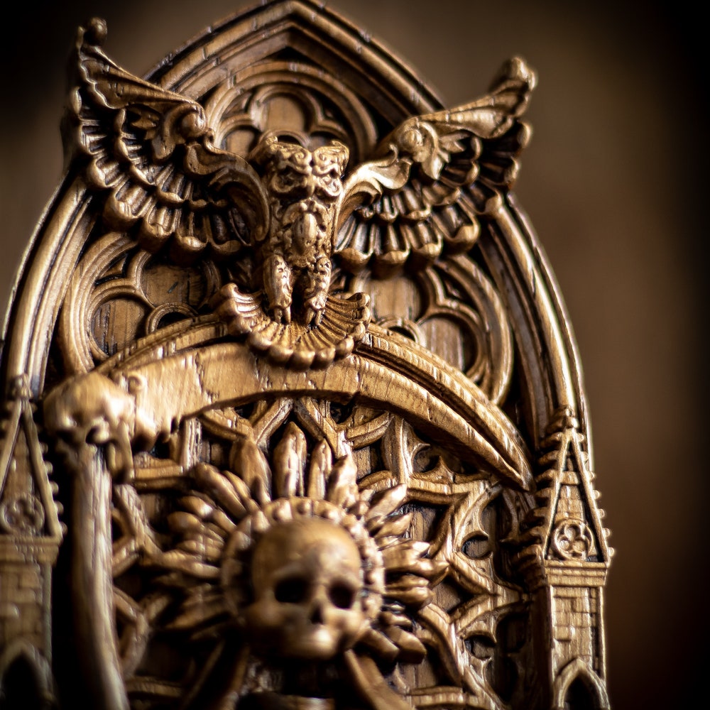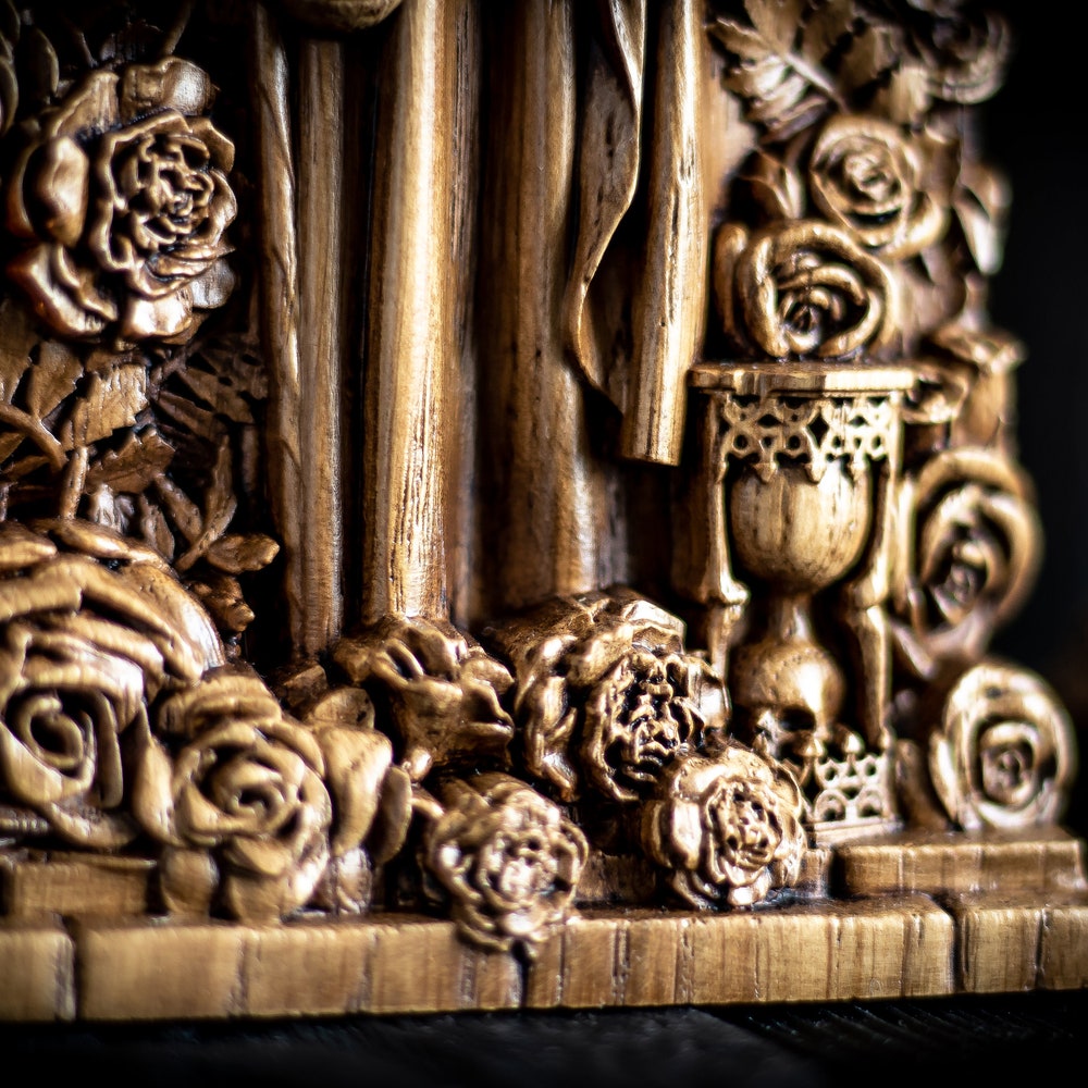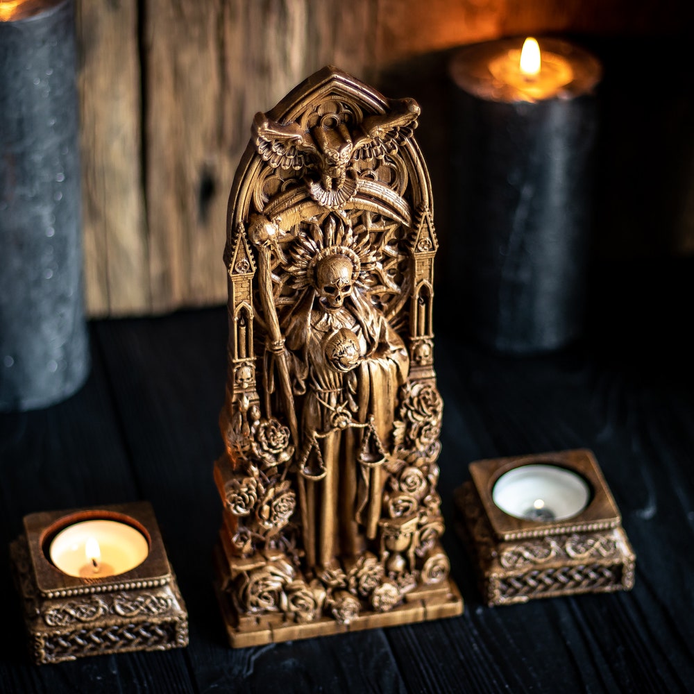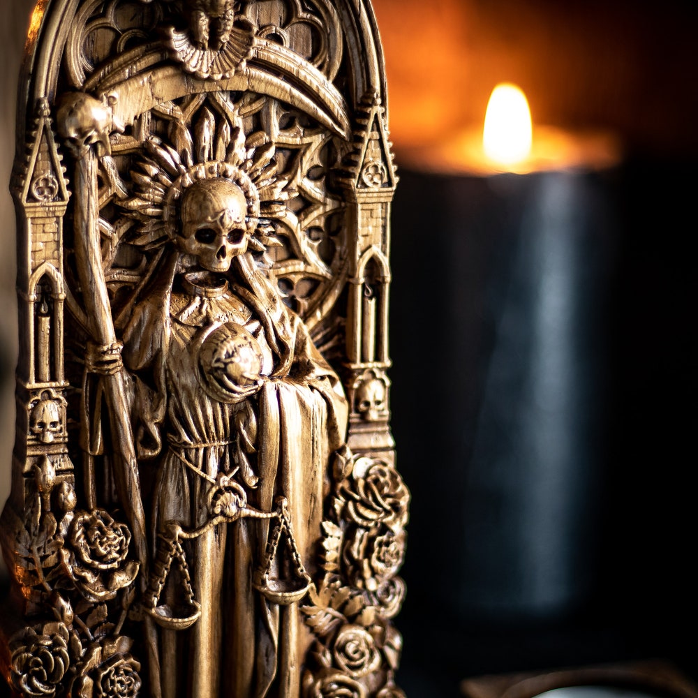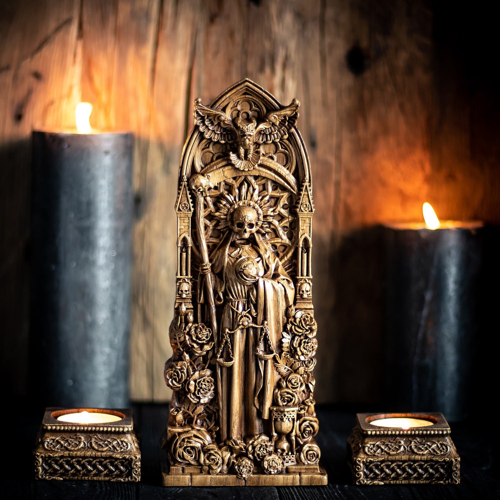 Handmade wooden statuette of Santa Muerte (Holy Death) carved out of oak.