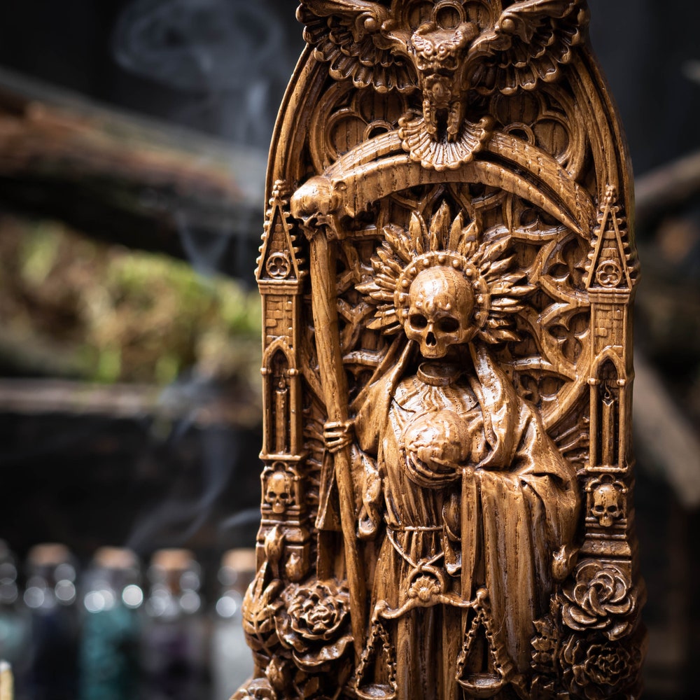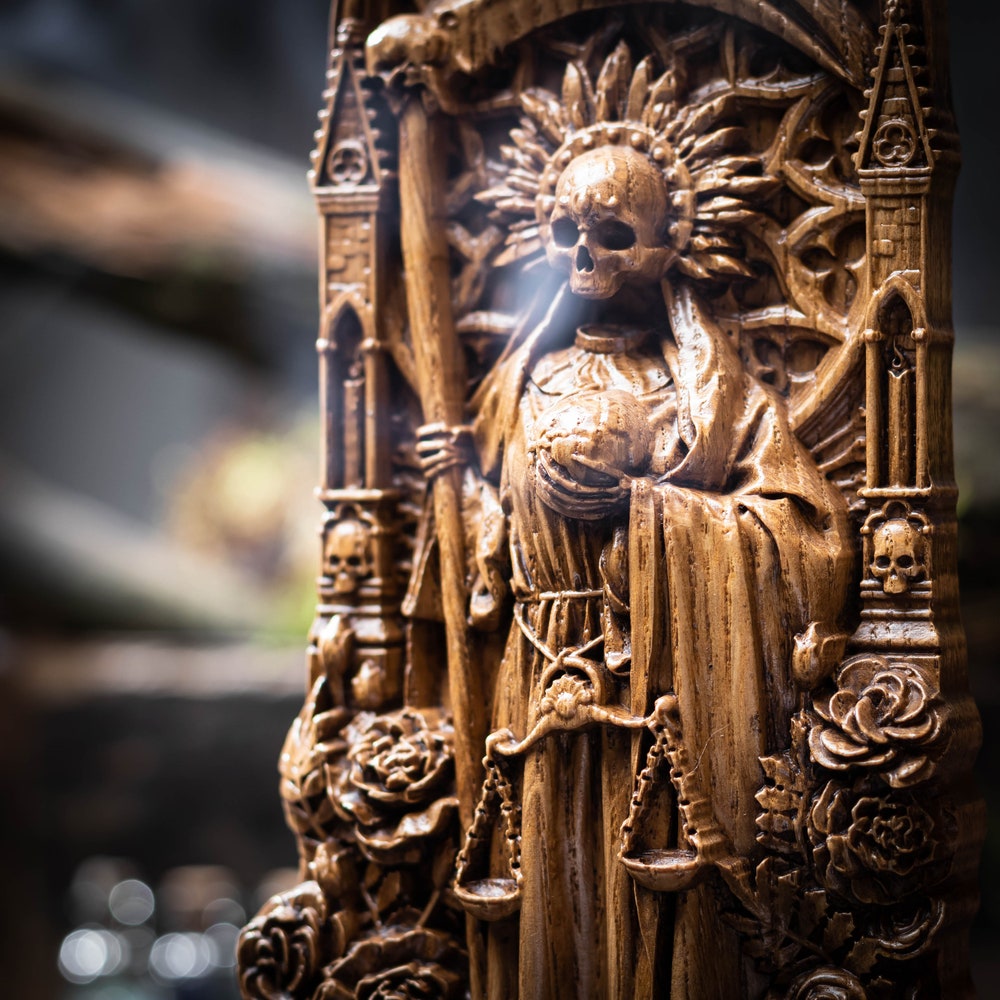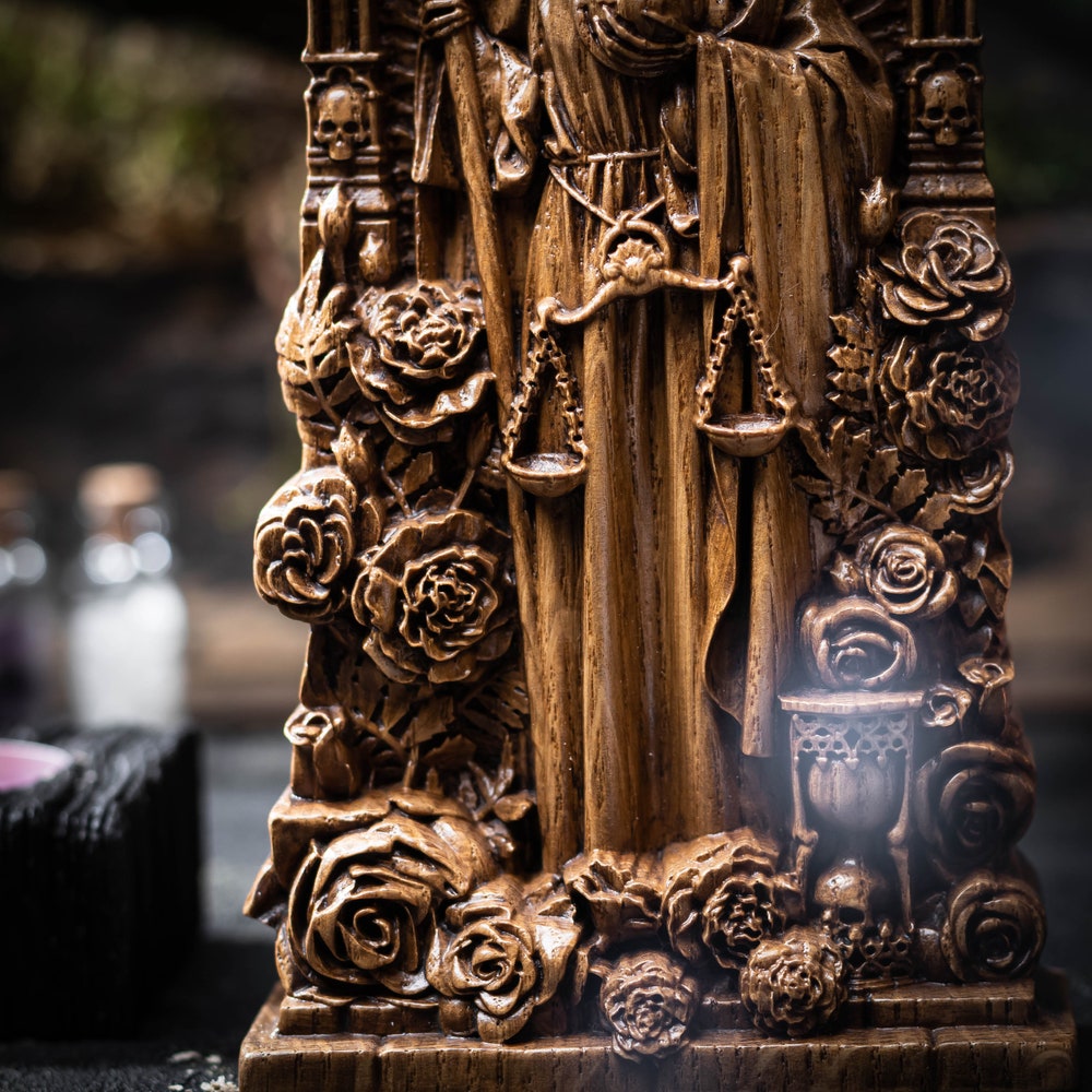Handmade wooden statuette of Santa Muerte (Holy Death) carved out of oak.