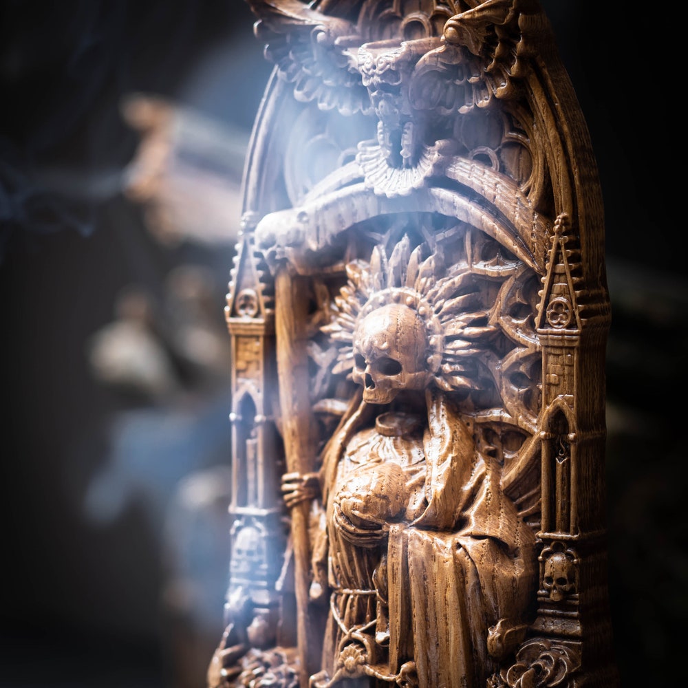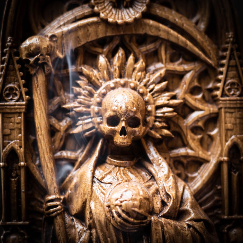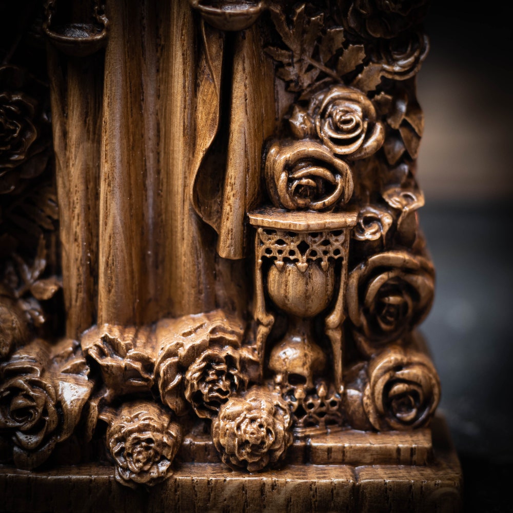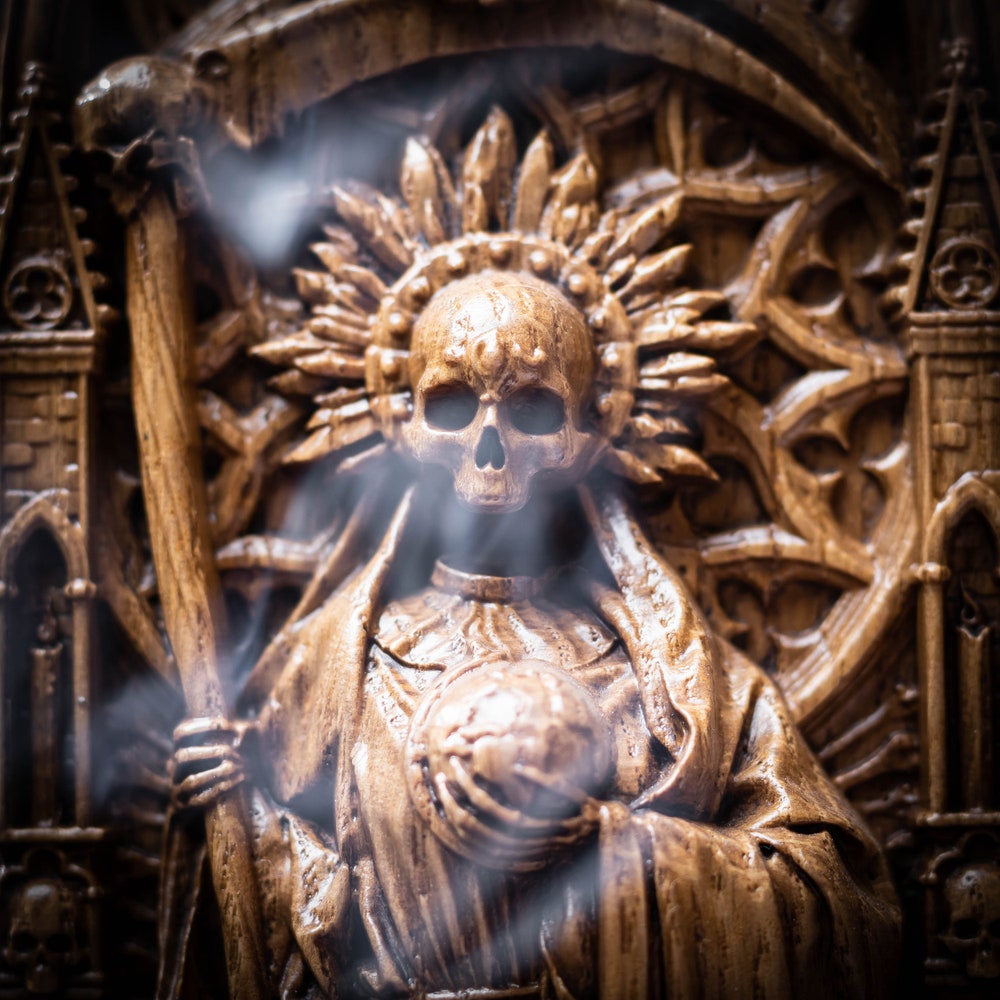 Handmade wooden statuette of Santa Muerte (Holy Death) carved out of oak.