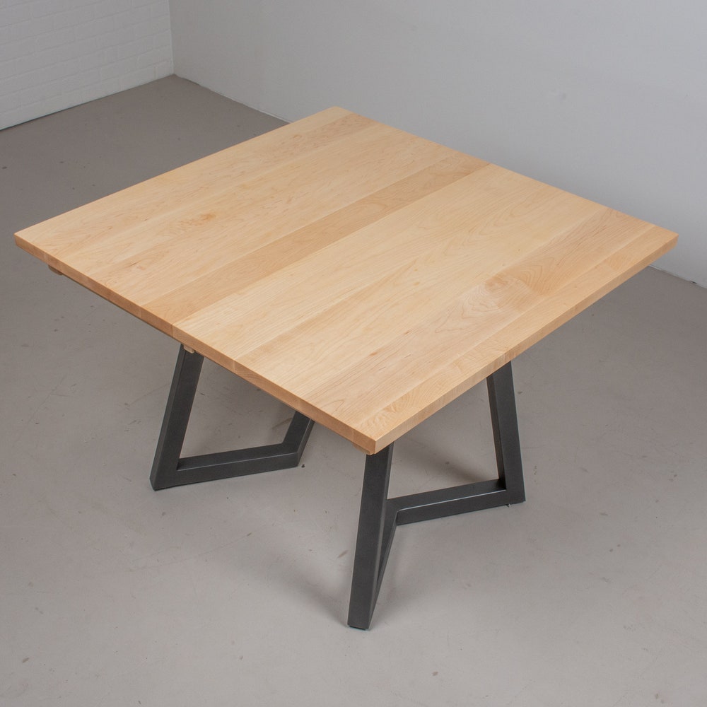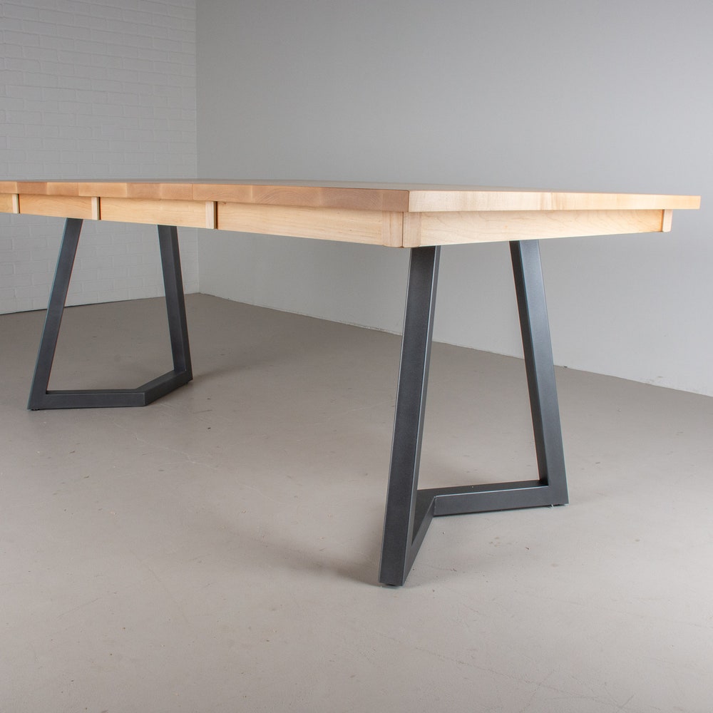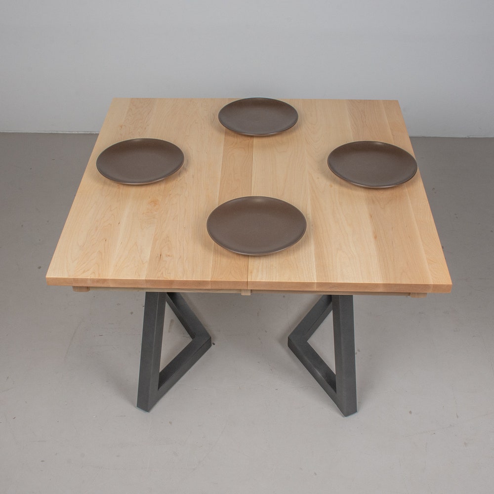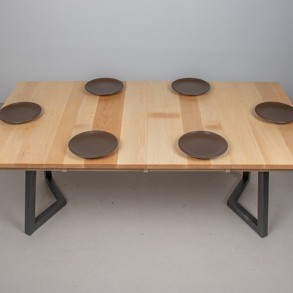 For a minimalist aesthetic, this Scandinavian extending table is a great choice. The top is made of maple with a natural finish and paired with black steel legs. The bonus with this table is that it is an extending table where the leaves are added to the center of the table. We build every table to order so there are many ways to make this table perfect for you.