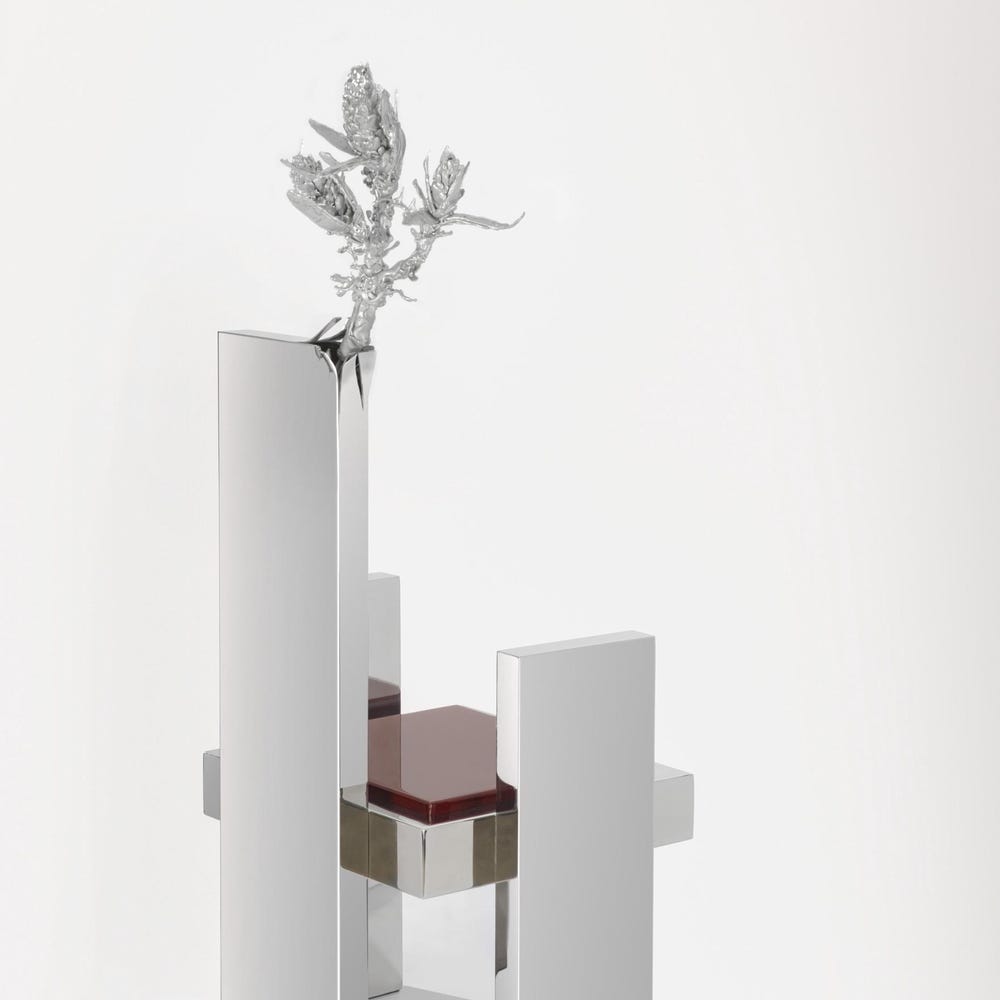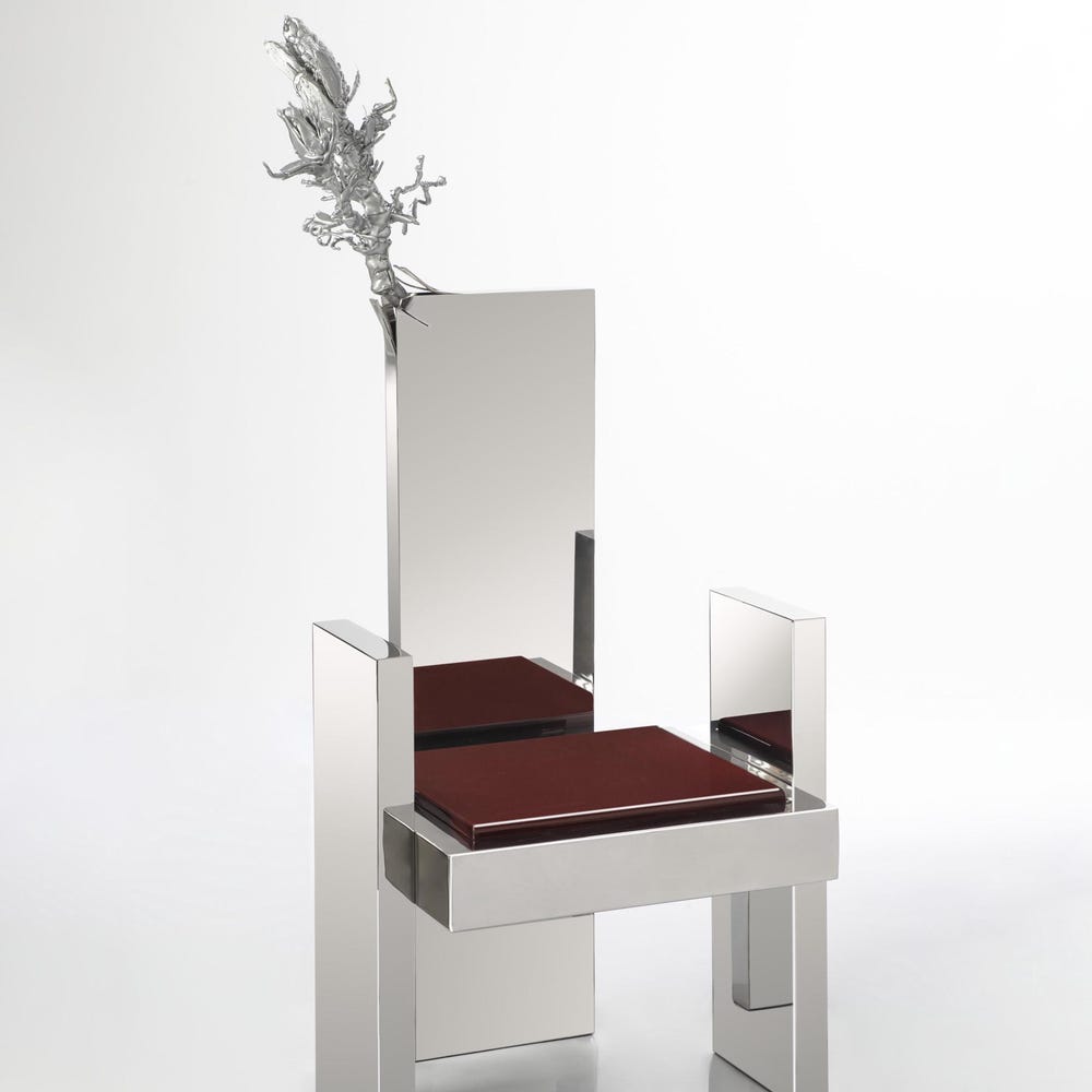 Material: Stainless steel frame, lacquered wood seat, high-gloss resin sculpture (chrome finish)