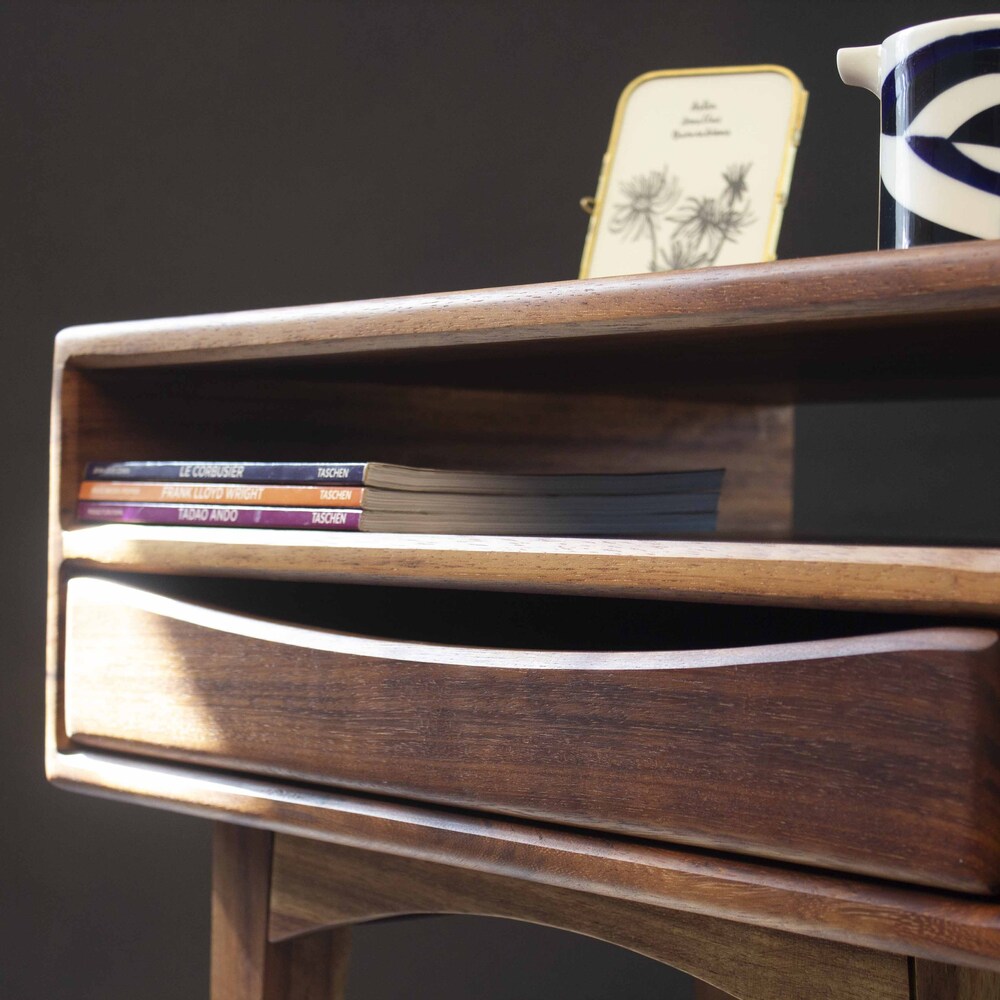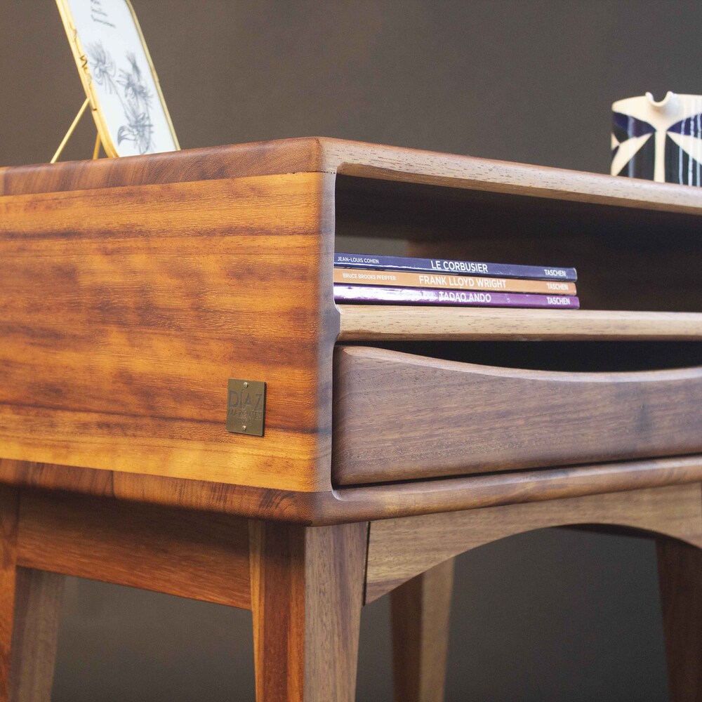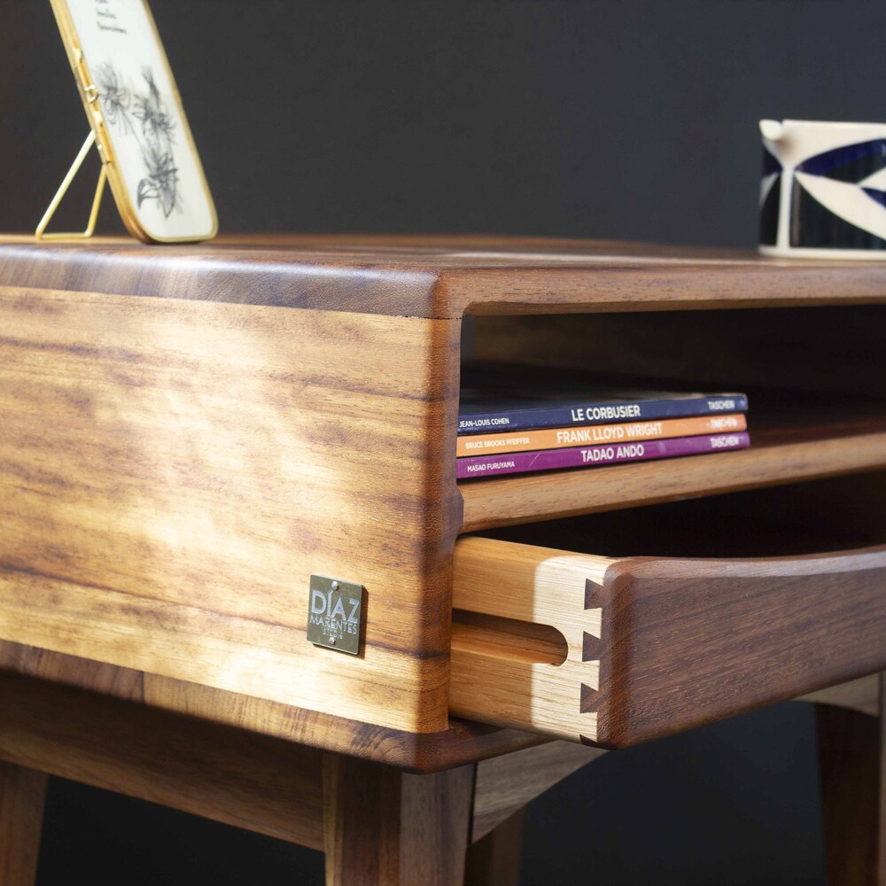 Set of two mid century nightstands fabricated in American Walnut, Tek or Chestnut. DESCRIPTION——————————————-Bedside tables with extrapyramidal legs and one drawer.Made of solid Chestnut, Teak or Walnut wood.Inside the drawers are crafted from chestnut to showcase the dovetail joints, in contrast to another type of wood. DIMENSION OPIONS——————————————-Width: 18 inchesHeight: 23 inches Depth: 14 inches […]