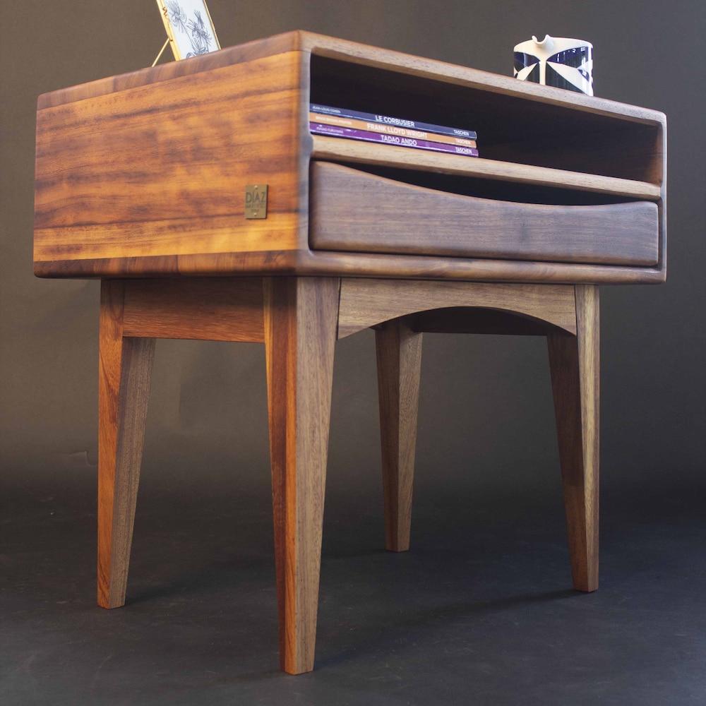 Set of two mid century nightstands fabricated in American Walnut, Tek or Chestnut.