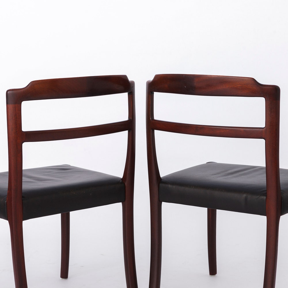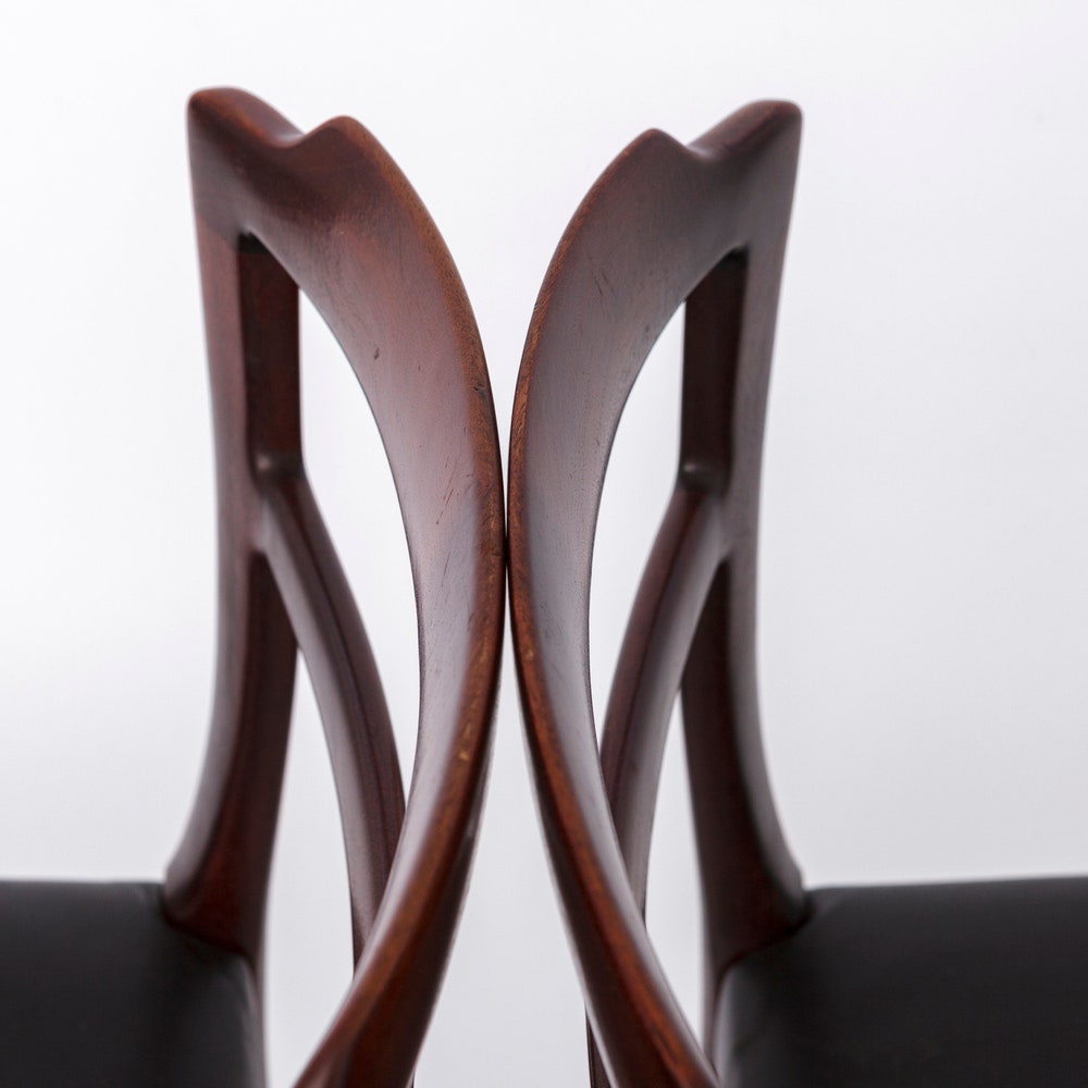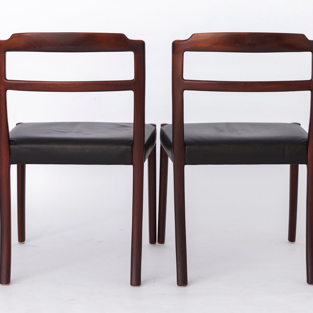 Elevate your dining experience with this elegant set of 4 dining chairs designed by Ole Wanscher, crafted in Denmark during the 1960s. These timeless chairs feature sturdy rosewood frames, refurbished to highlight their natural beauty, paired with original black leather seat covers for a touch of sophistication.