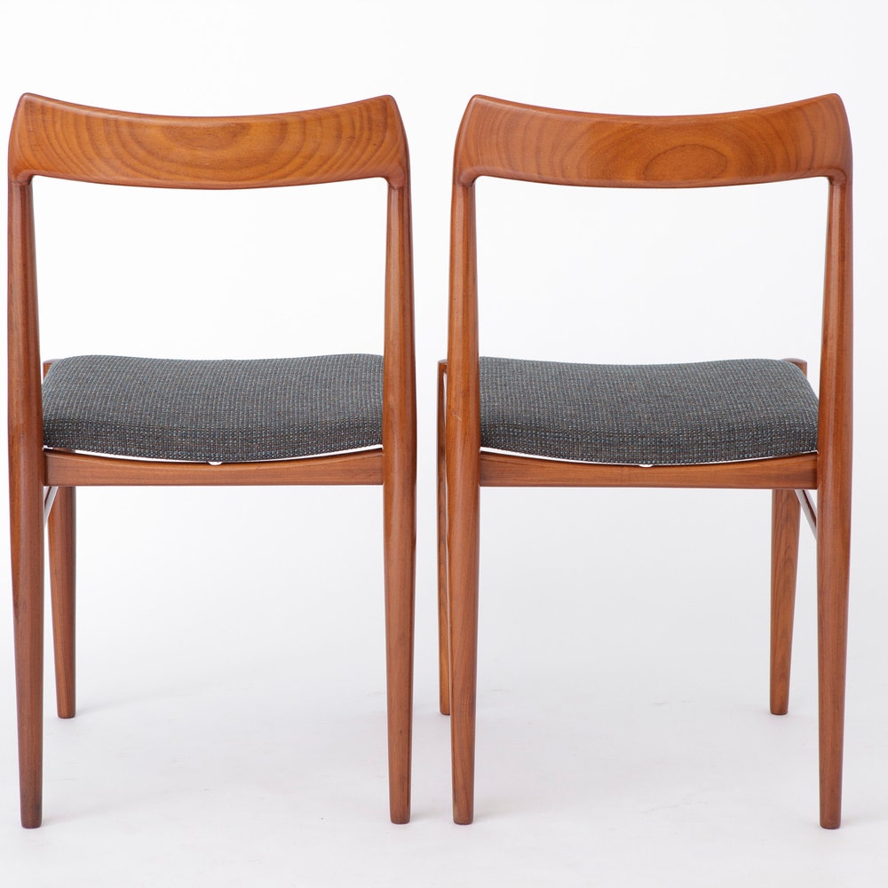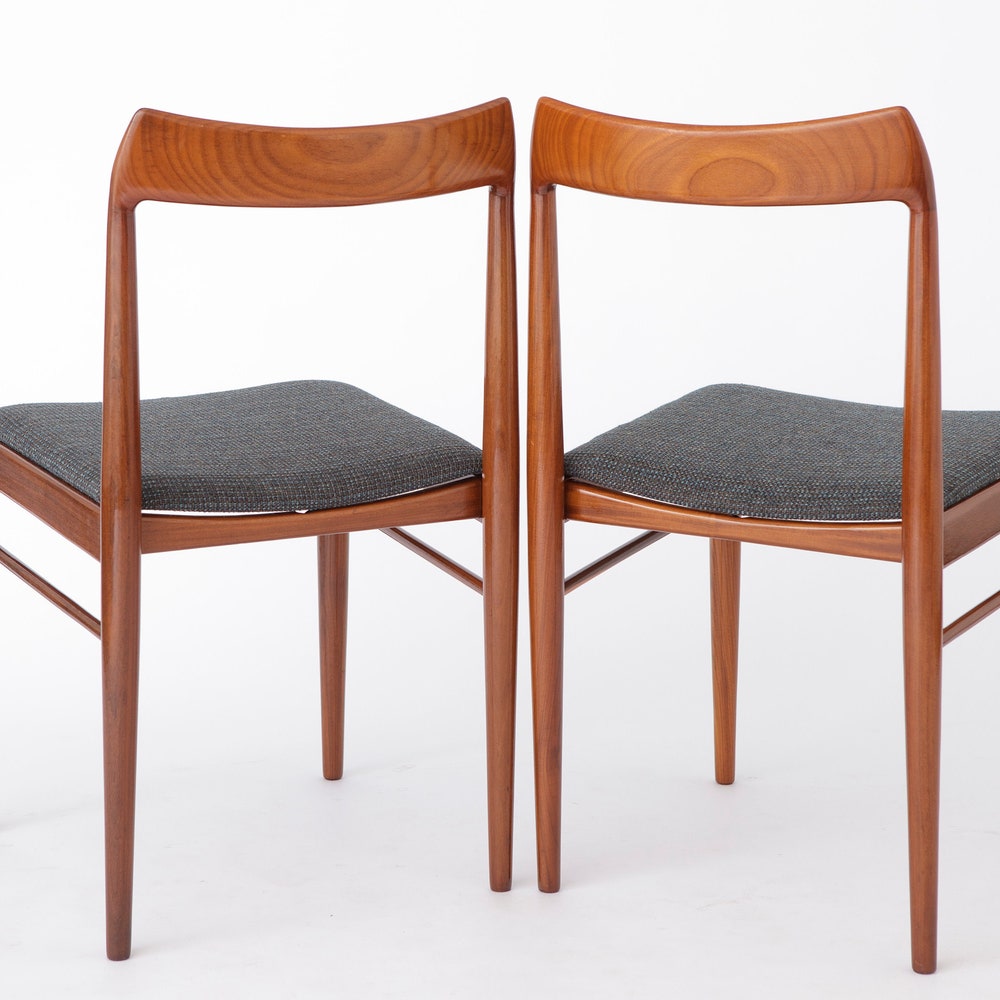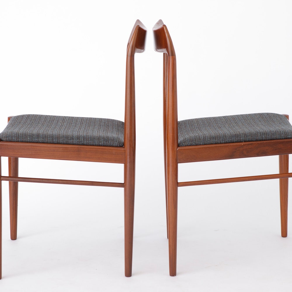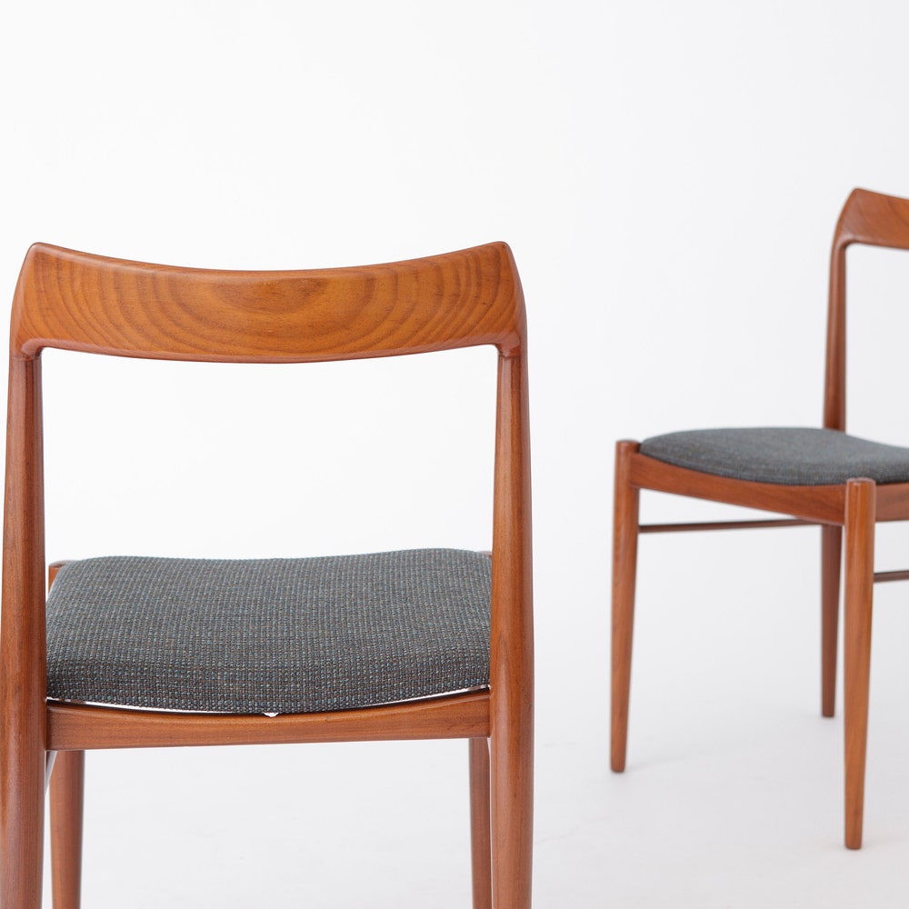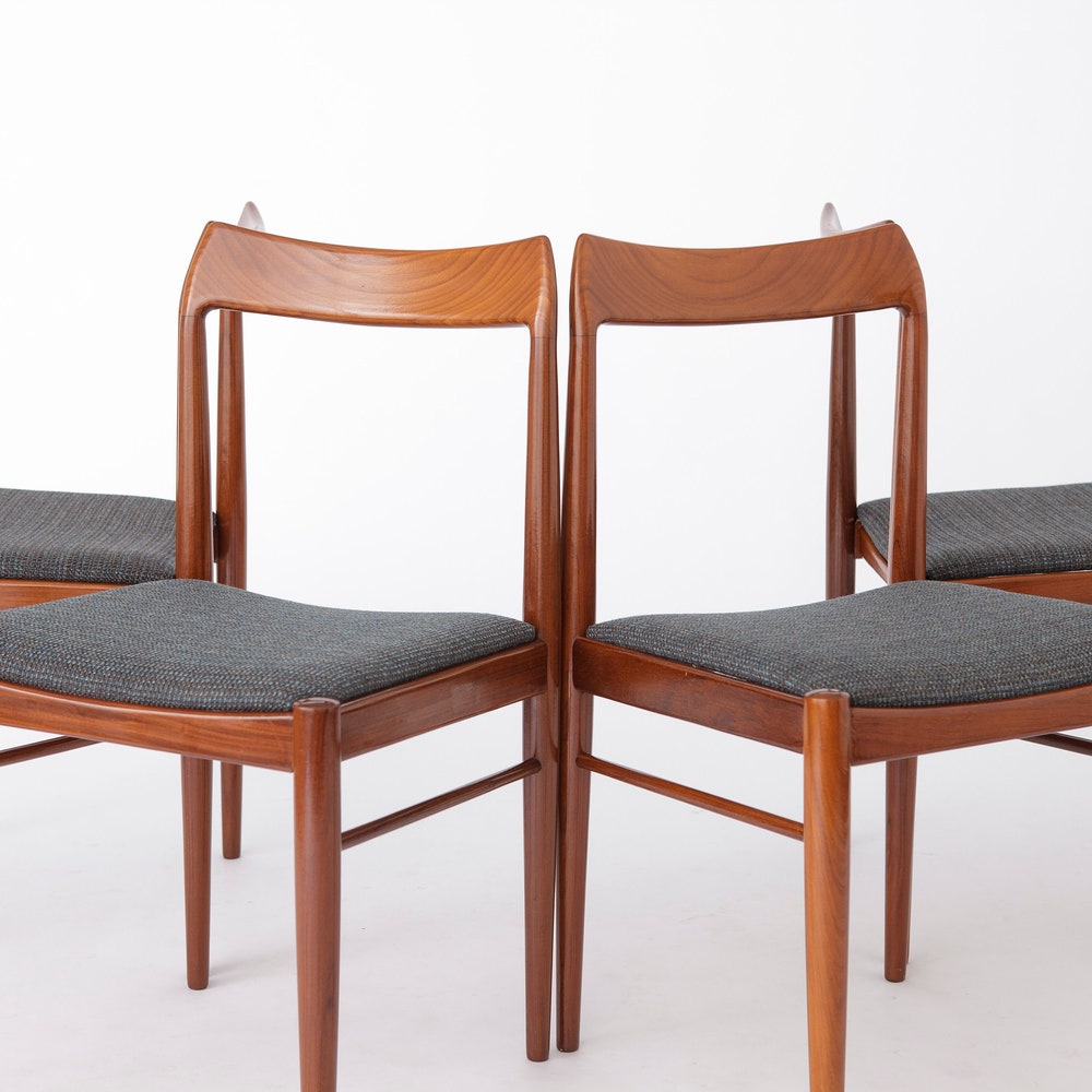 Add a touch of mid-century modern charm to your dining area with this stunning set of four teak dining chairs. Likely originating from Germany, these chairs feature sturdy teak wood frames that have been carefully refurbished and oiled to highlight their natural beauty. The light gray textile covers offer a fresh, contemporary update to their classic design, making them a perfect blend of old and new.