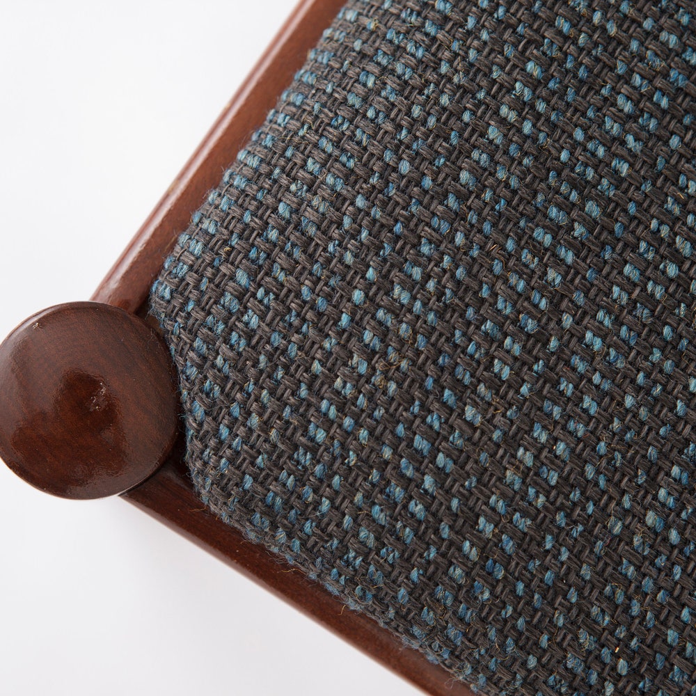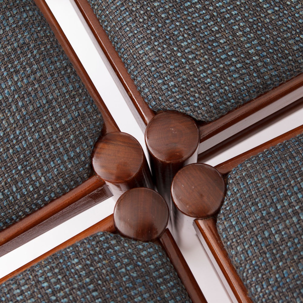 Upholstery: Light gray textile covers, providing a soft and modern contrast to the rich wood tones.