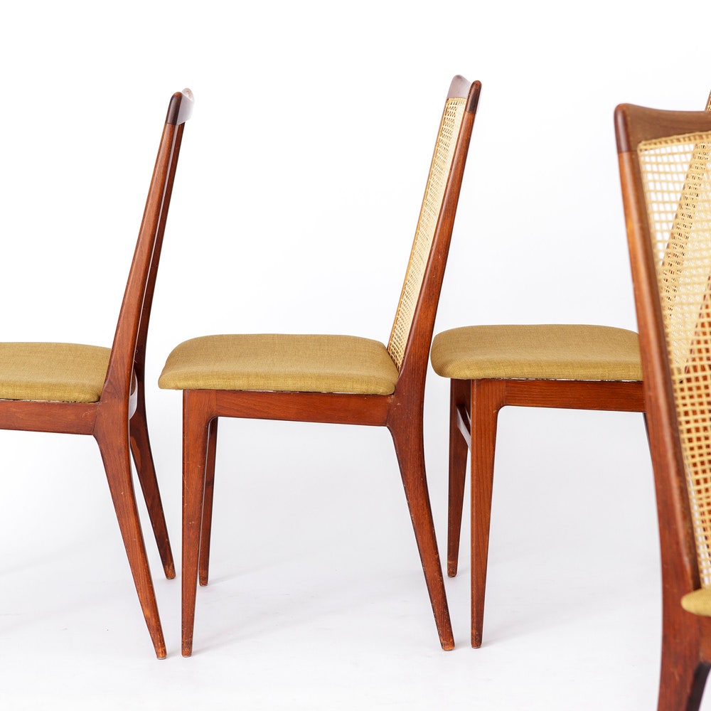 Condition: Good vintage condition with a stable stand and only minor signs of use. The seats have been reupholstered in a mustard-colored textile for a fresh look, while the wickerwork on the chair backs has been renewed.