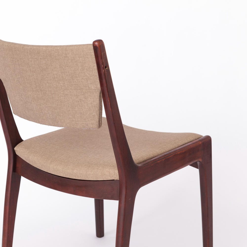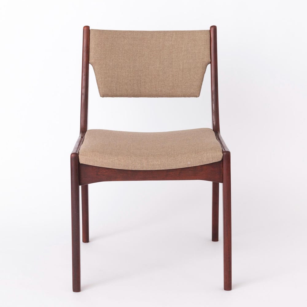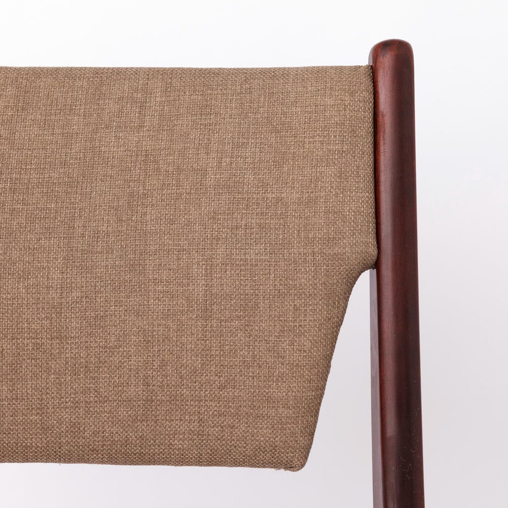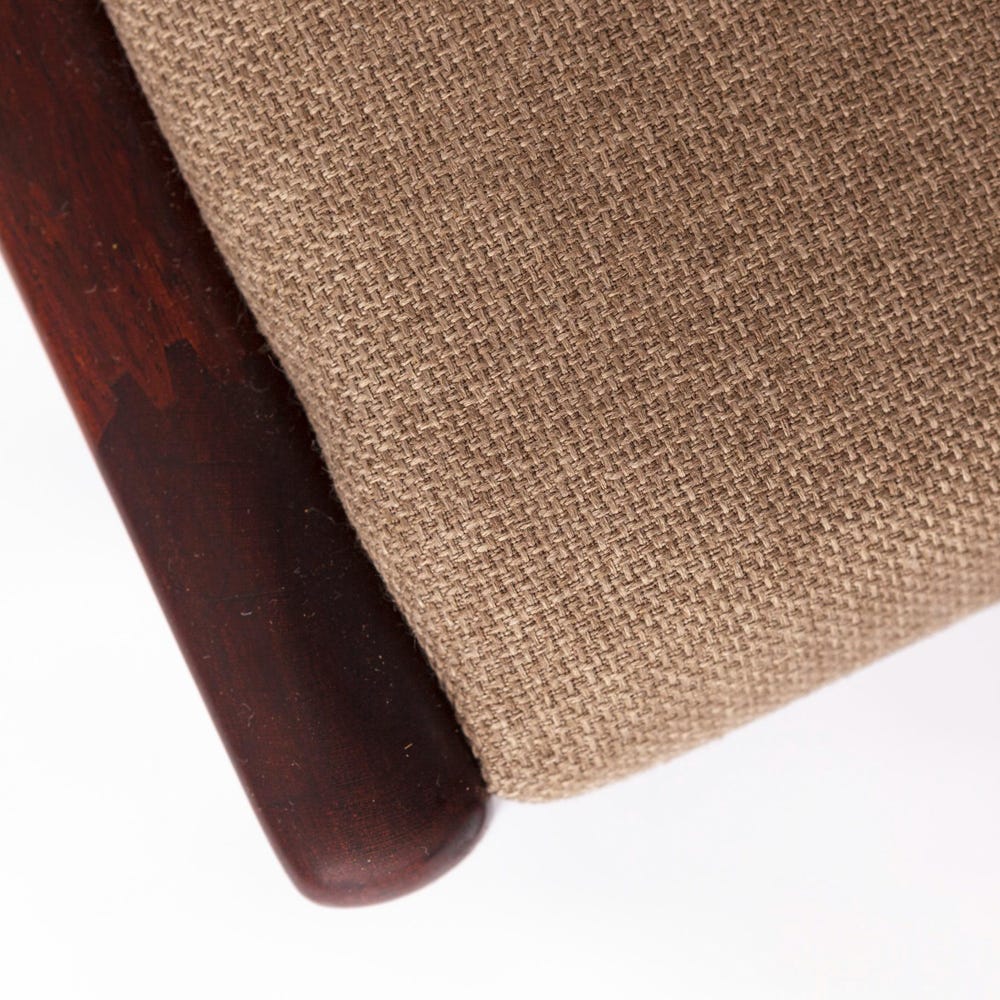 Both the seat and backrest have been reupholstered in an elegant light brown textile, blending perfectly with the warm teak wood.