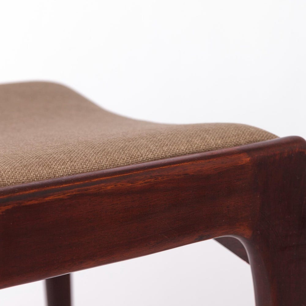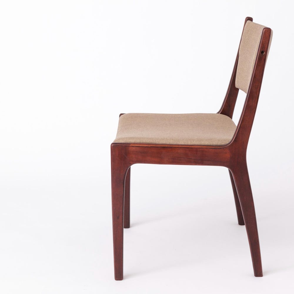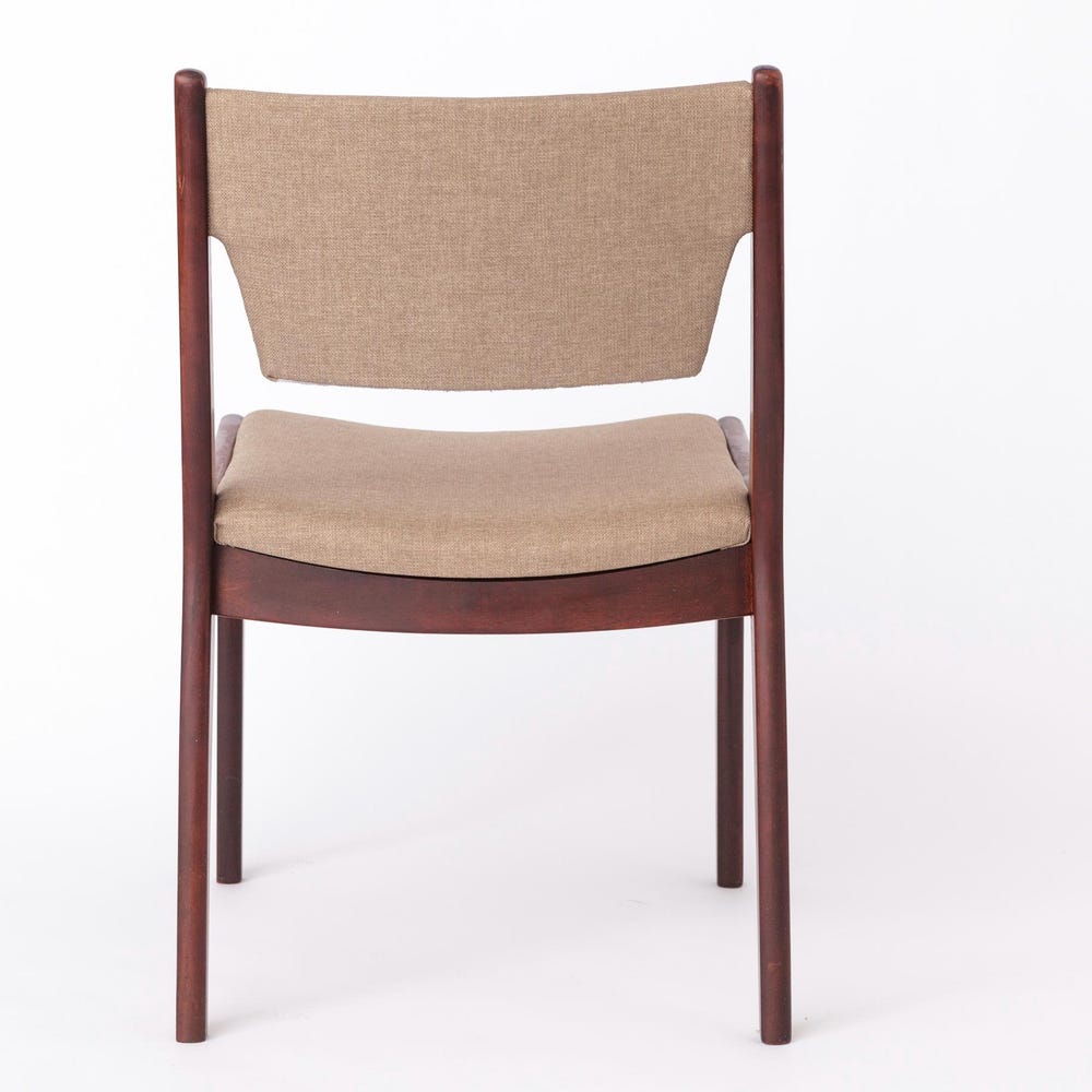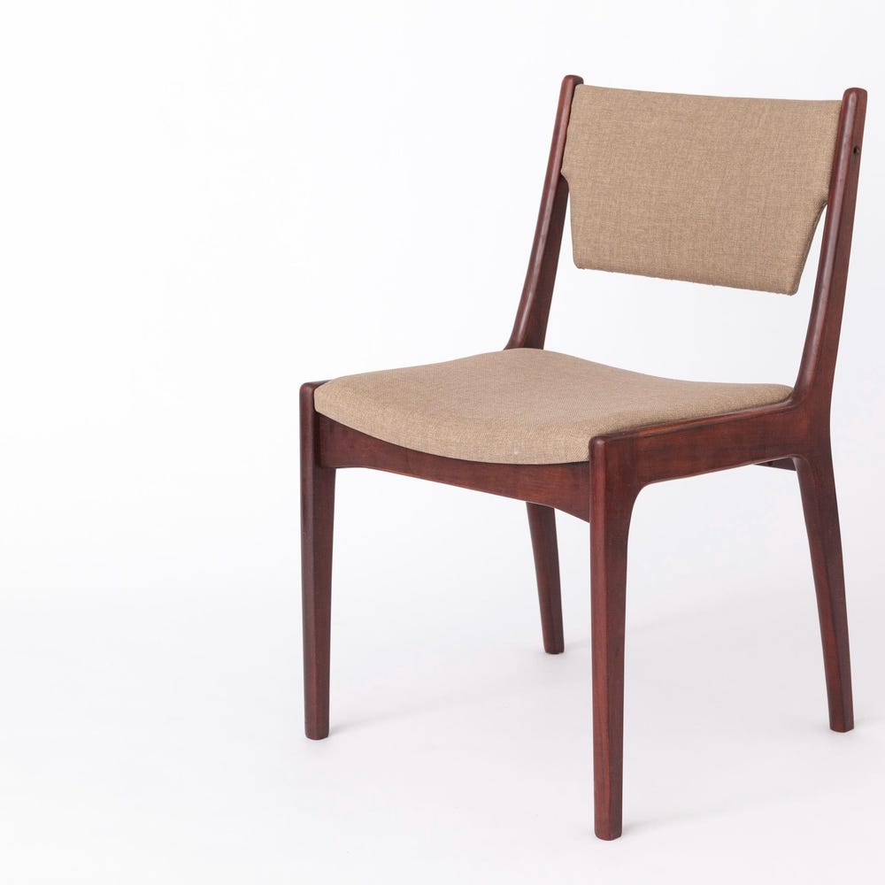 Both the seat and backrest have been reupholstered in an elegant light brown textile, blending perfectly with the warm teak wood.