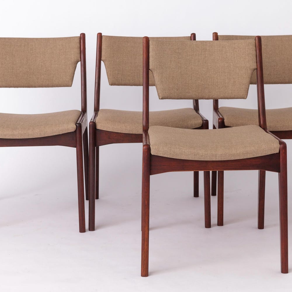 Enhance your space with this unique set of four vintage chairs, featuring a wide backrest for extra comfort. With a solid teak wood frame, these chairs have been carefully refurbished and oiled, preserving their timeless beauty.