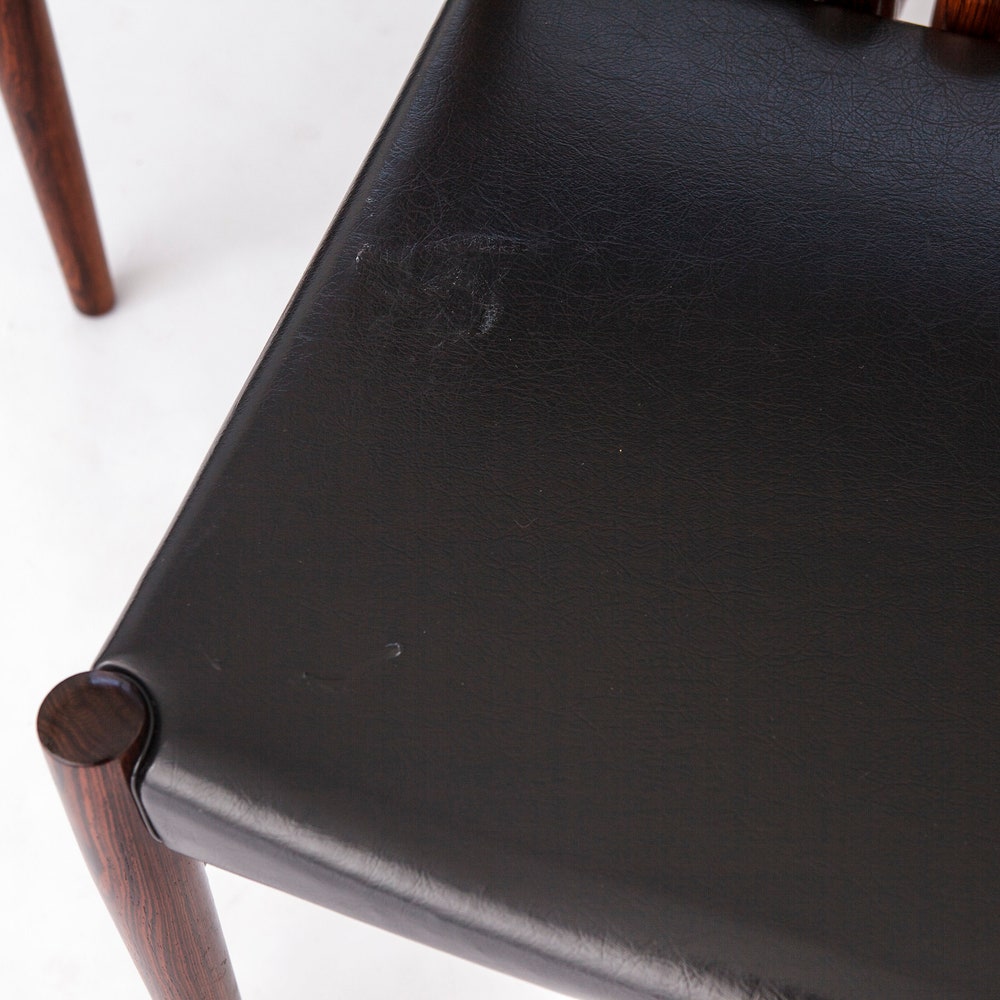 This set of 6 dining chairs by renowned Danish designer Grete Jalk showcases the elegance of 1960s Danish design. Crafted with sturdy rosewood frames, these chairs maintain their structural integrity while offering a timeless aesthetic. The original black leather covers are in very good condition, with only minimal signs of use, reflecting the quality craftsmanship of the era.
