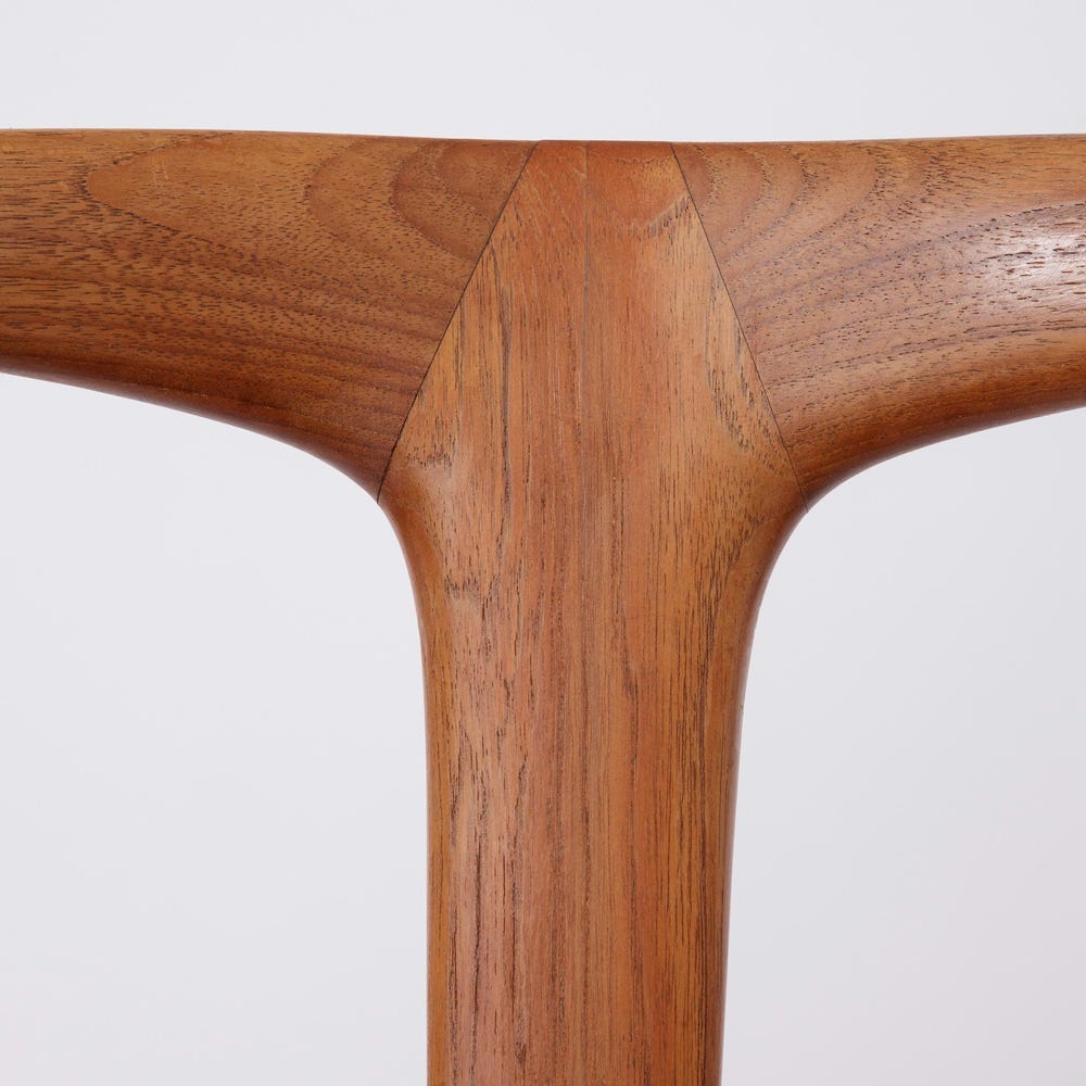 Each chair features a solid teak wood frame, carefully refurbished and oiled to bring out the richness of the wood. The seats have been newly reupholstered in soft black velvet, combining mid-century design with contemporary comfort.