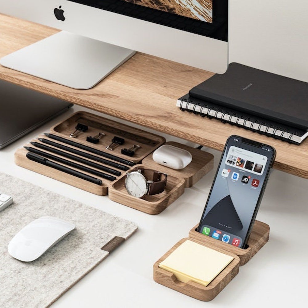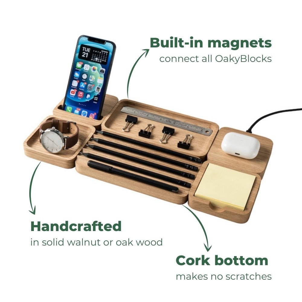 This perfect set of 6 desk organizers will support and display your device, and add some natural beauty to your space. Mix and match OakyBlocks modules, and create your perfect, ultimately optimised desk setup!