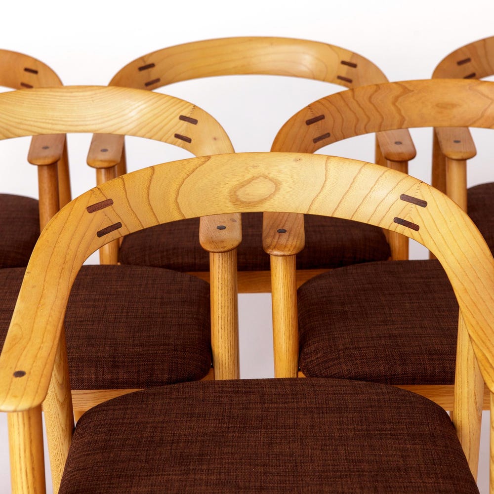 A beautiful and unique set of six vintage dining chairs from the 1970s. While the exact manufacturer remains unidentified, they likely originate from Denmark or Sweden, showcasing elegant design details and dark wood inlays. To enhance their aesthetic appeal, we have selected brown seat cushions that perfectly complement the inlays.