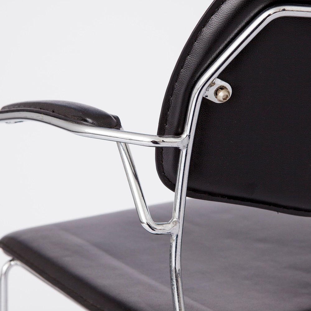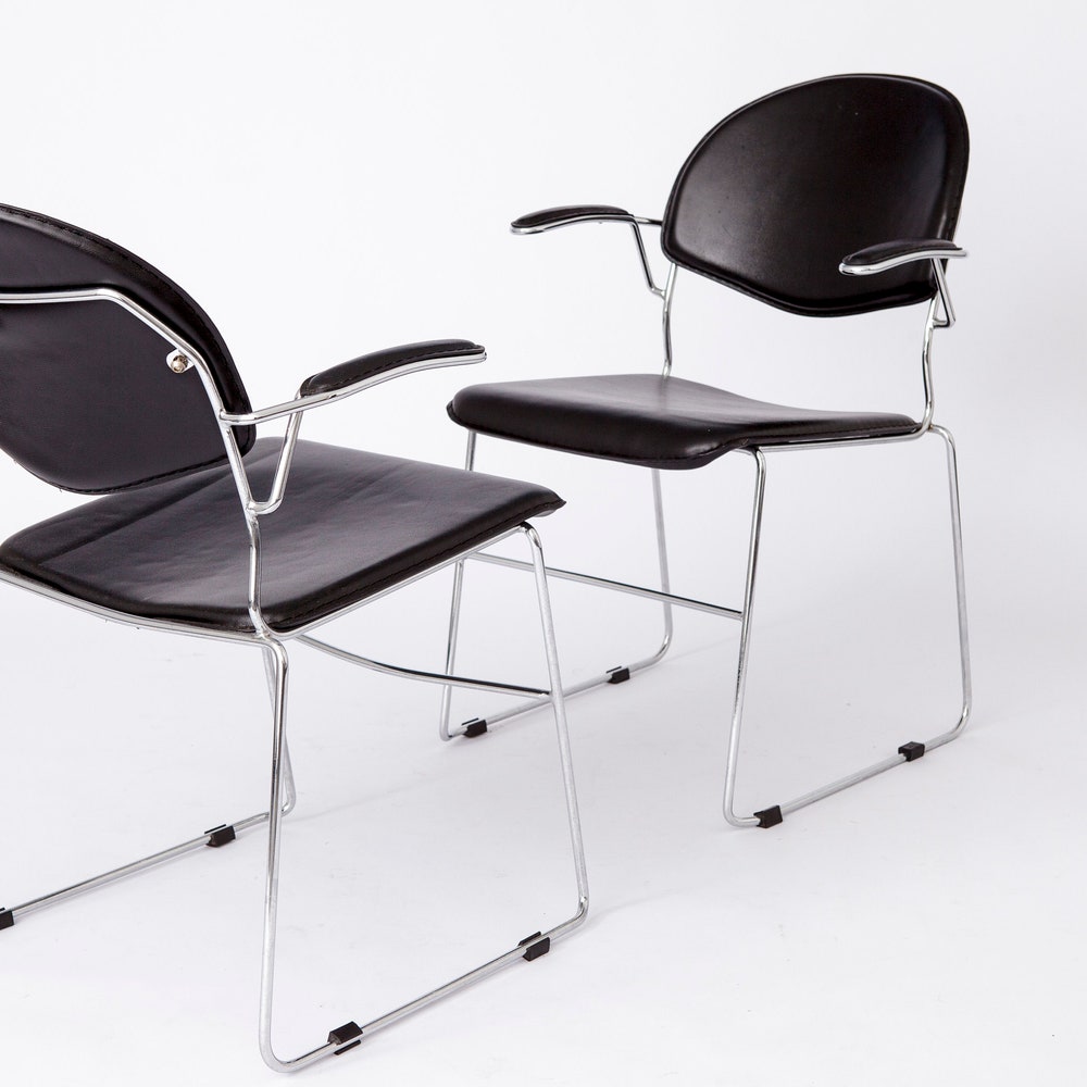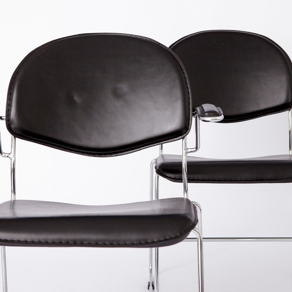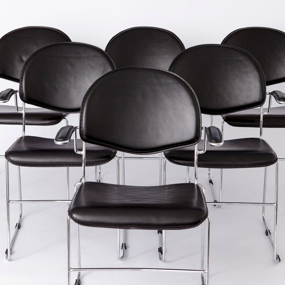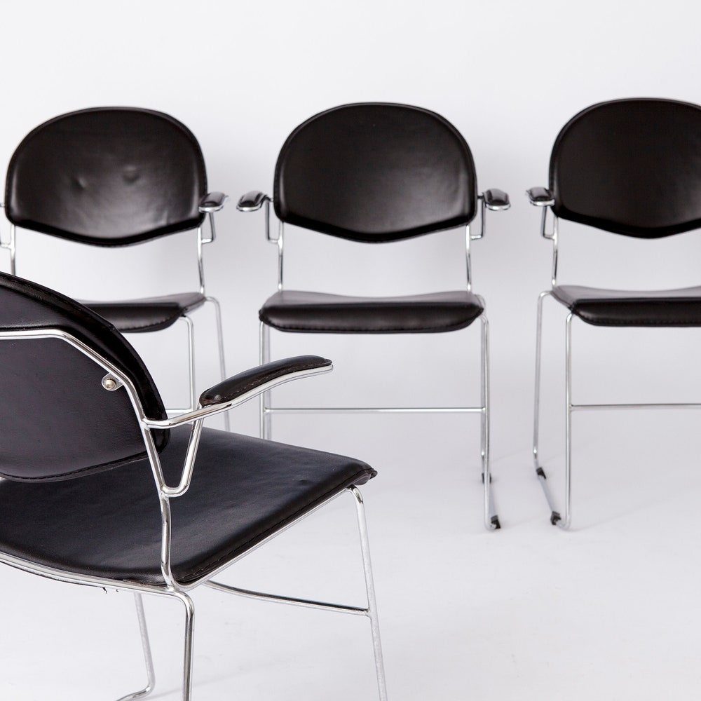Set of 6 Vintage Stackable Chairs – Metal Frame, Black Leather, Minor Signs of Use, Up to 10 Available