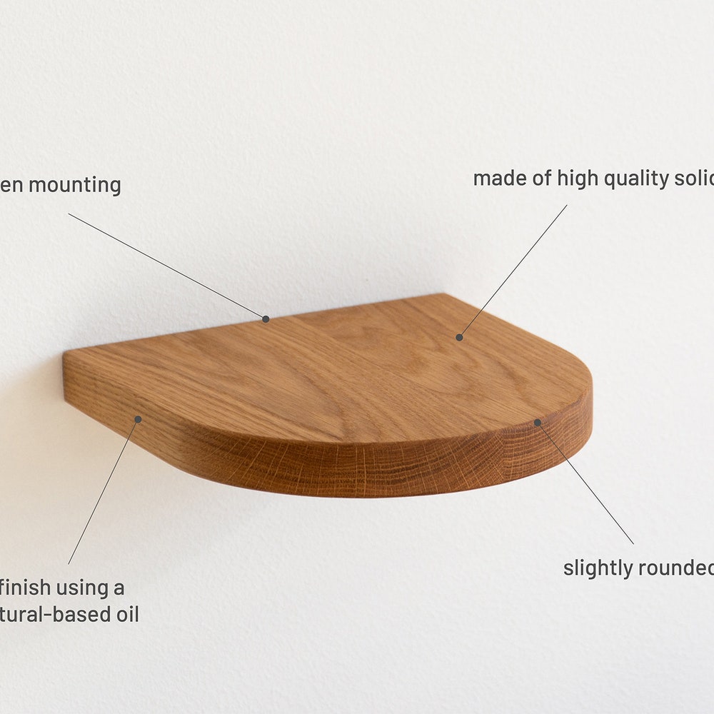Where to use this floating shelf? Mount it as a bedside shelf, kitchen storage, bathroom furniture or in any other room where you appreciate the arch shape combined with practical, space-saver storage. Each piece is unique, as these shelves are made of solid wood (top-grade, hand-selected wood material).
