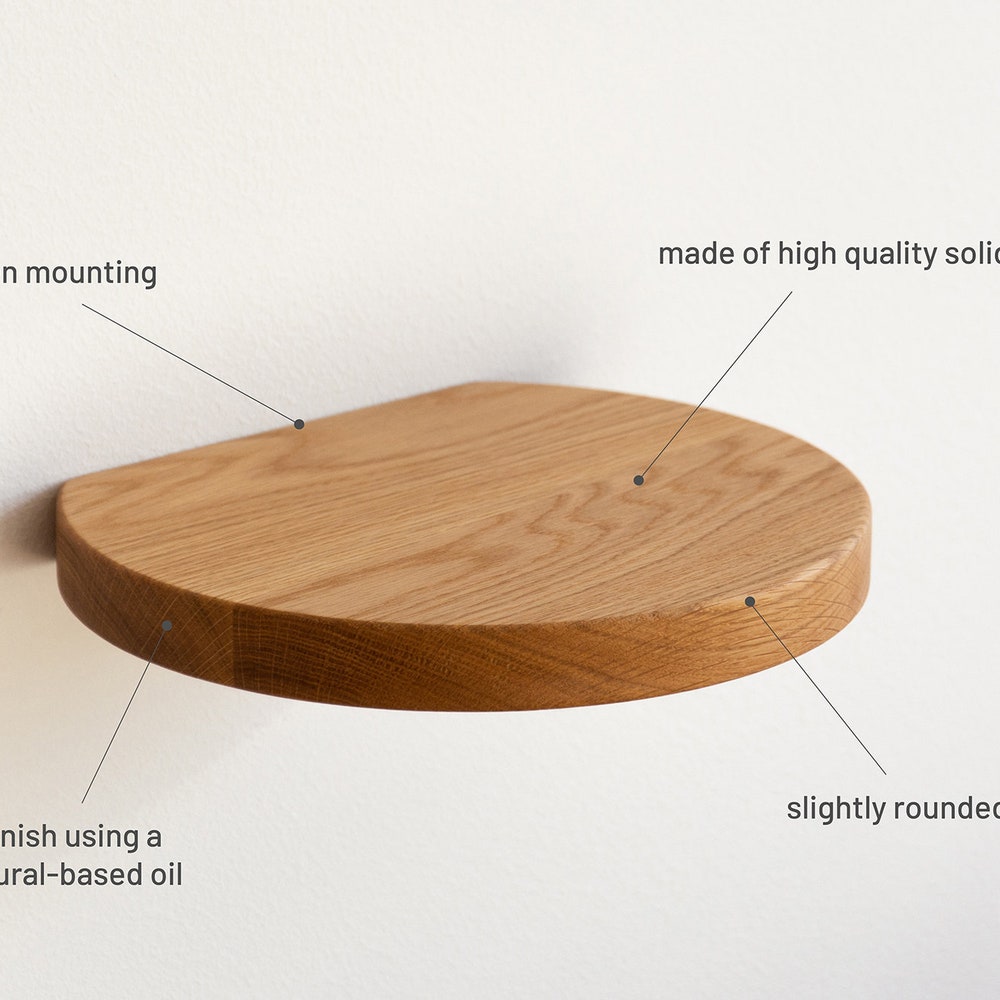 Where to use this floating shelf? Mount it as a bedside shelf, kitchen storage, bathroom furniture or in any other room where you appreciate the arch shape combined with practical, space-saver storage. Each piece is unique, as these shelves are made of solid wood (top-grade, hand-selected wood material).