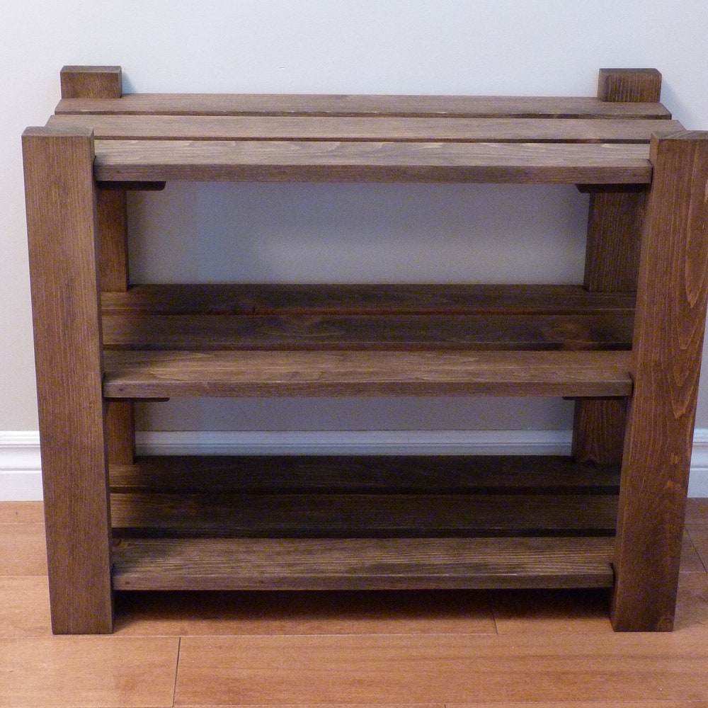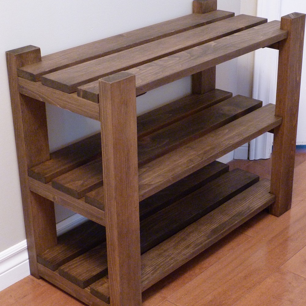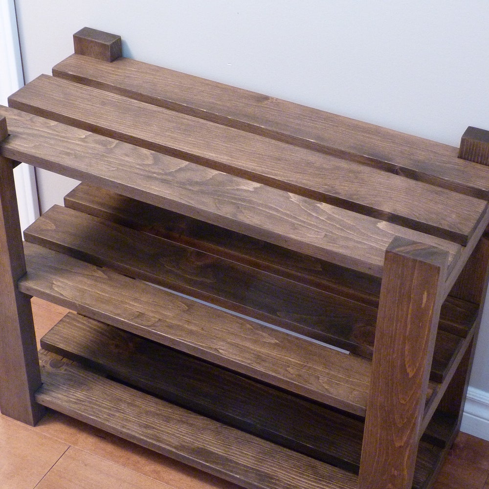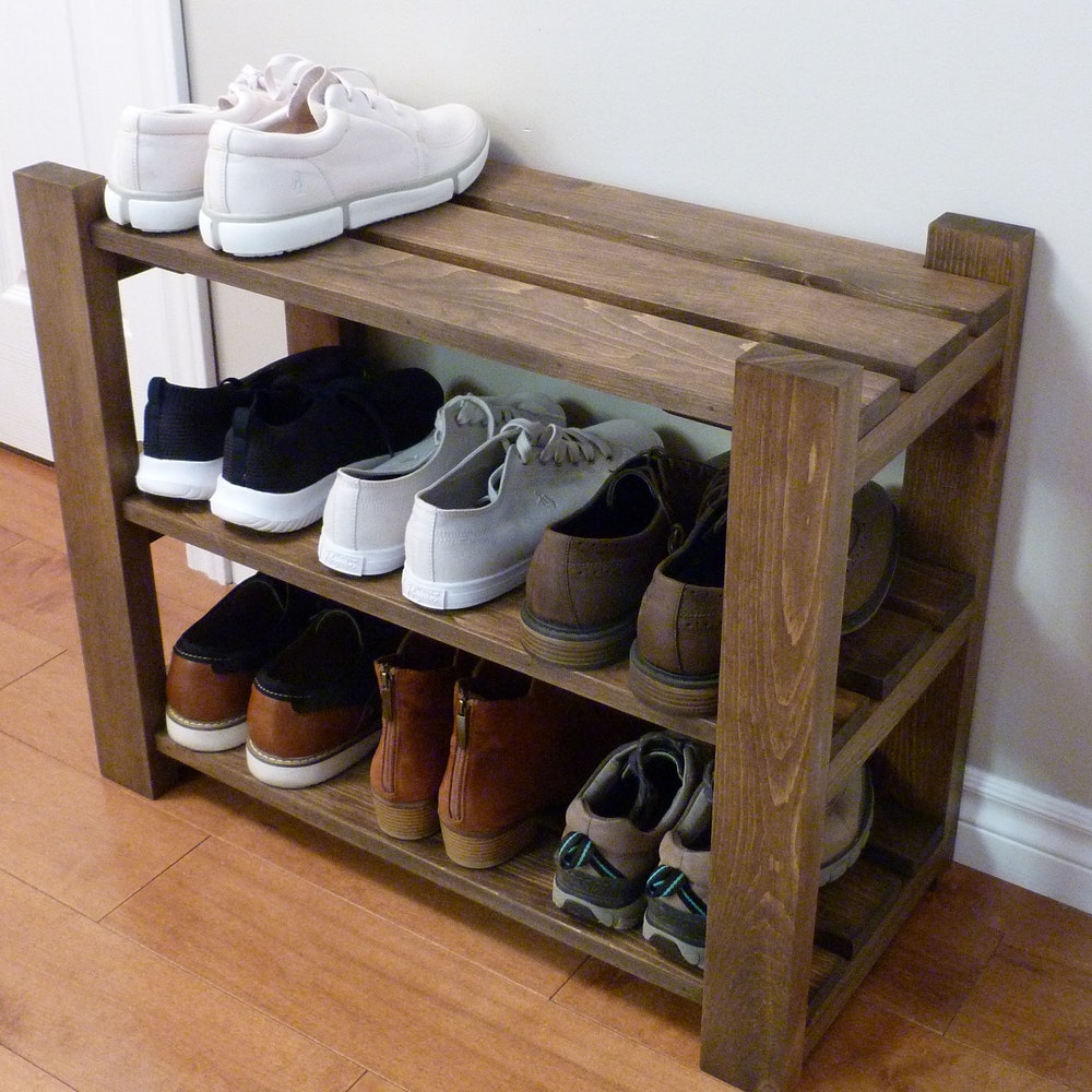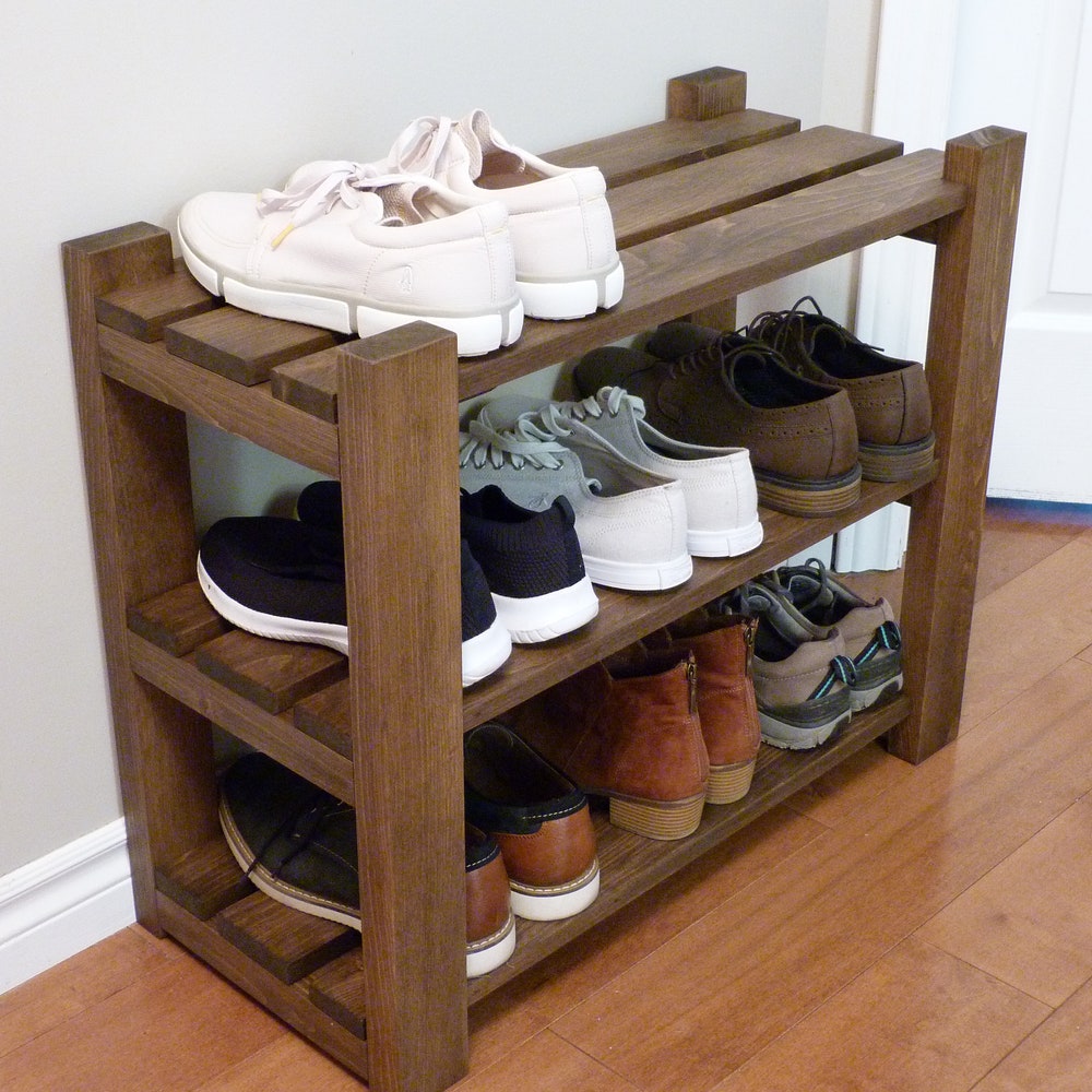 Made of solid pine, stained and sealed with a beautiful finish, this shoe rack comes with 3 levels that can be purchased in length ranging from 24 to 42 inches.