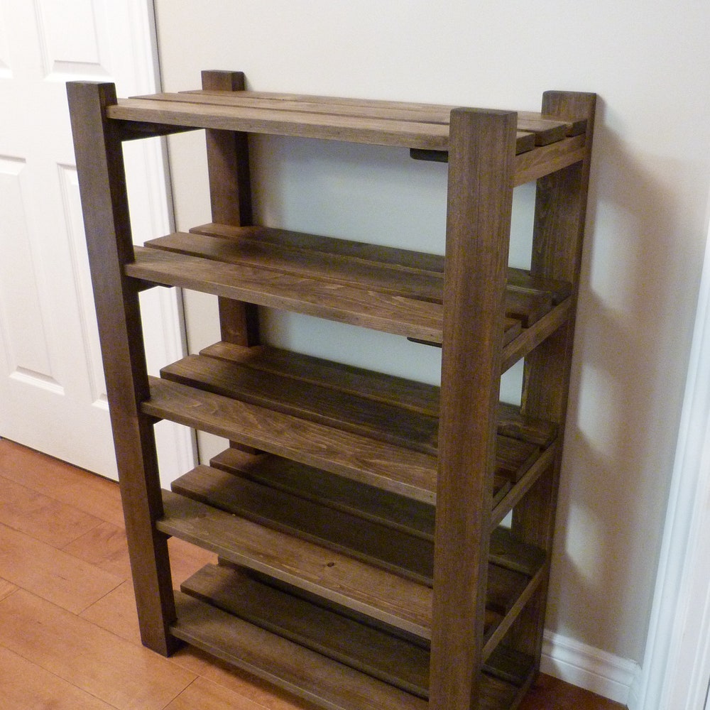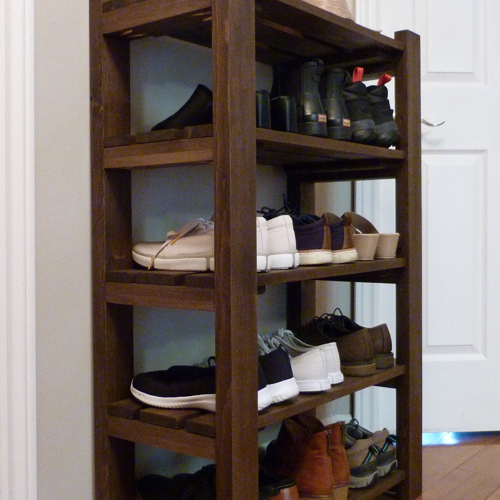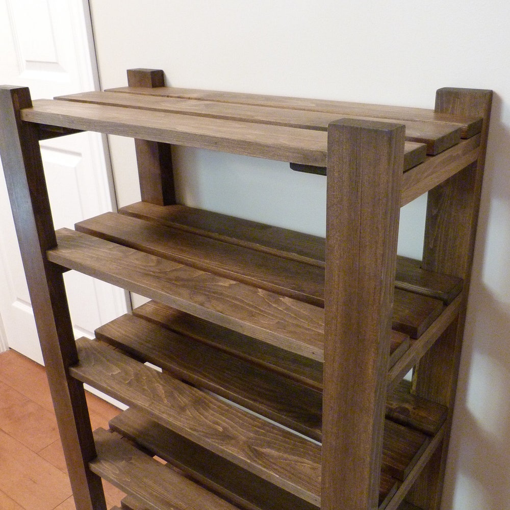 Made of solid pine, stained and sealed with a beautiful finish, this shoe rack comes with 5 levels that can be purchased in length ranging from 24 to 42 inches.