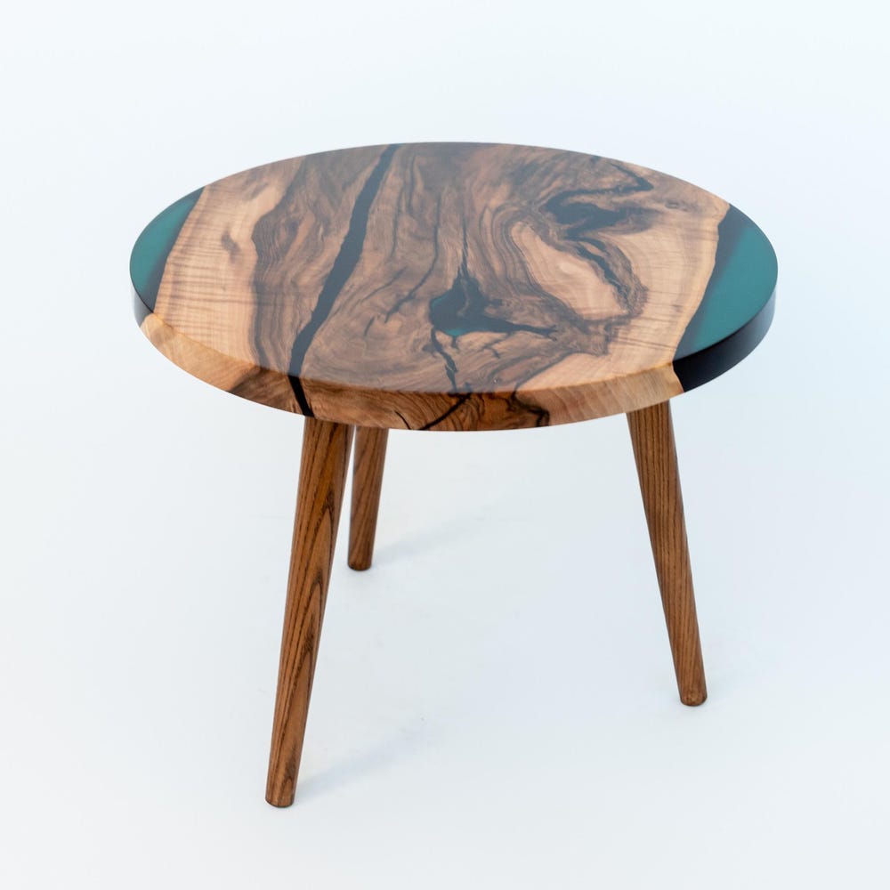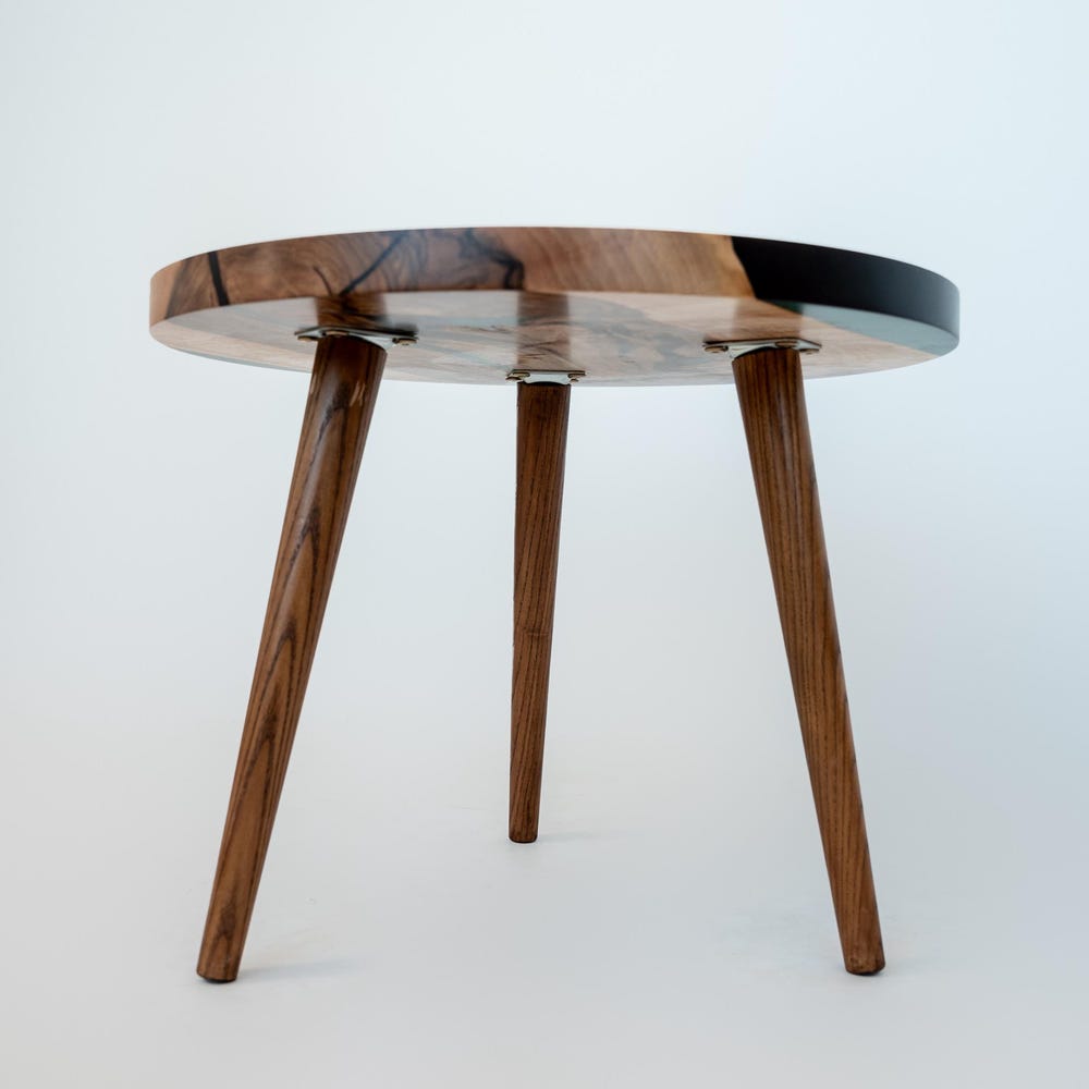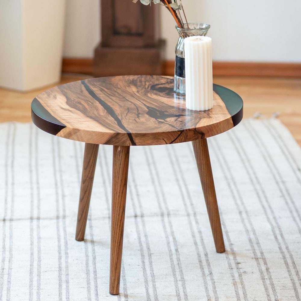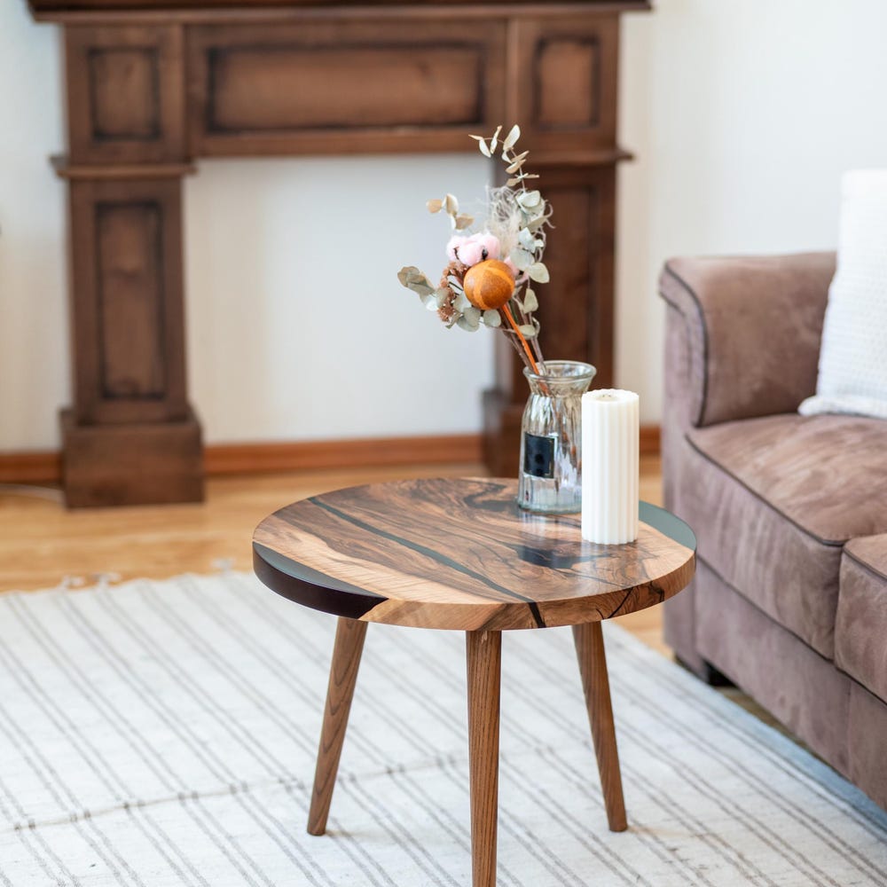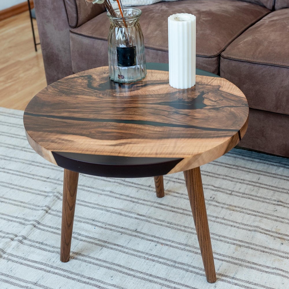 Side Table, Epoxy Resin Coffee Table, Round Walnut Coffee Table, Farmhouse Sofa Table, Black Mid Century Modern Table