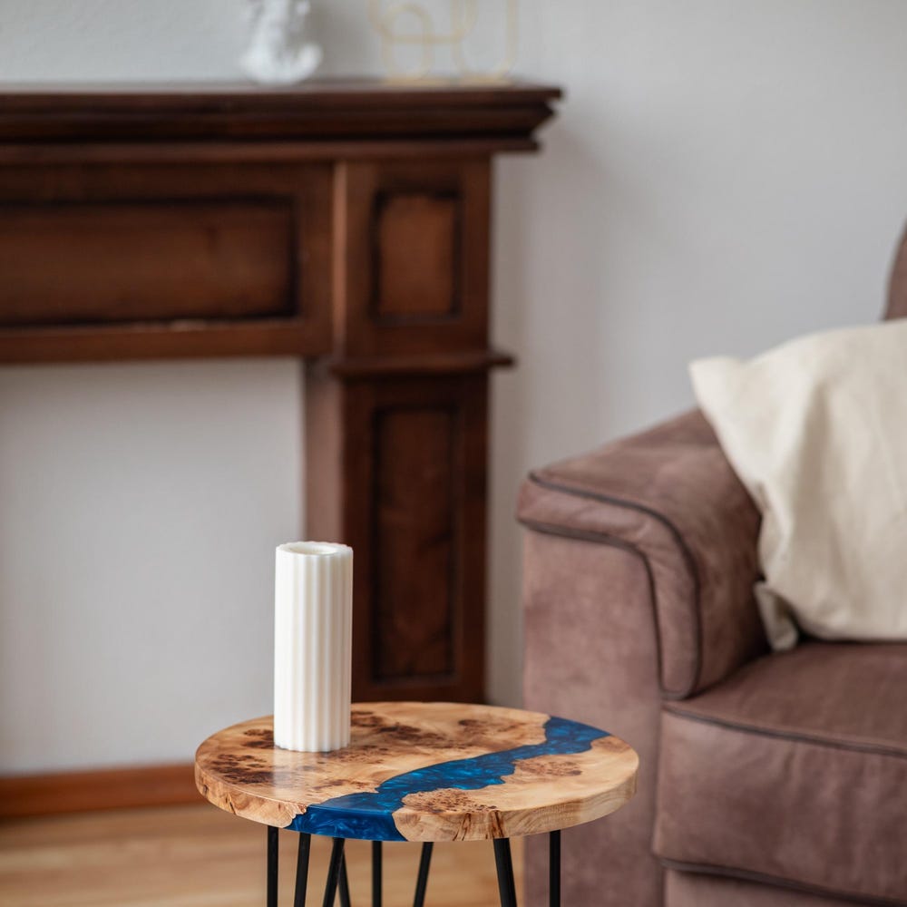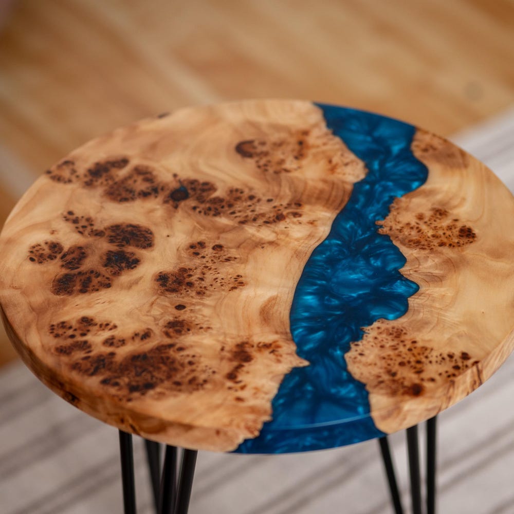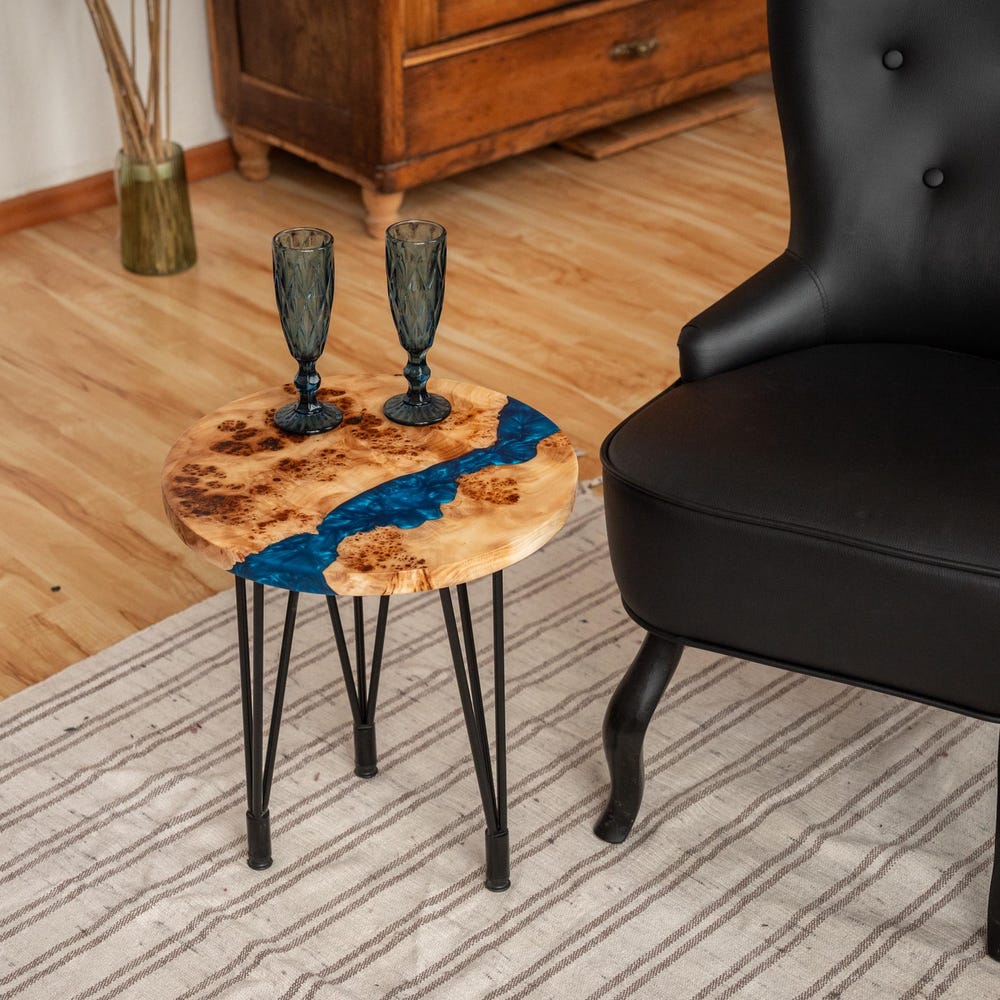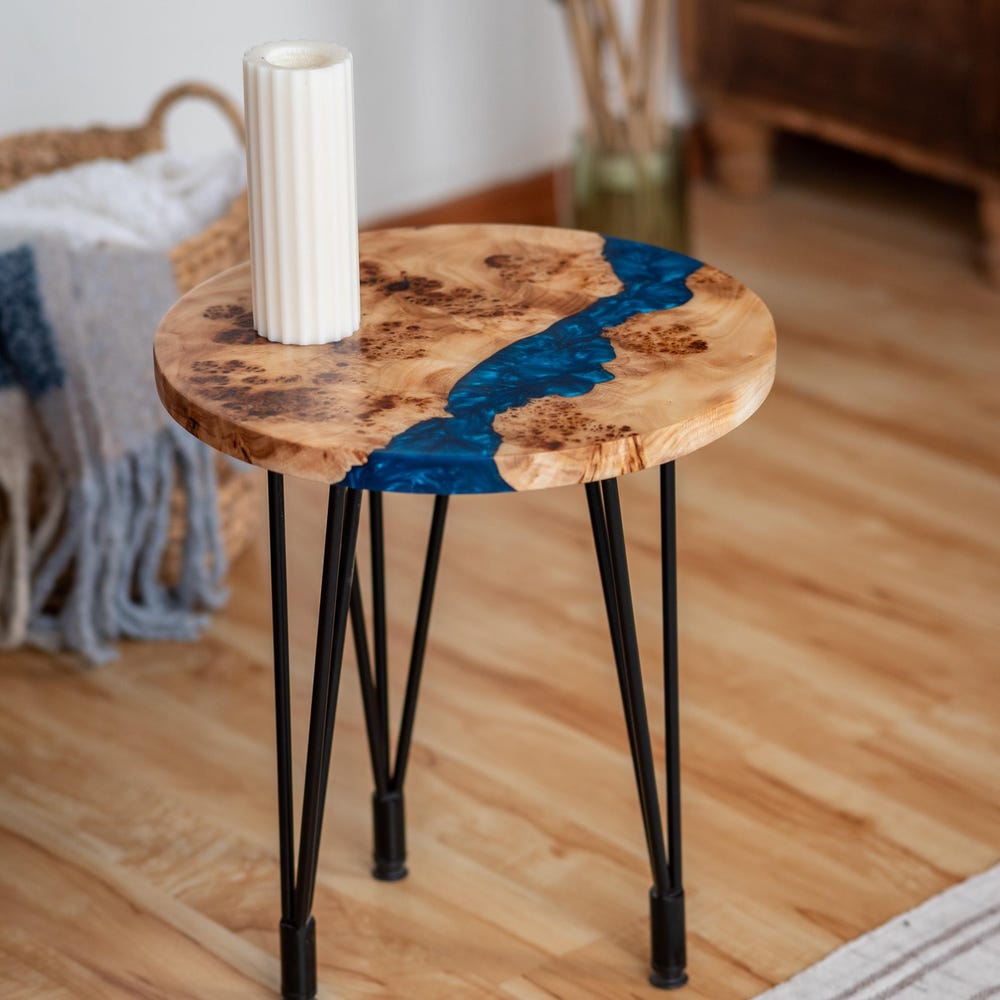 This round coffee table with blue epoxy resin combines Japandi and rustic design. Perfect as a coffee table, side table, or end table. A stylish addition to your living room and a great new home gift.
