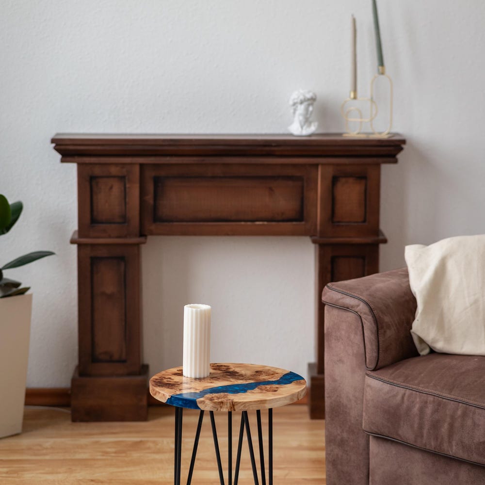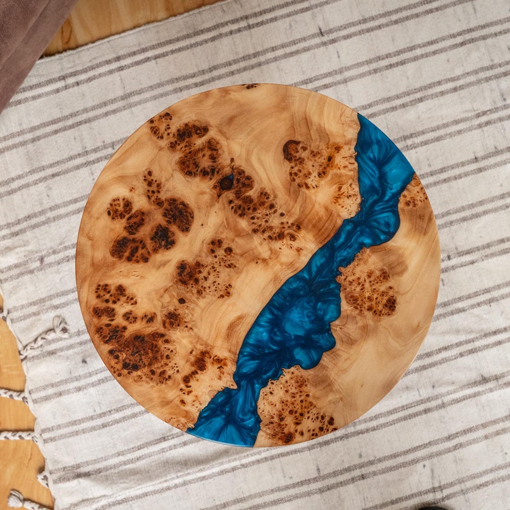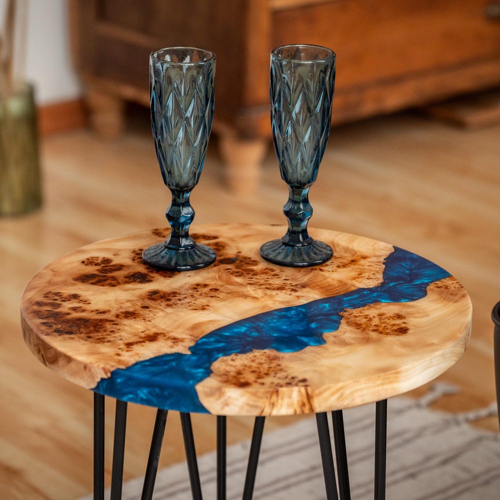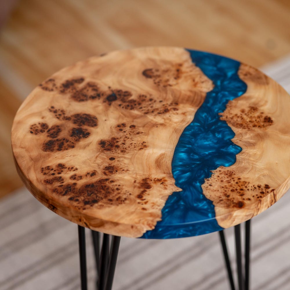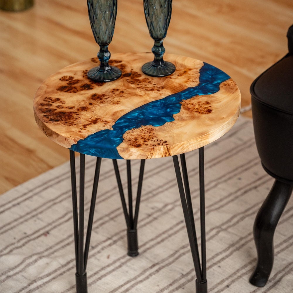 This round coffee table with blue epoxy resin combines Japandi and rustic design. Perfect as a coffee table, side table, or end table. A stylish addition to your living room and a great new home gift.
