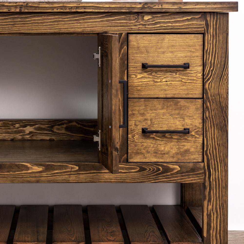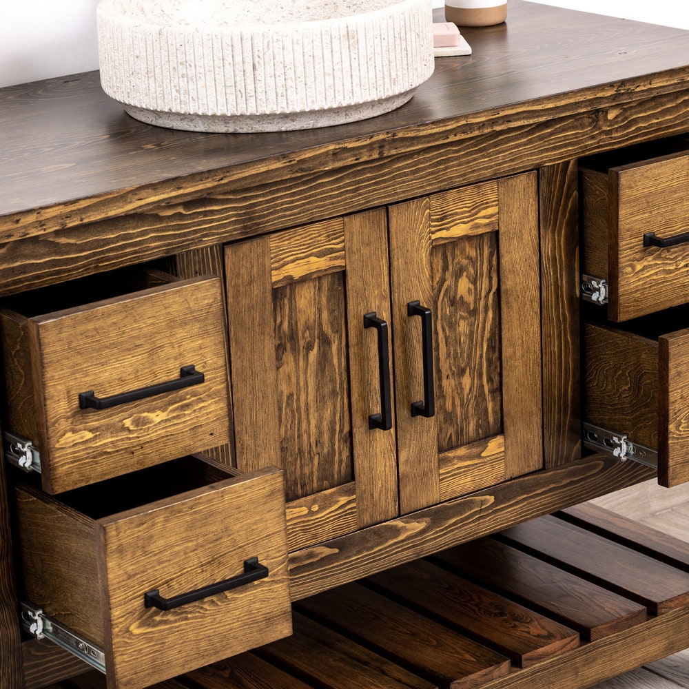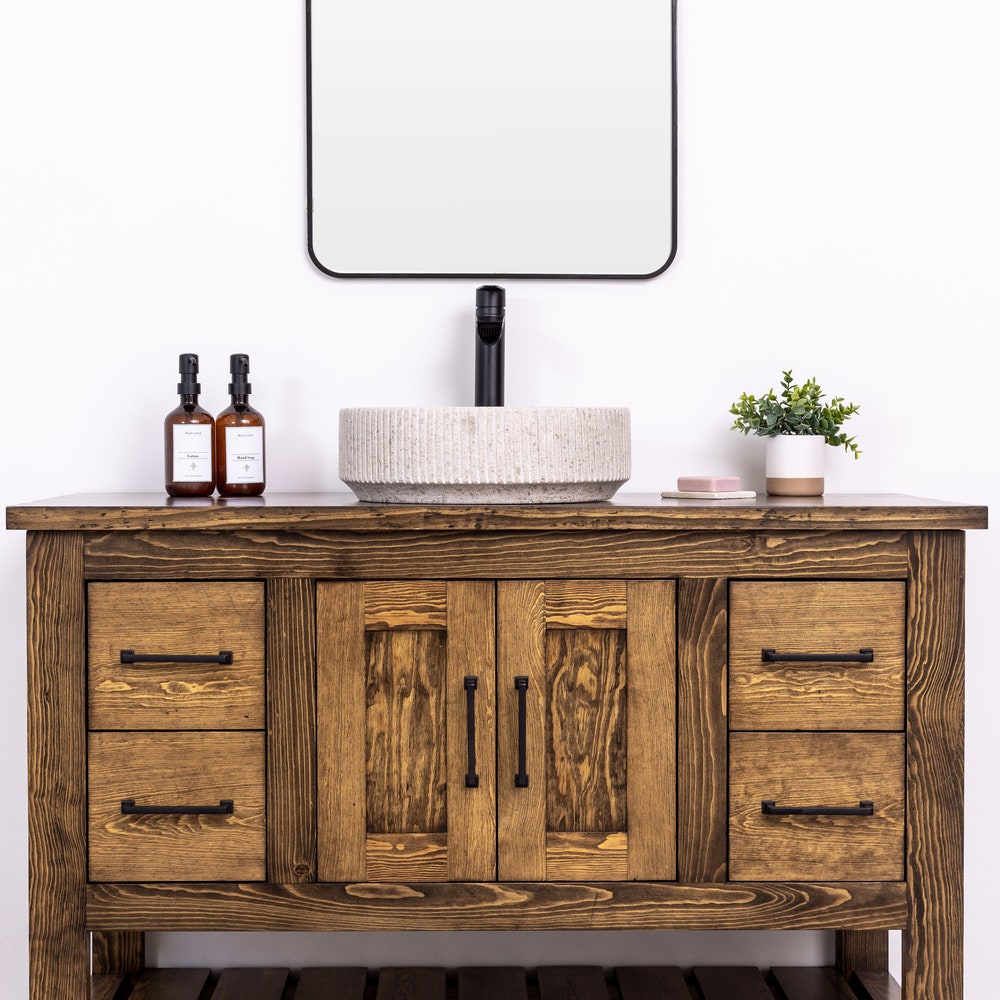 Enhance your bathroom space with the exceptional craftsmanship of our handmade solid American pine wood bathroom vanity base. Meticulously created, each piece is thoughtfully sanded, stained, and sealed to perfection, ensuring both durability and a stunning finish. Enjoy the seamless functionality of soft-close hinges and slides, adding a touch of luxury to every door and drawer.