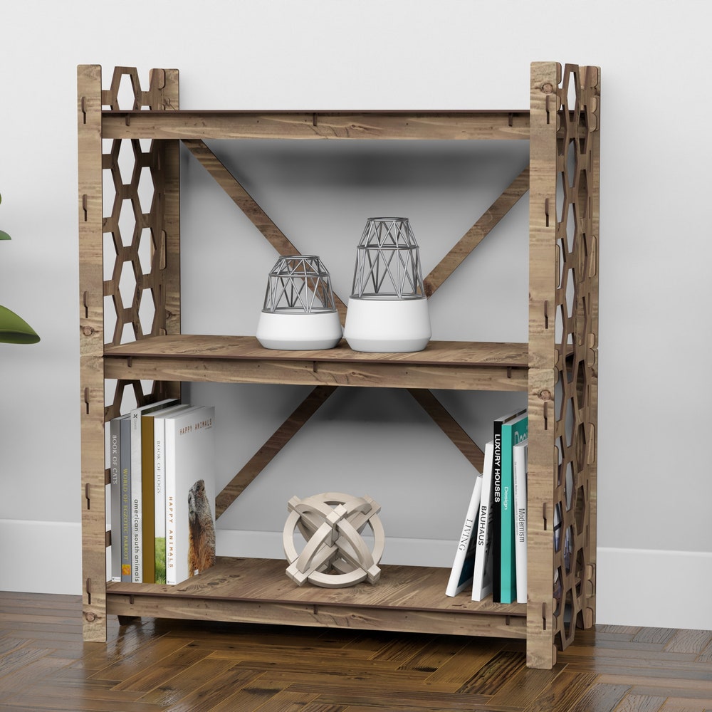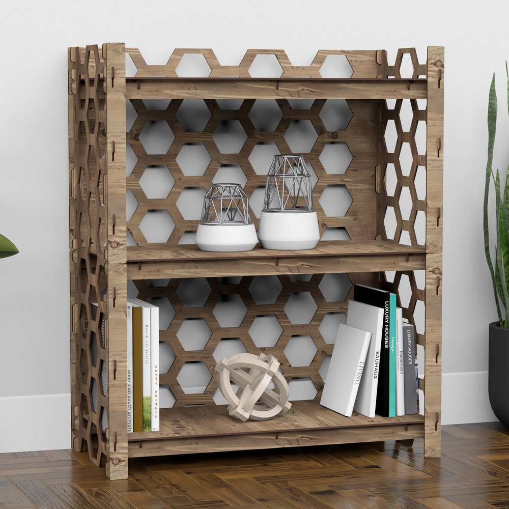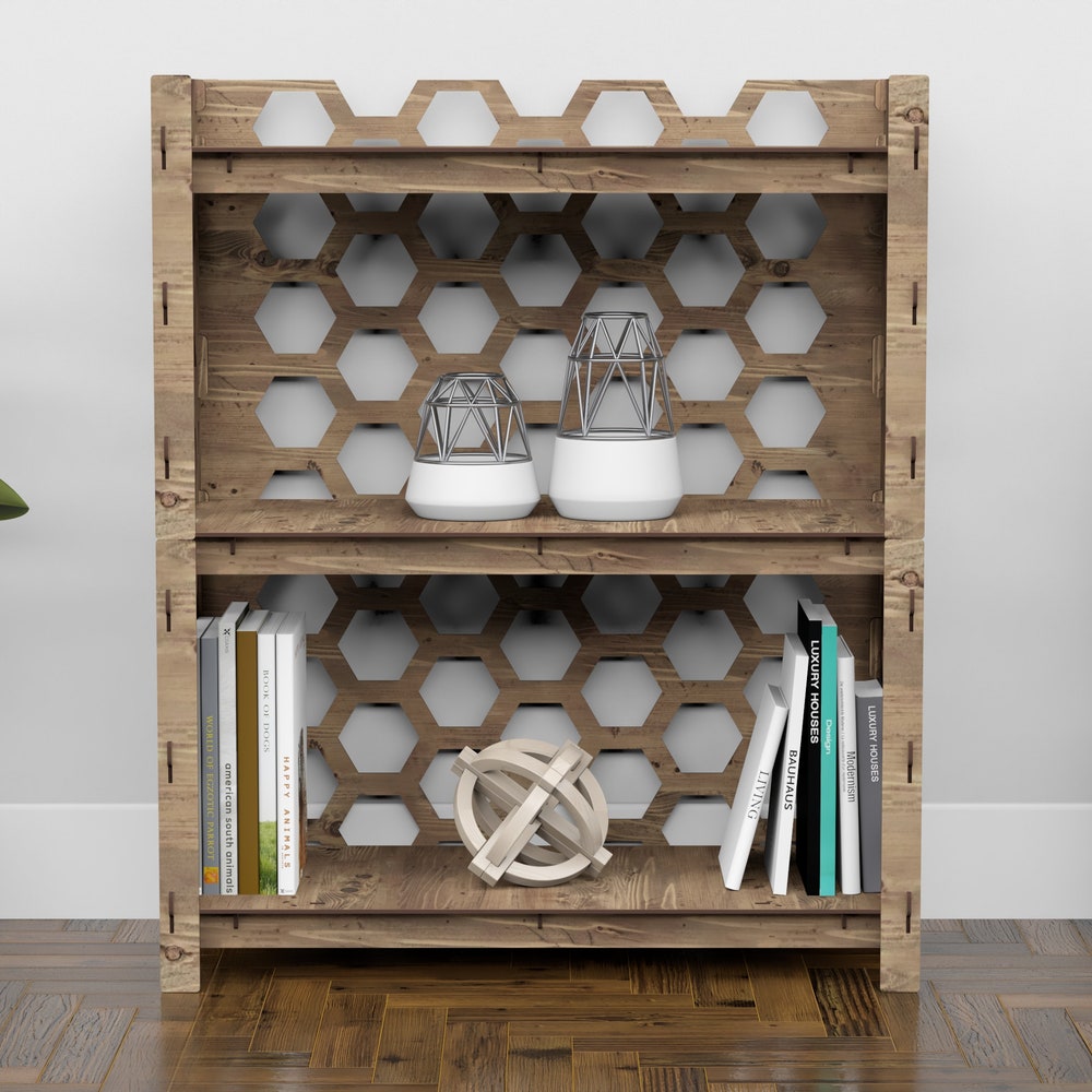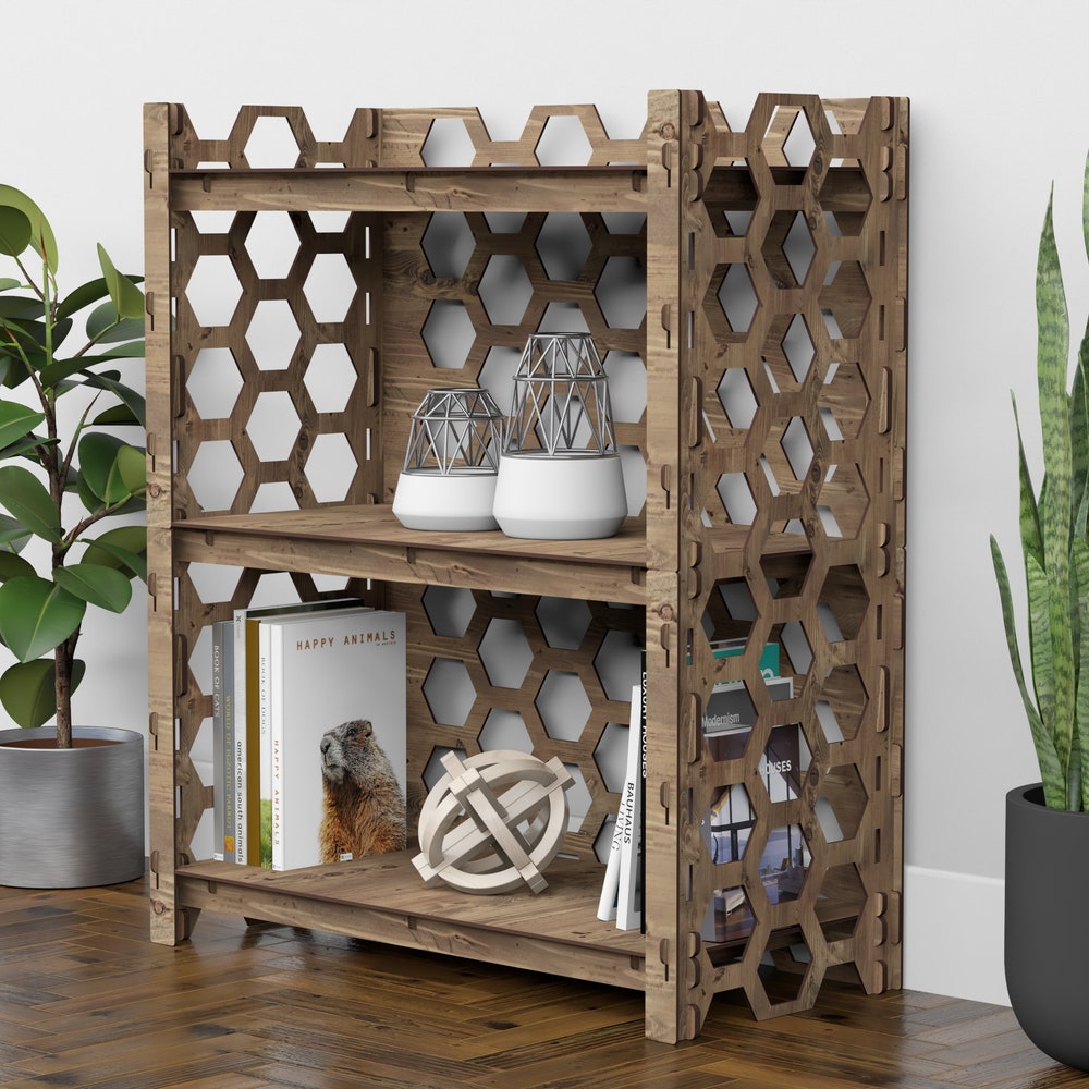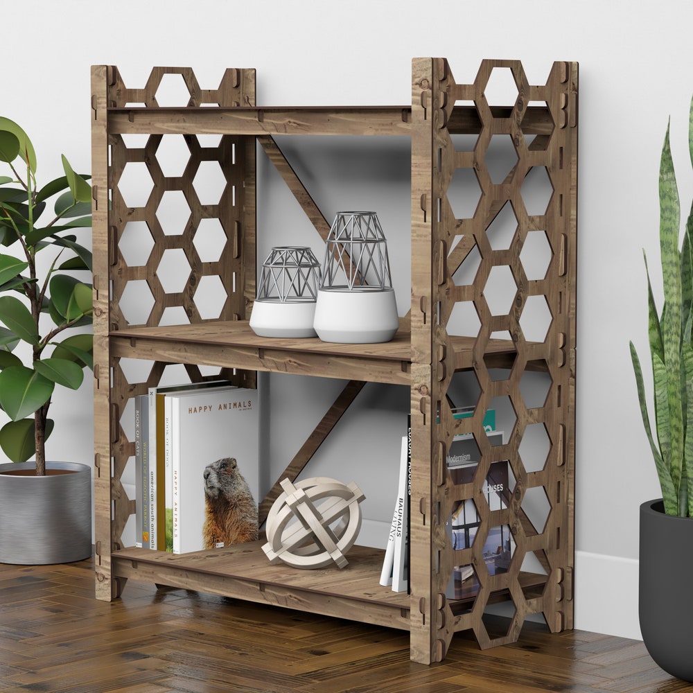 Small Bookcase, Low Bookshelf, Unique Wooden Shelving Unit, Hexagonica