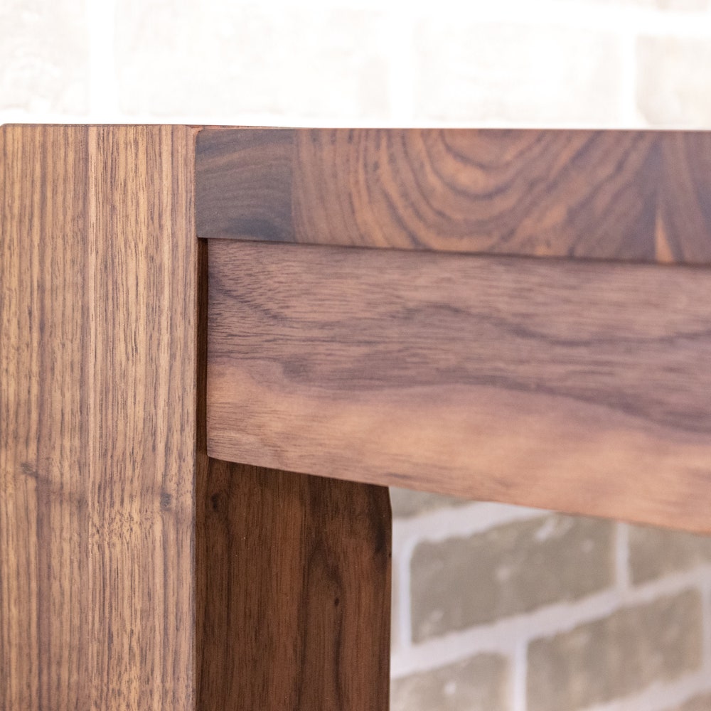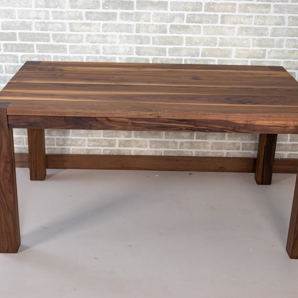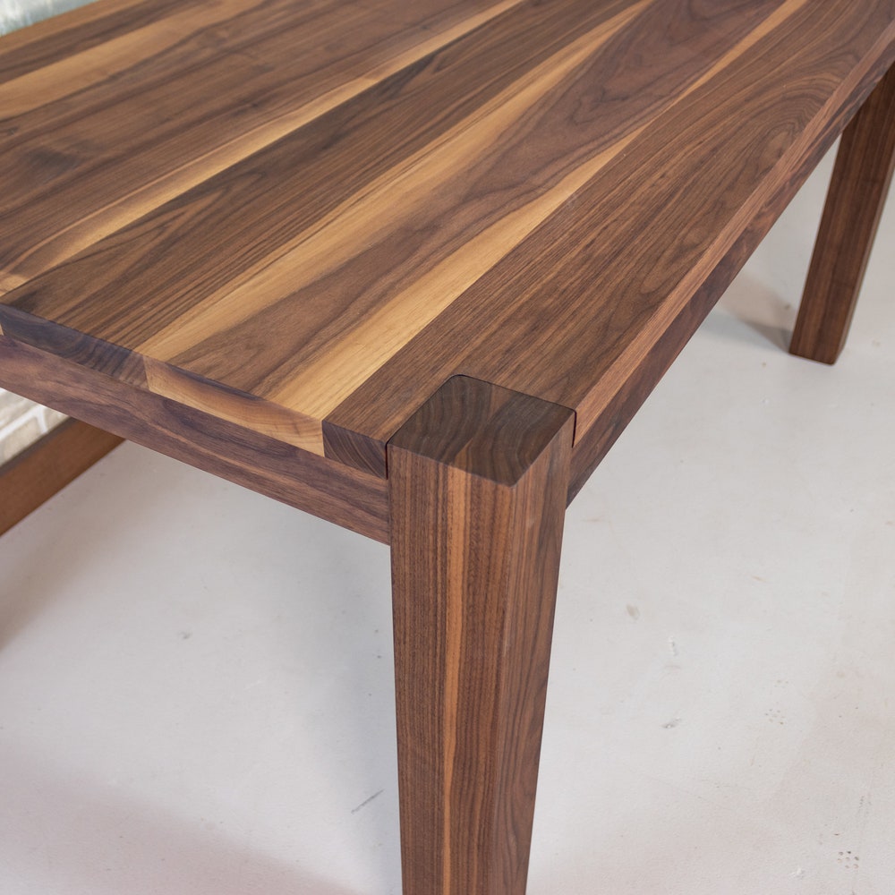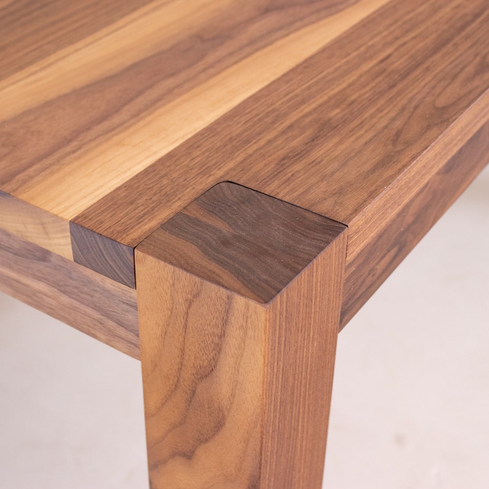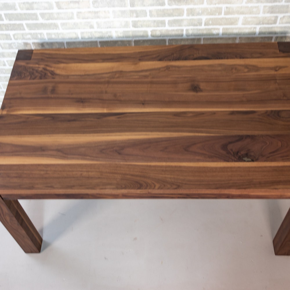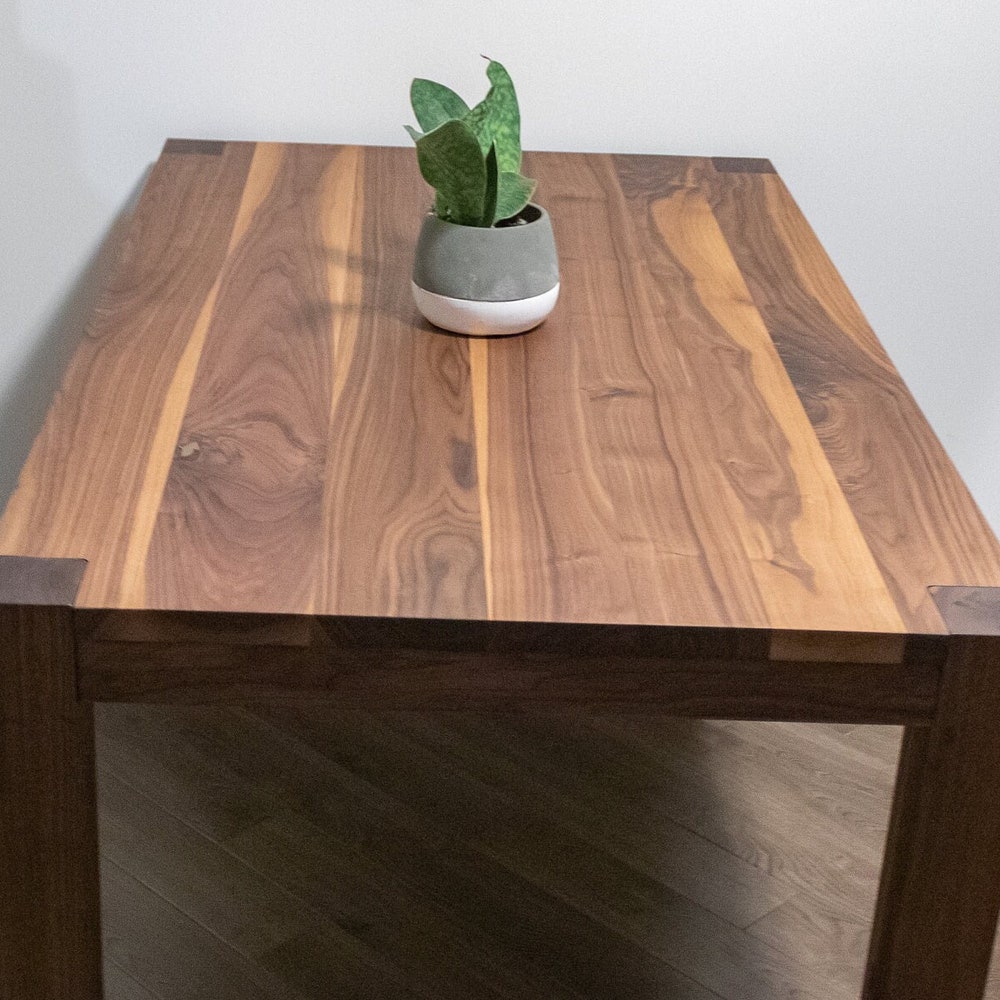 This small dining table is perfect for a smaller space such as an apartment or a kitchen. Made of solid walnut, it features corner post legs that come up through the table top creating corner accents. We build every table to order so there are many ways to make this table perfect for you.