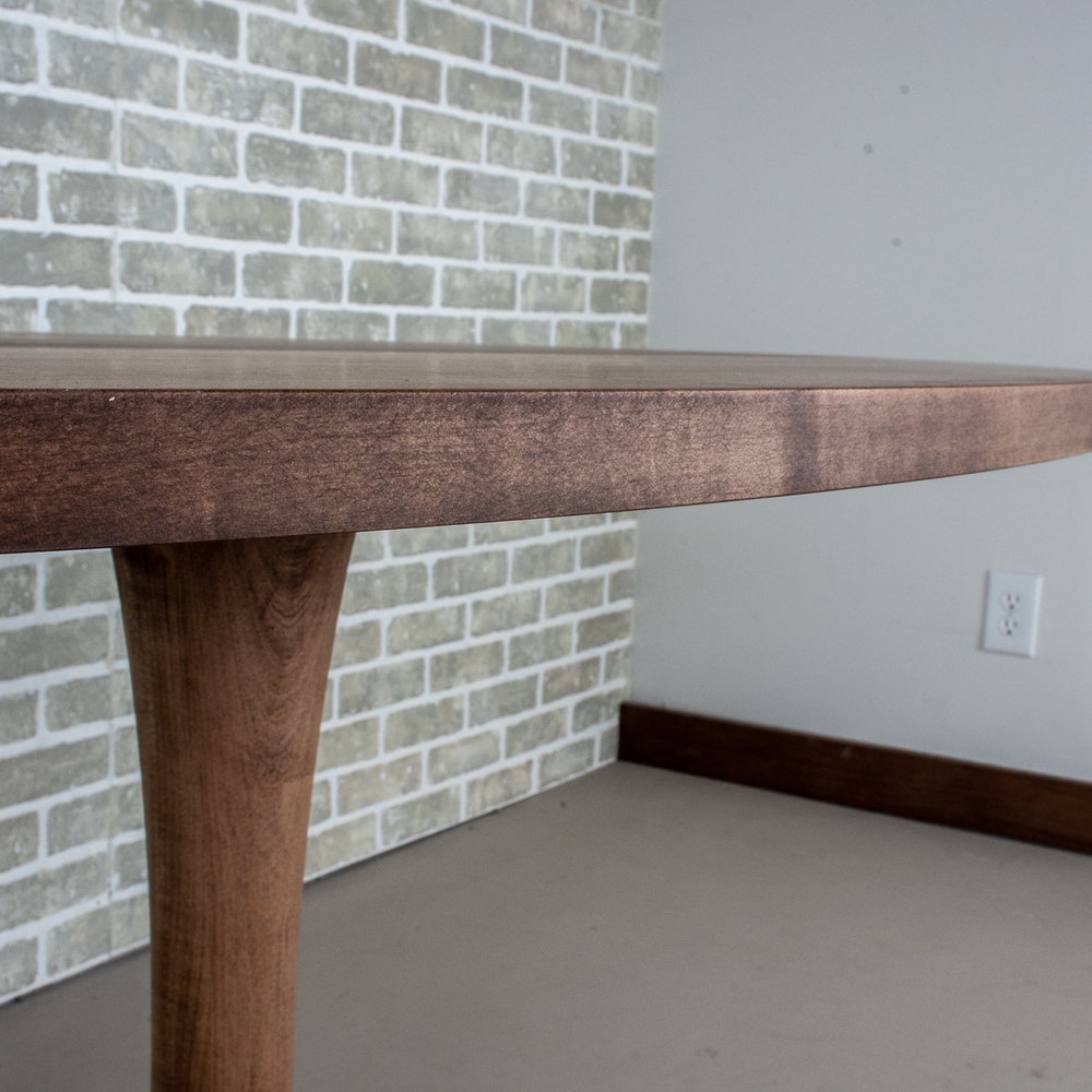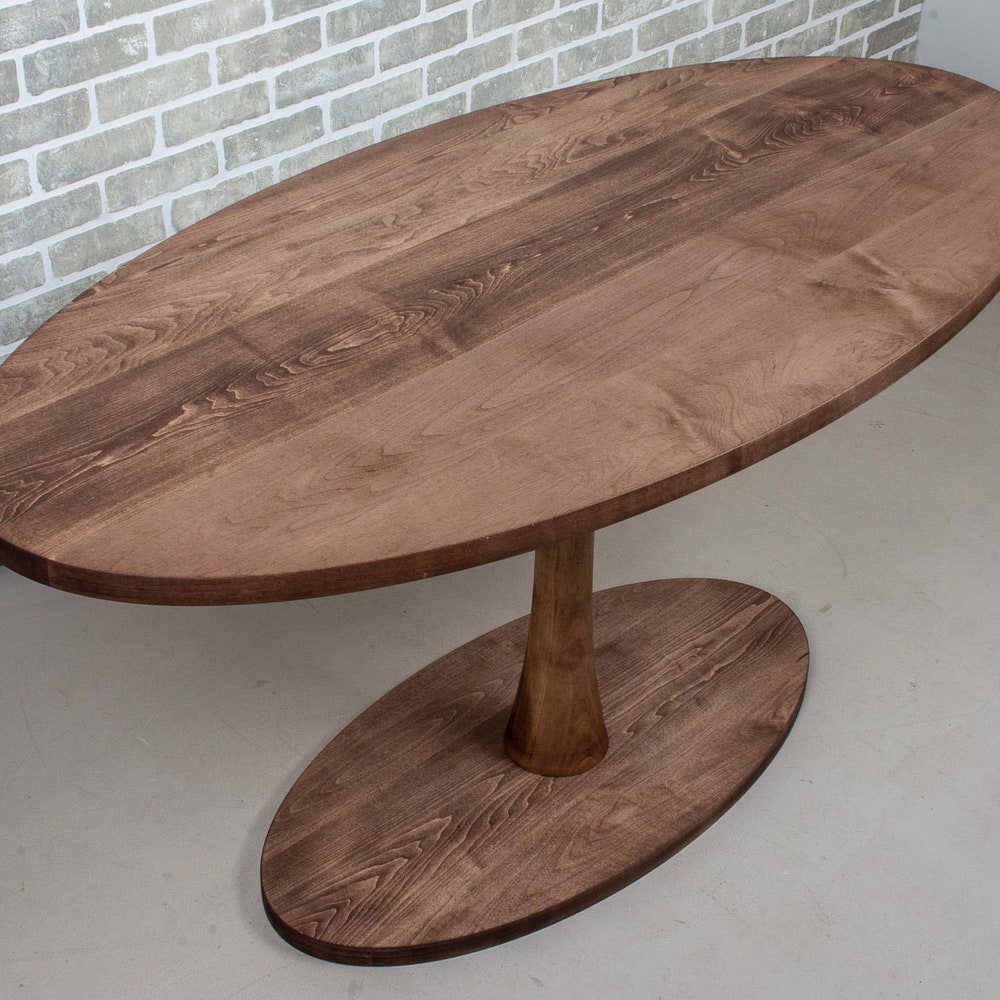 Small spaces can still be elegant! This oval pedestal table is perfect for a modern eat in kitchen. As an elliptical oval it is easy to walk around. We build every table to order so there are many ways to make this table perfect for you. We build every table to order so there are many ways to make this table perfect for you.