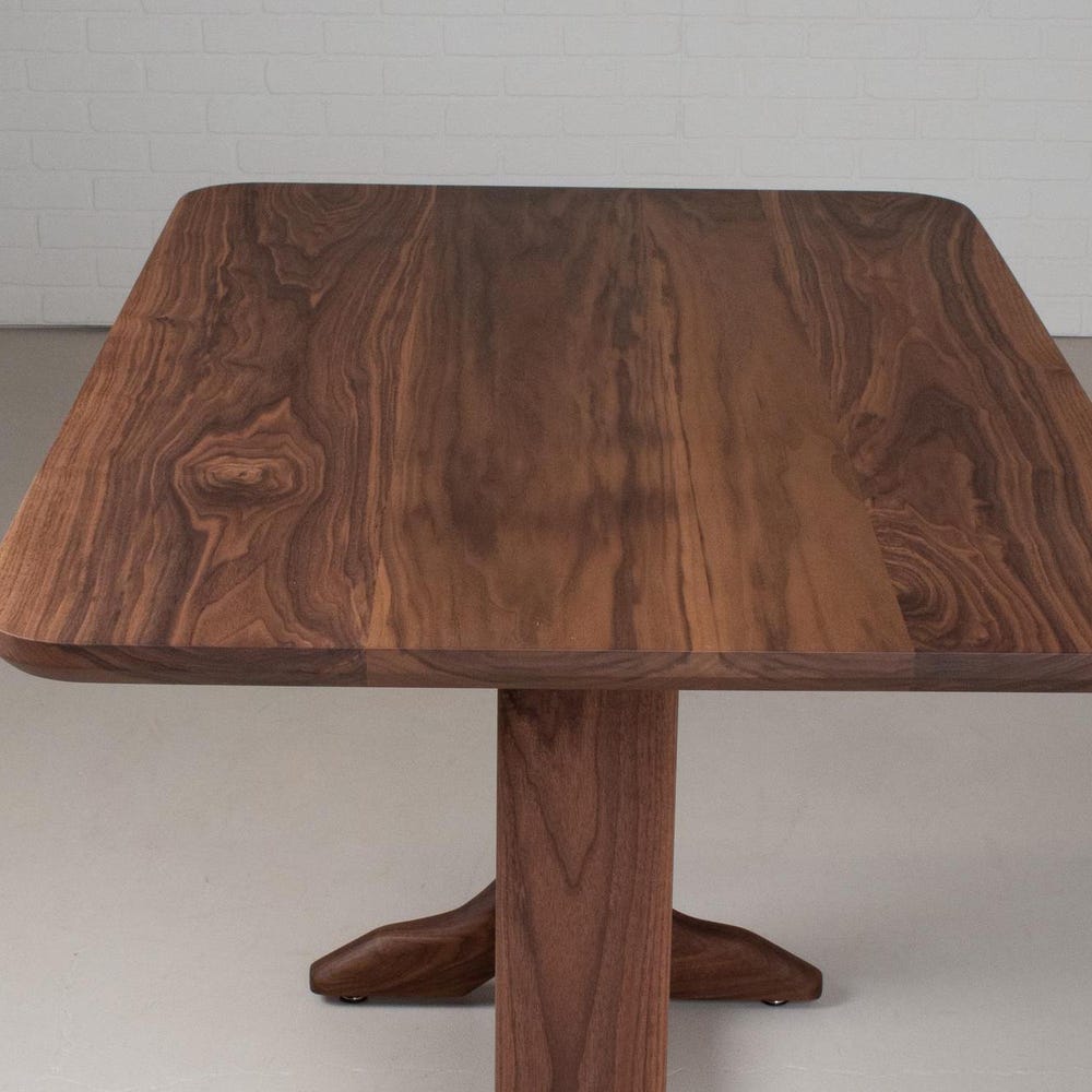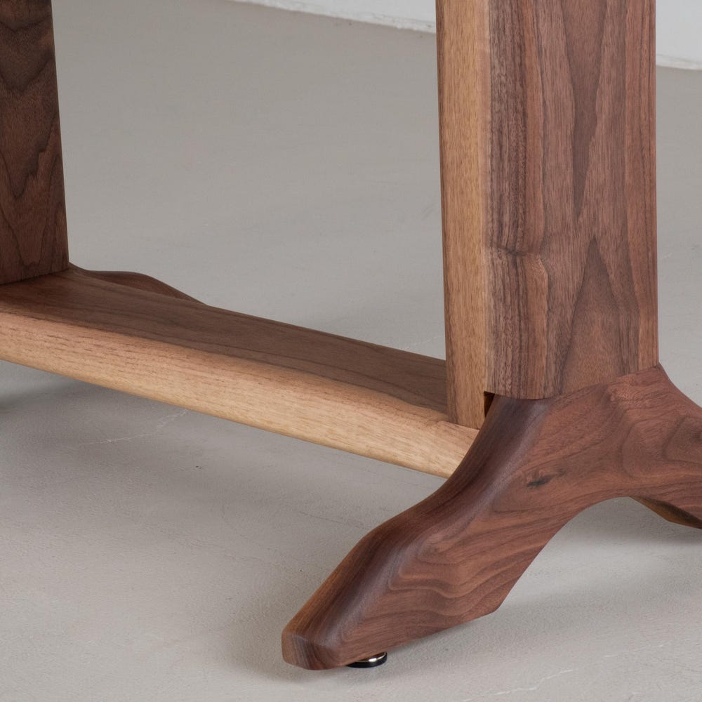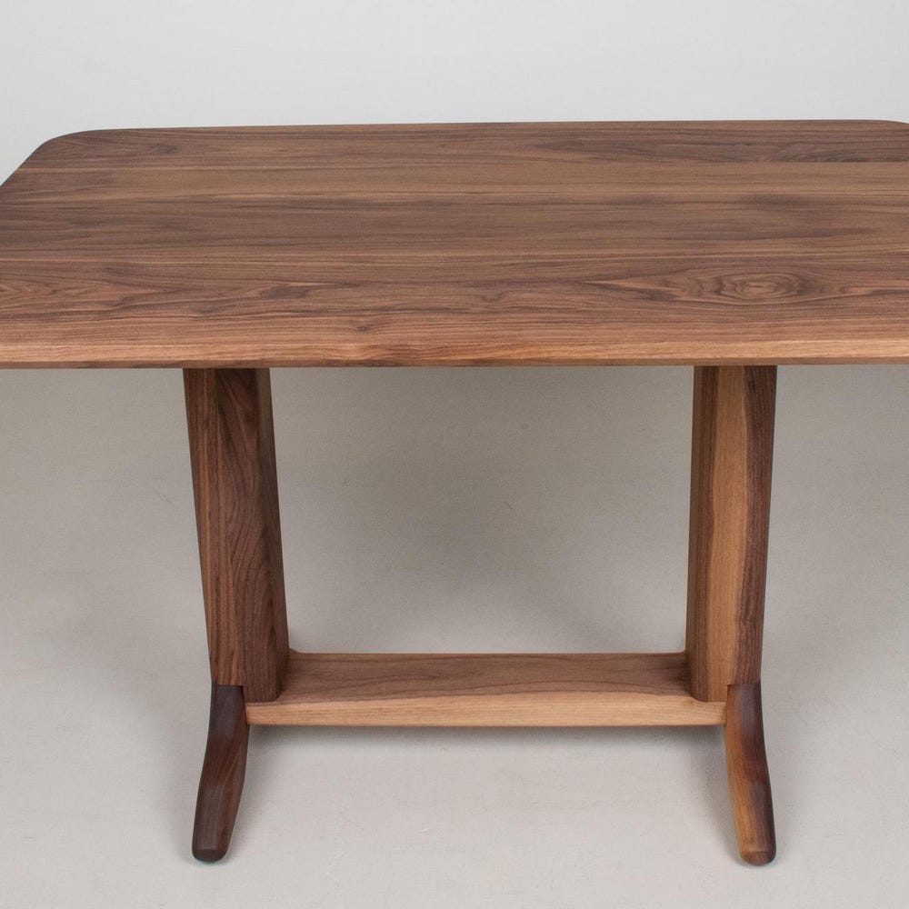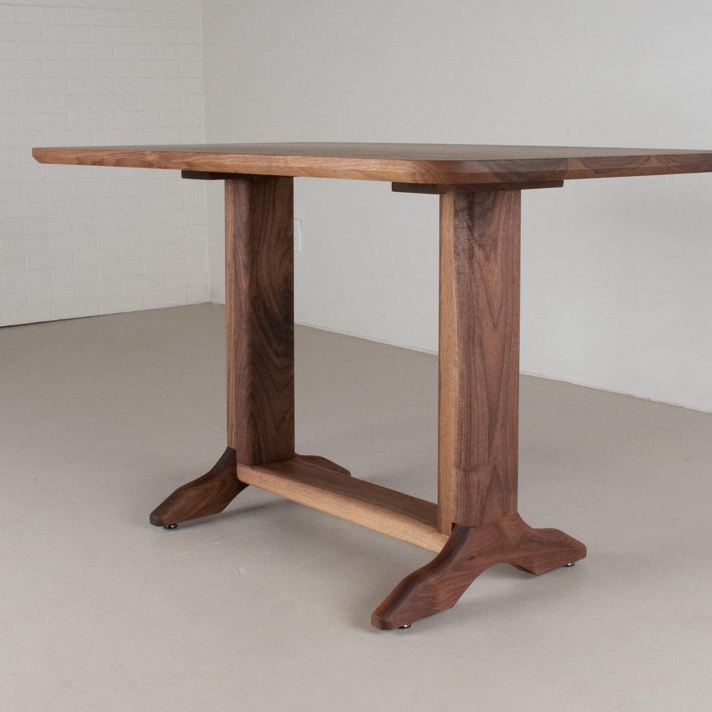This small walnut trestle table was built for a customer and is now in their home. We can build one like it for you that is tailored to your needs. We build every table out of solid hardwoods one at a time. Our design team is happy to help you figure out the details of the table that is best for you.