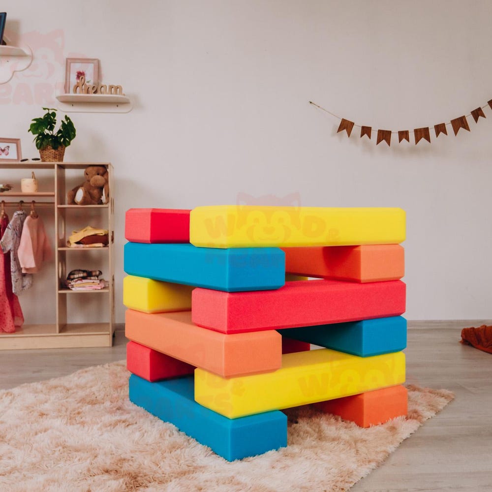 Bring endless fun and creativity to your child’s playtime with our Soft Large Building Blocks! These blocks are designed for safe, active play and are perfect for building imaginative structures or creating a soft play mat for WoodandHearts climbing furniture. They come in vibrant colors and soft textures that make them ideal for both solo play and interactive family time.