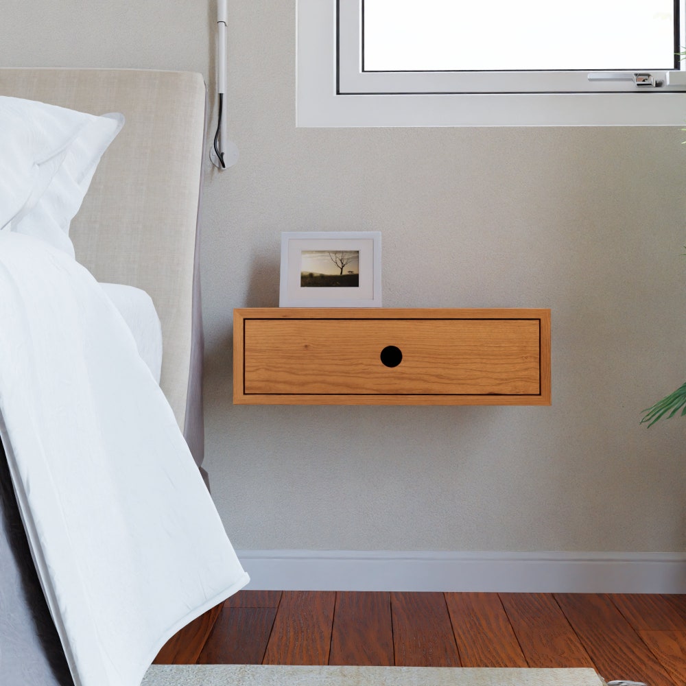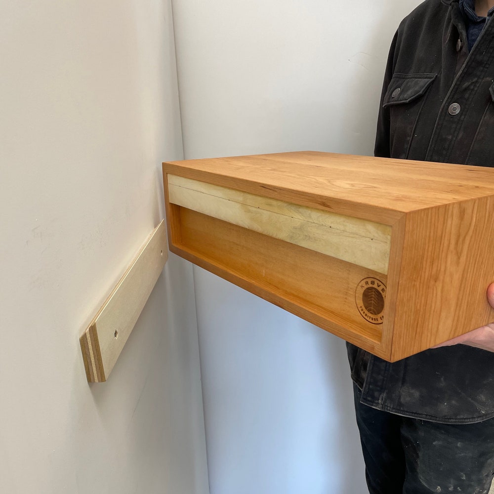 Our Floating Nightstand is Mid-Century Modern inspired and is built by hand from solid American Cherry, grown and milled domestically. It mounts easily and solidly to your wall using a French cleat (Included) for a beautiful floating appearance.