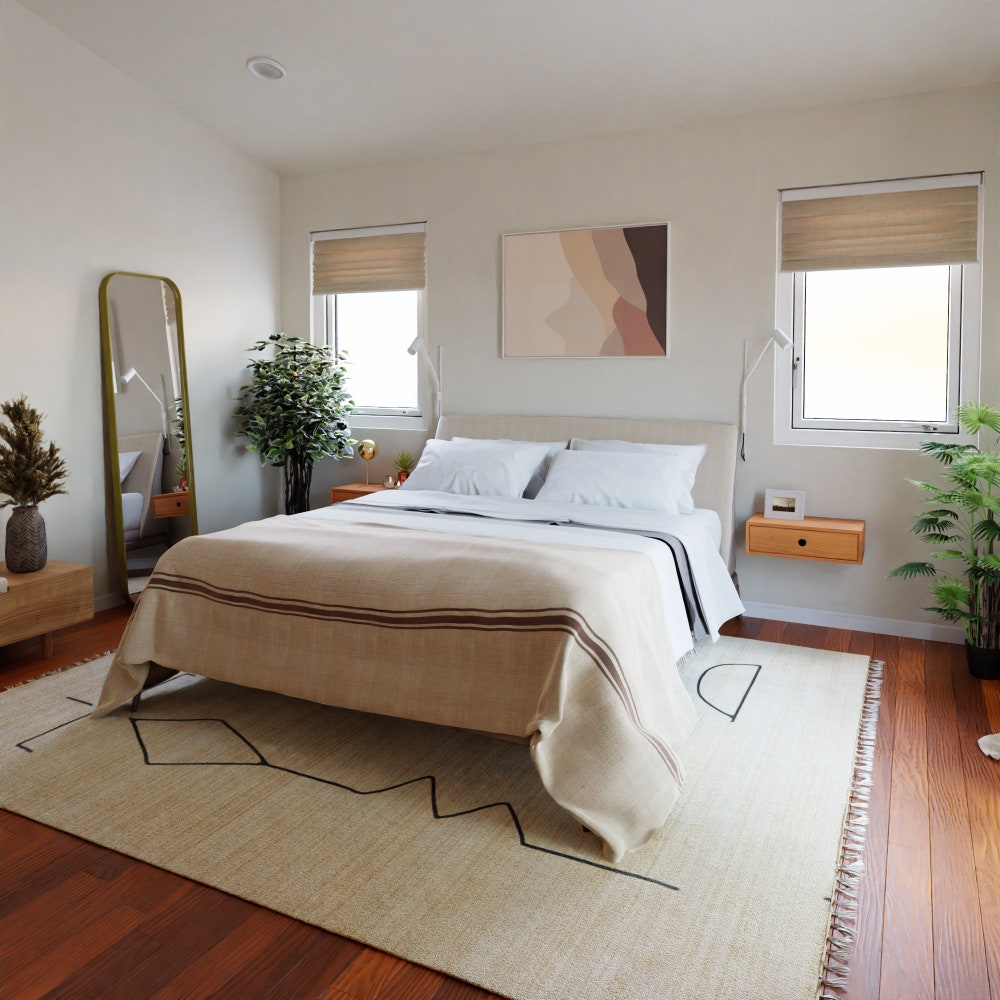 Each bedside table is built from solid hardwood boards joined with a 45 degree miter creating a beautiful wrap-around continuous grain.