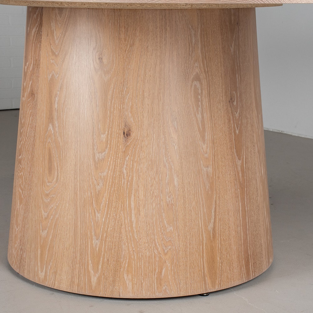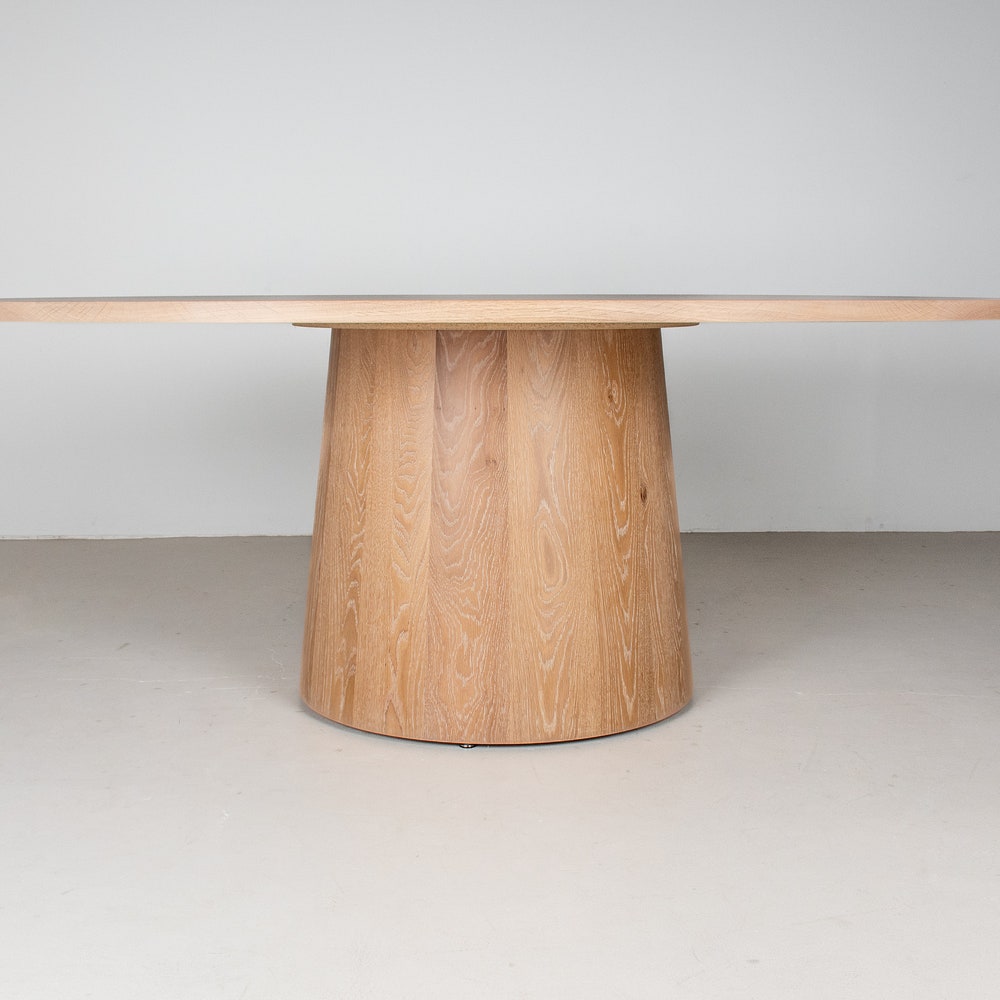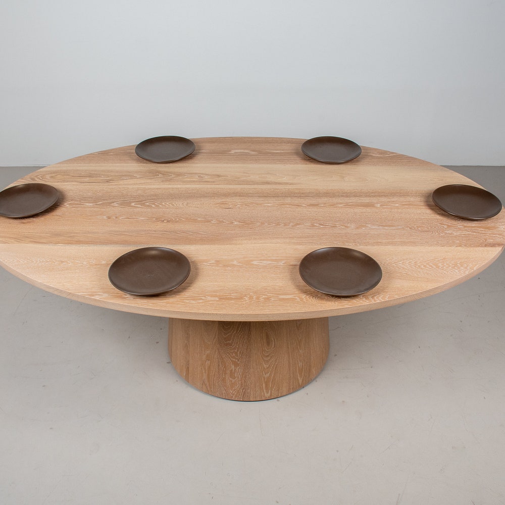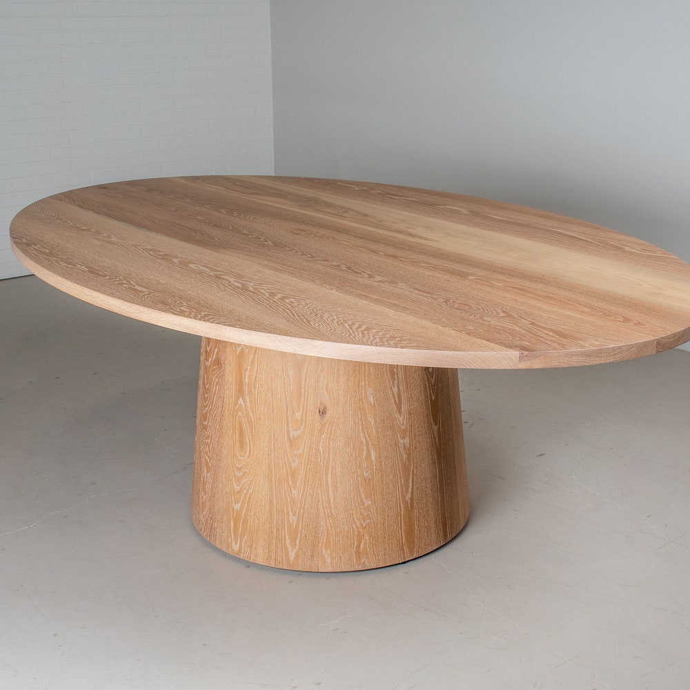 This solid oak dining table will sit beautifully in a modern dining room. The light finish makes the table feel light and elegant. The elliptical shape makes it easy to walk around and the Chapman pedestal base reinforces the light feel of the table and provides flexibility on how chairs are placed around the table. We build every table to order so there are many ways to make this table perfect for you.