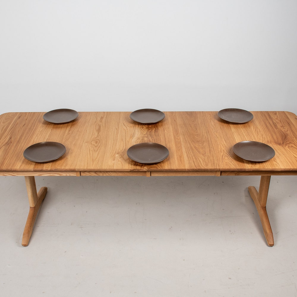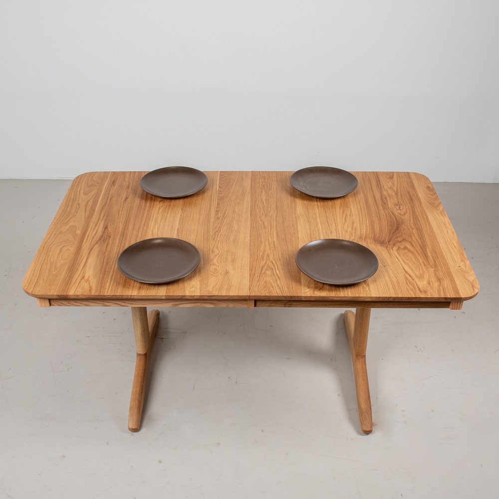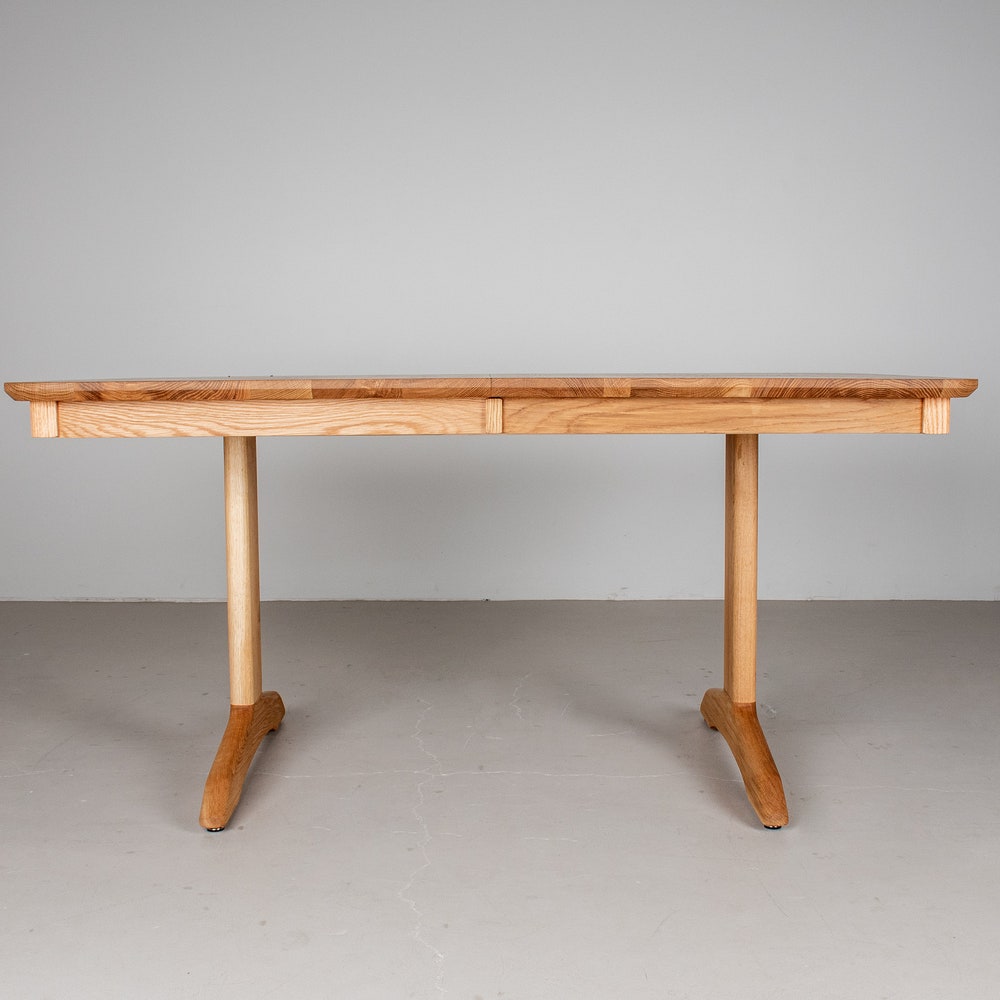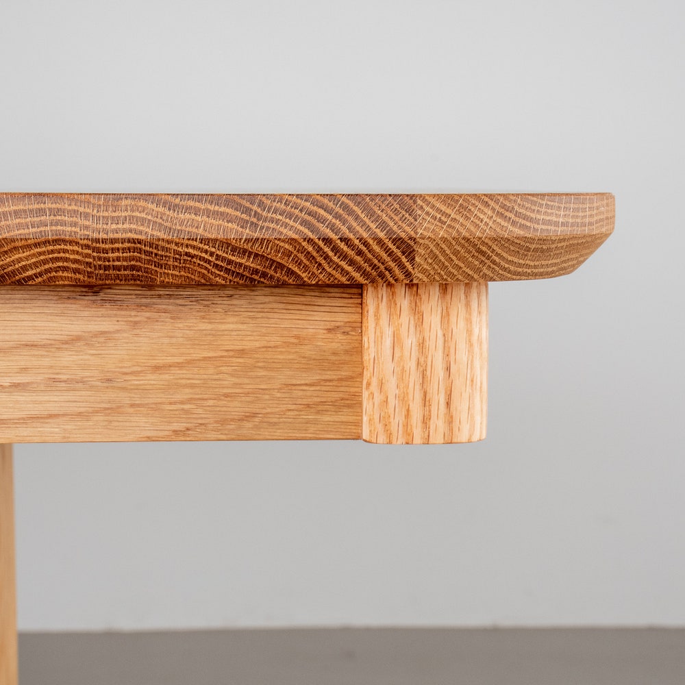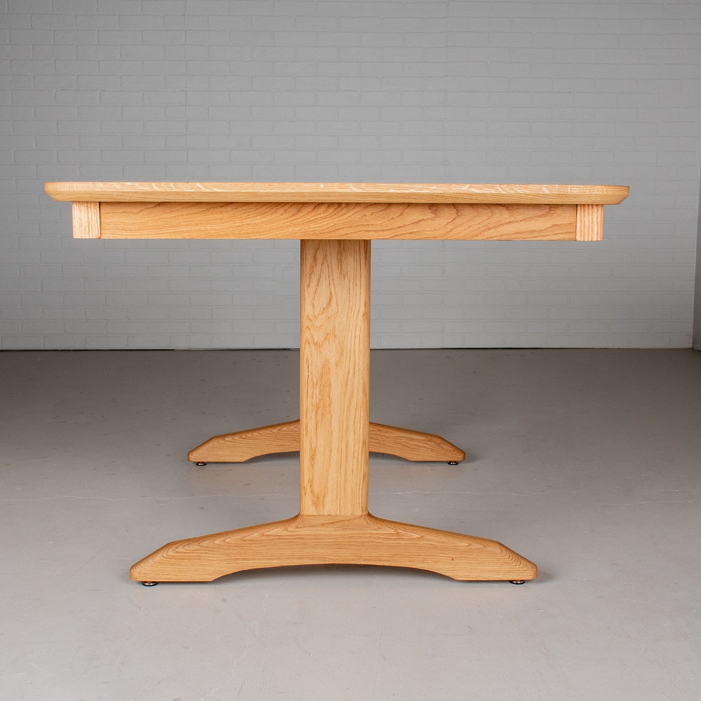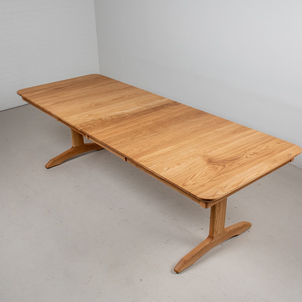 This solid oak table is a beautiful addition to a kitchen or dining room and as an extendable table, you’re always ready for a few more friends. The Natural finish and Fraser edge make the table feel light and bright. The rounded corners make it easy to walk around and the matching oak Tobin legs stay nicely out of the way of your chairs, making for a functional everyday table. We build every table to order so there are many ways to make this table perfect for you.