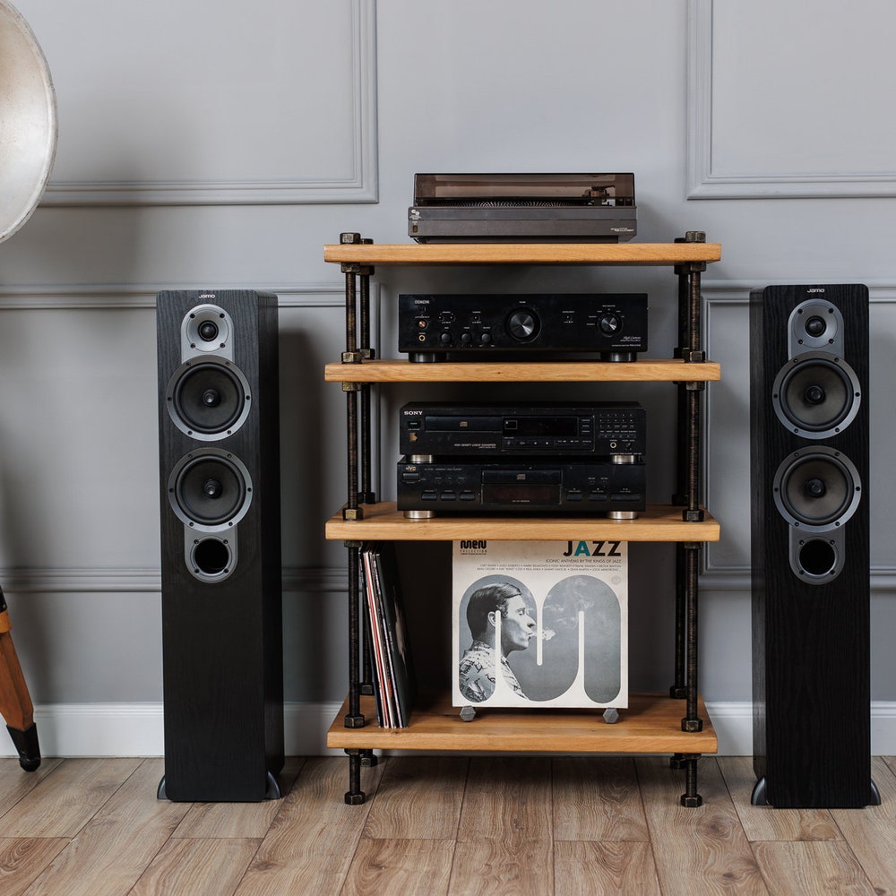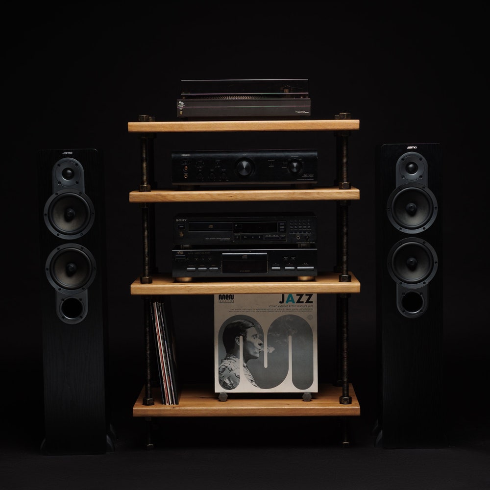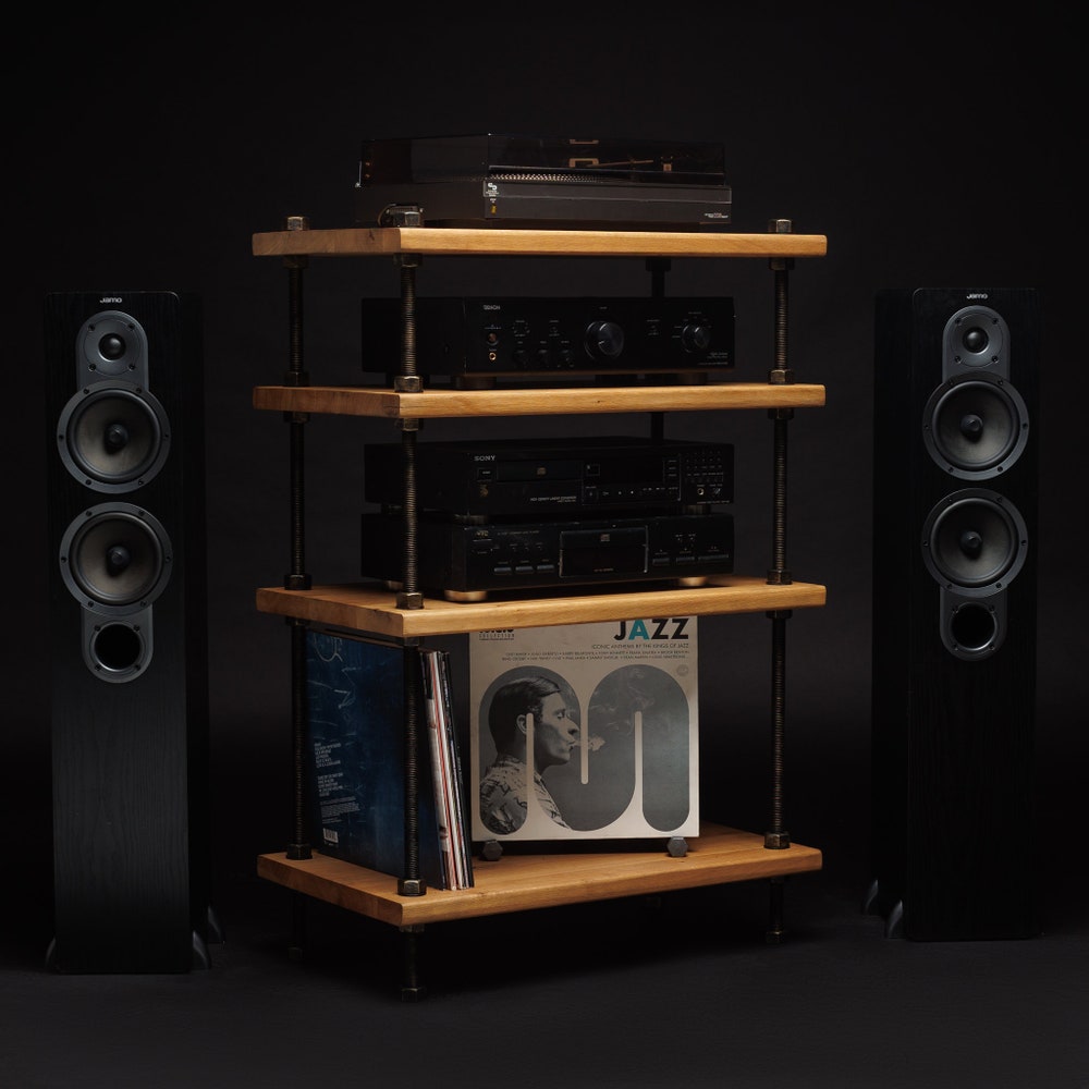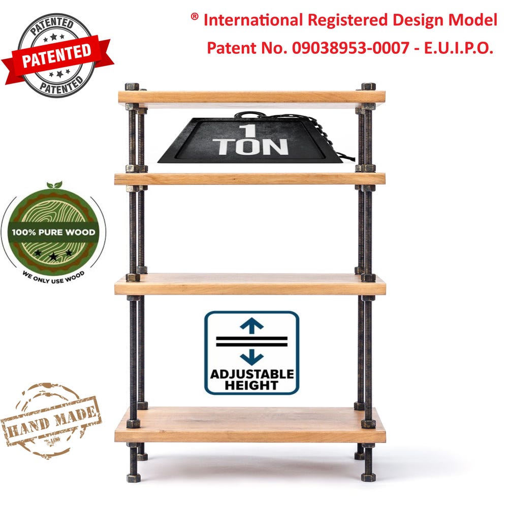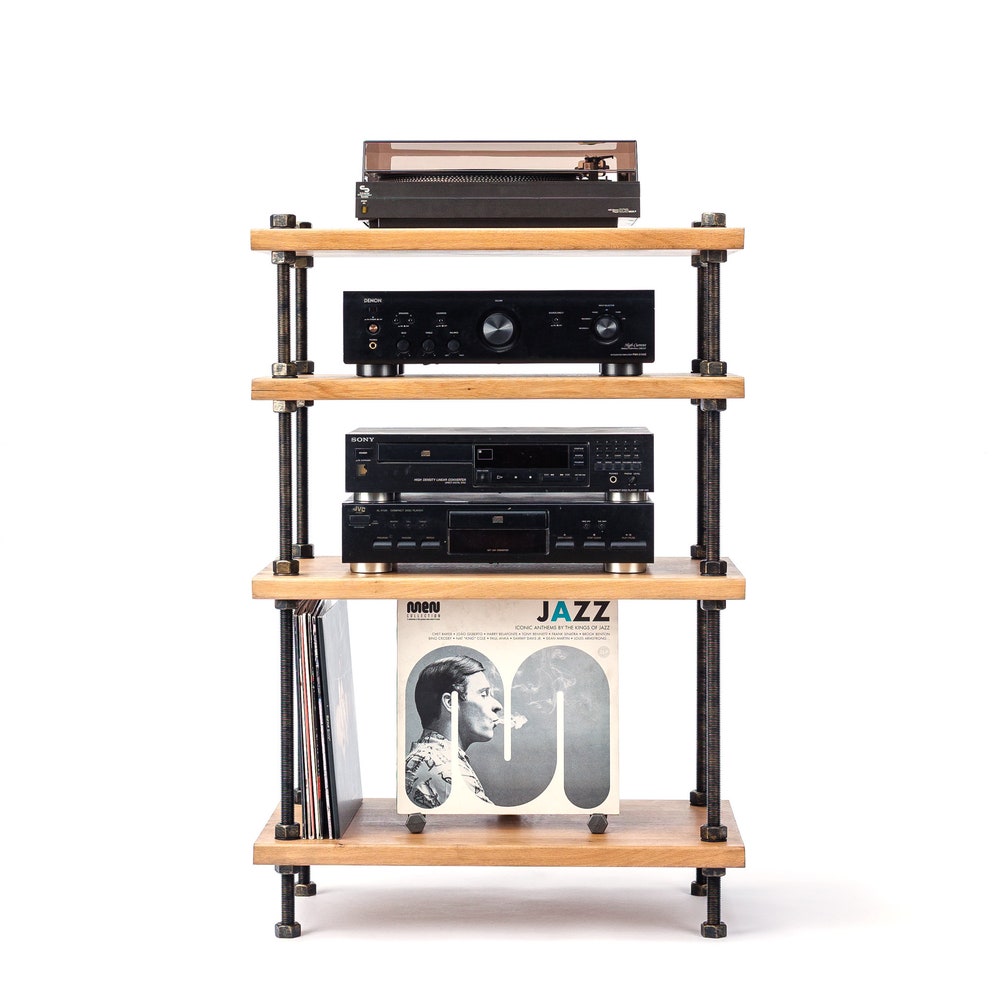 2 IN 1 Registered design stand, 5 Tier Oak Black rods stand, audio rack / Record player stand / Turntable stand / Threaded rod shelf
