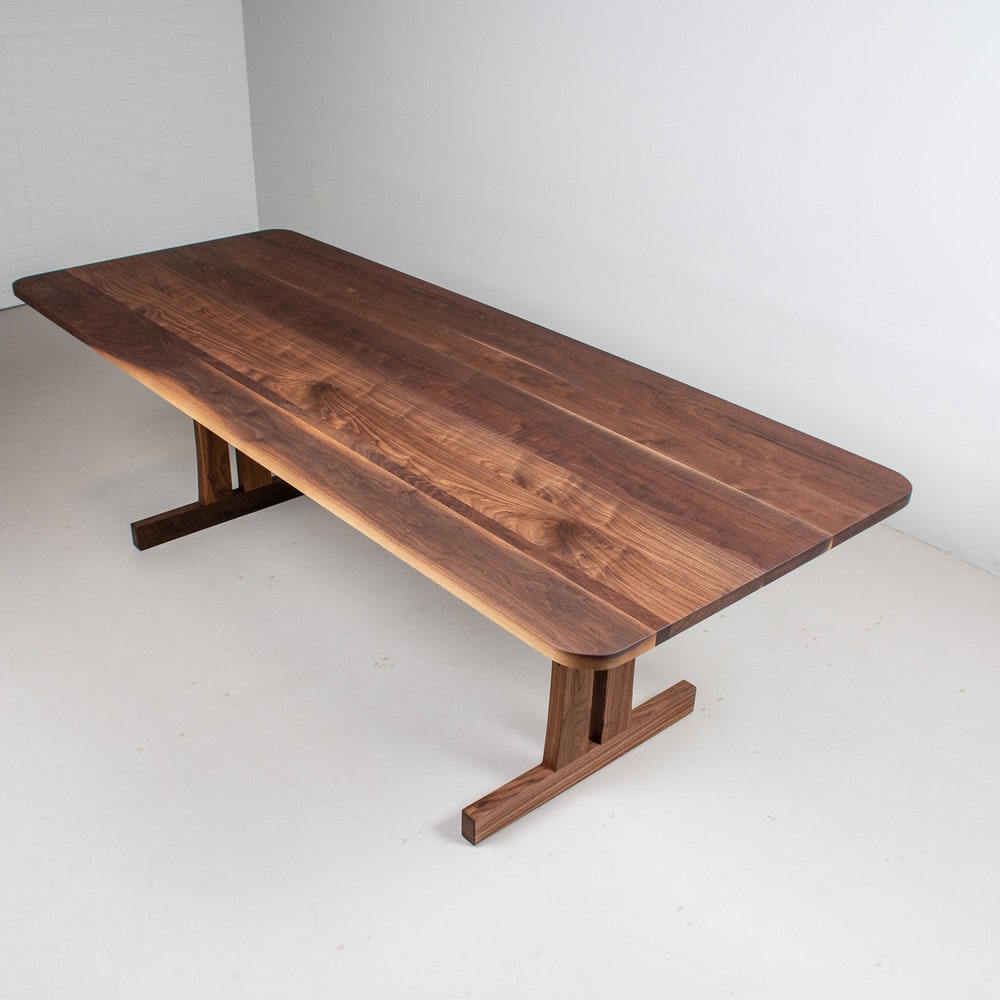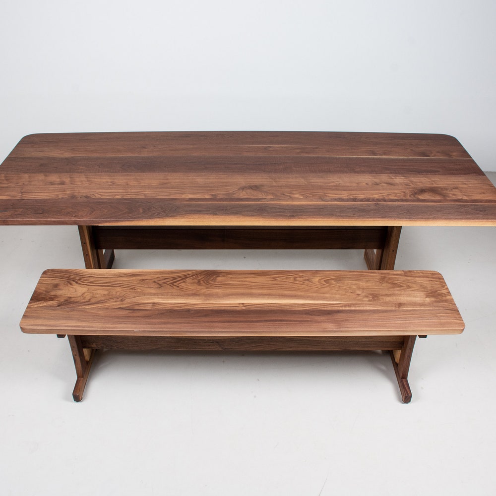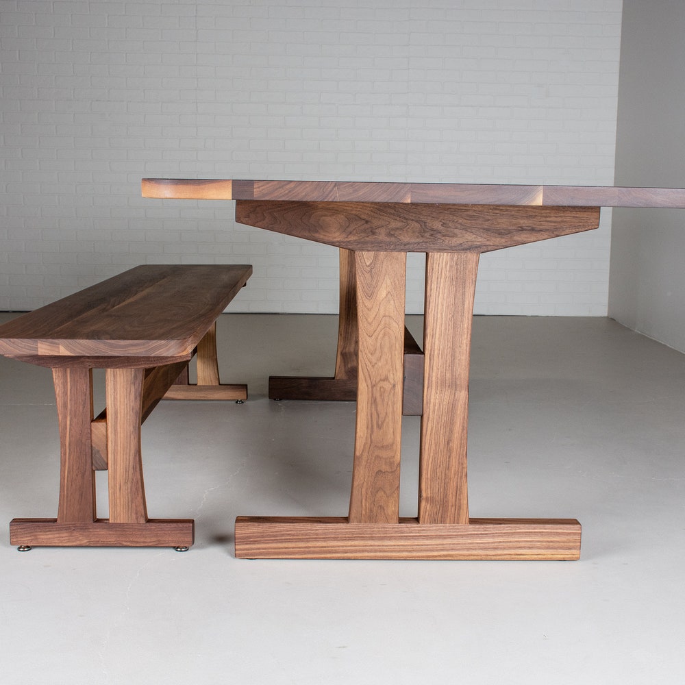 Create a warm inviting modern kitchen with this solid walnut dining table and bench. The warm tones of the walnut paired with the softened corners and edges, what we call a boyer edge, invite people to sit down for a good conversation. This custom trestle base gives the table and matching bench a robust durability, effectively combining old world and modern details. We build every table to order so there are many ways to make this table perfect for you.