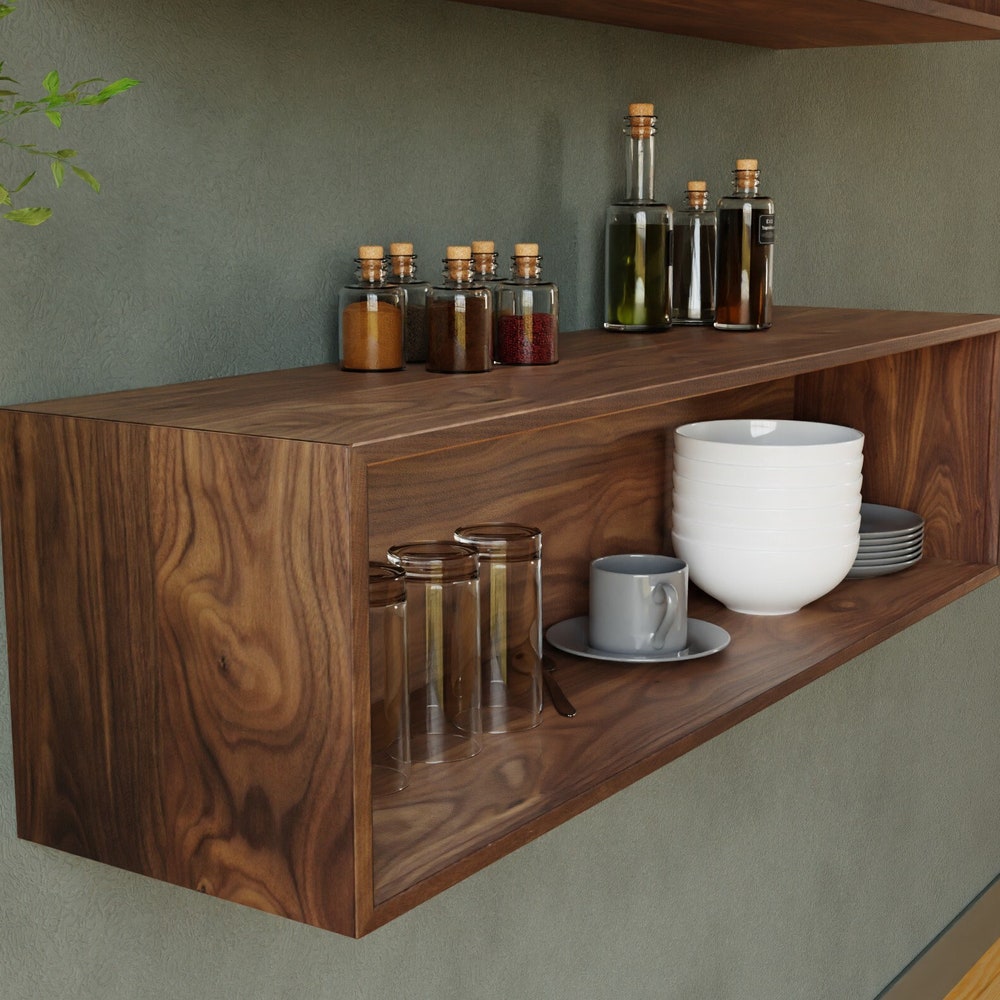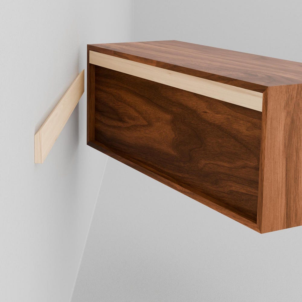 Our Floating cabinets are handmade from solid Hardwood (Available in Walnut, White Oak, Maple and Cherry). We build each shelf from hardwood boards joined with a 45 degree miter creating a beautiful wrap-around continuous grain.