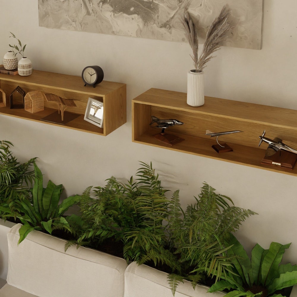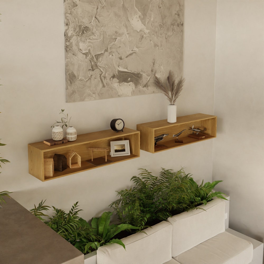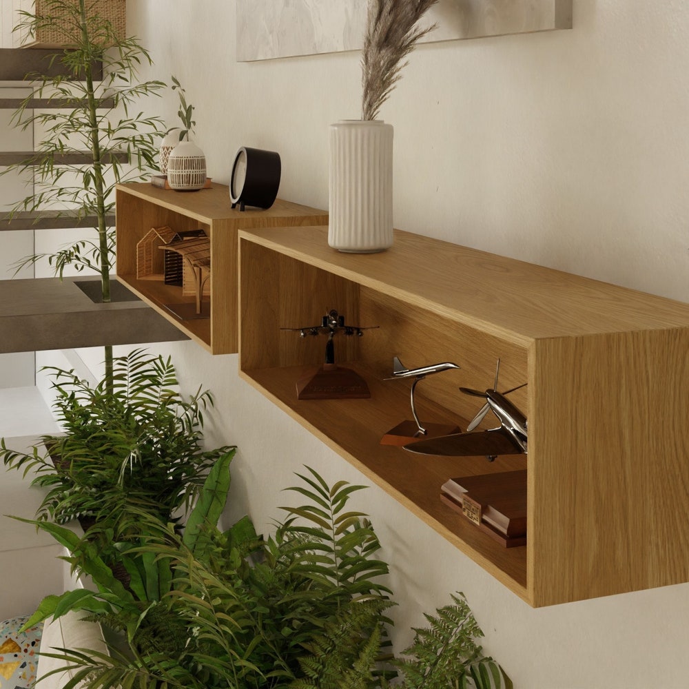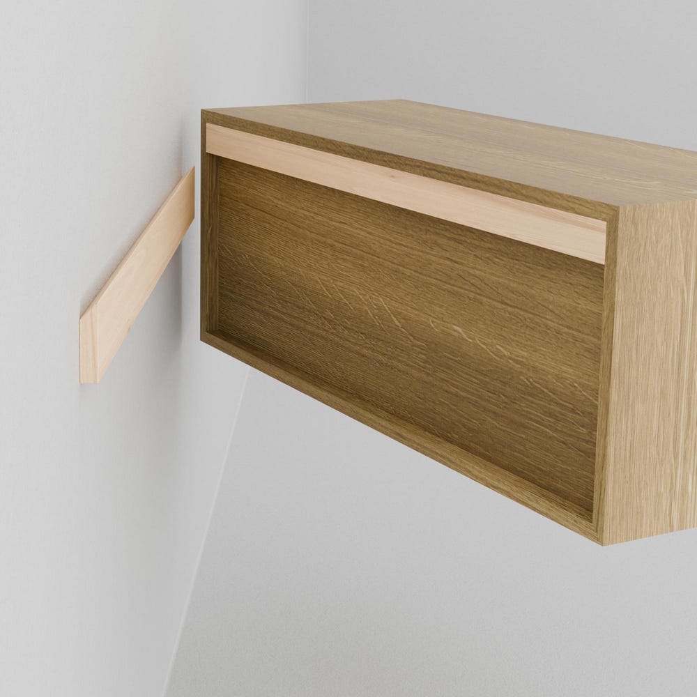 Our Floating cabinets are handmade from solid Hardwood (Available in Walnut, White Oak, Maple and Cherry). We build each shelf from hardwood boards joined with a 45 degree miter creating a beautiful wrap-around continuous grain.