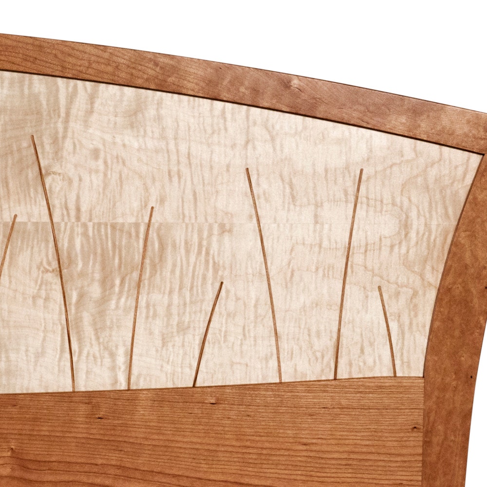 Both the headboard and footboard feature gently curved inlays that evoke the feeling of river rushes for a wonderfully natural and organic feel. They are set into a backdrop of gorgeous curly maple wood that appears to ripple like water, contrasting nicely against the darker cherry.