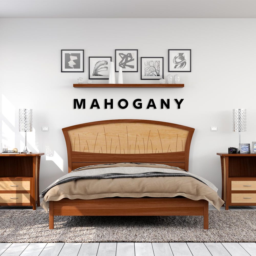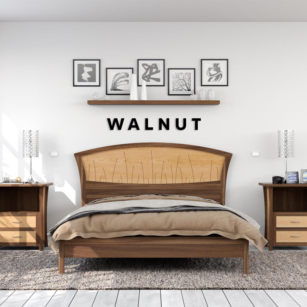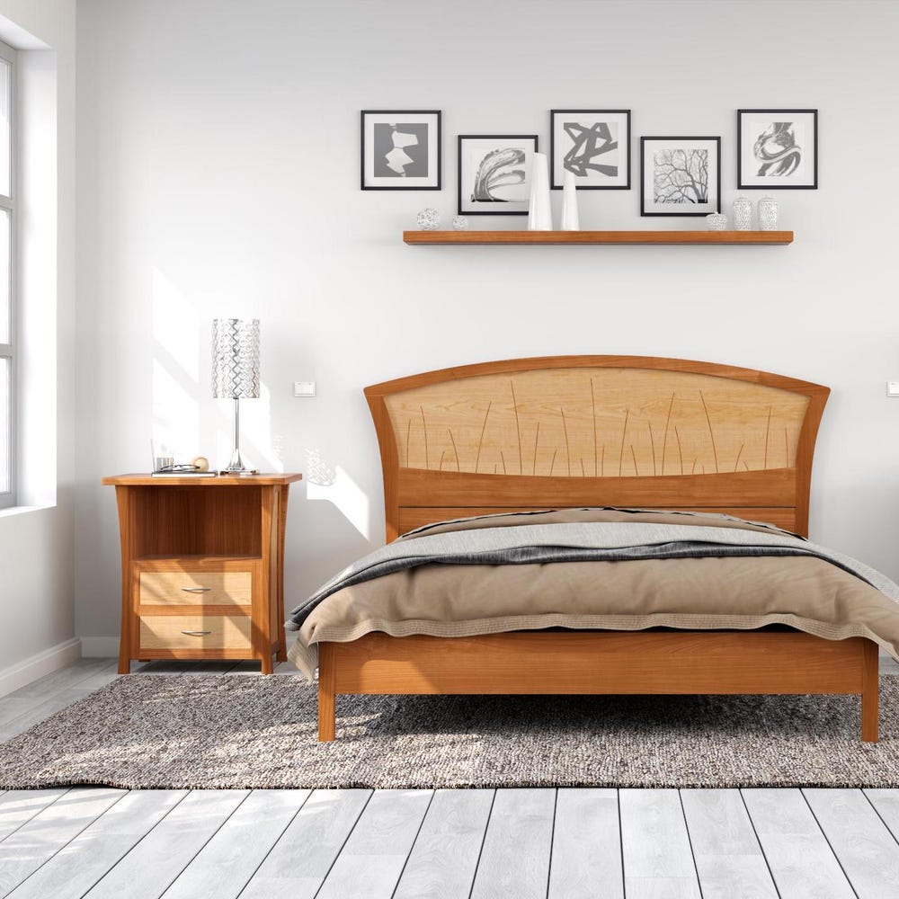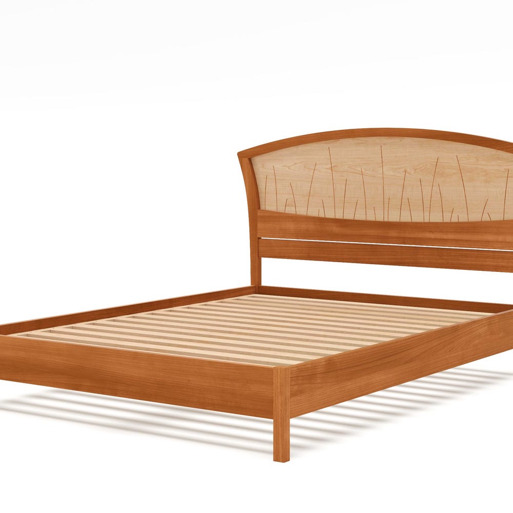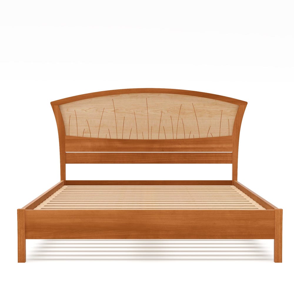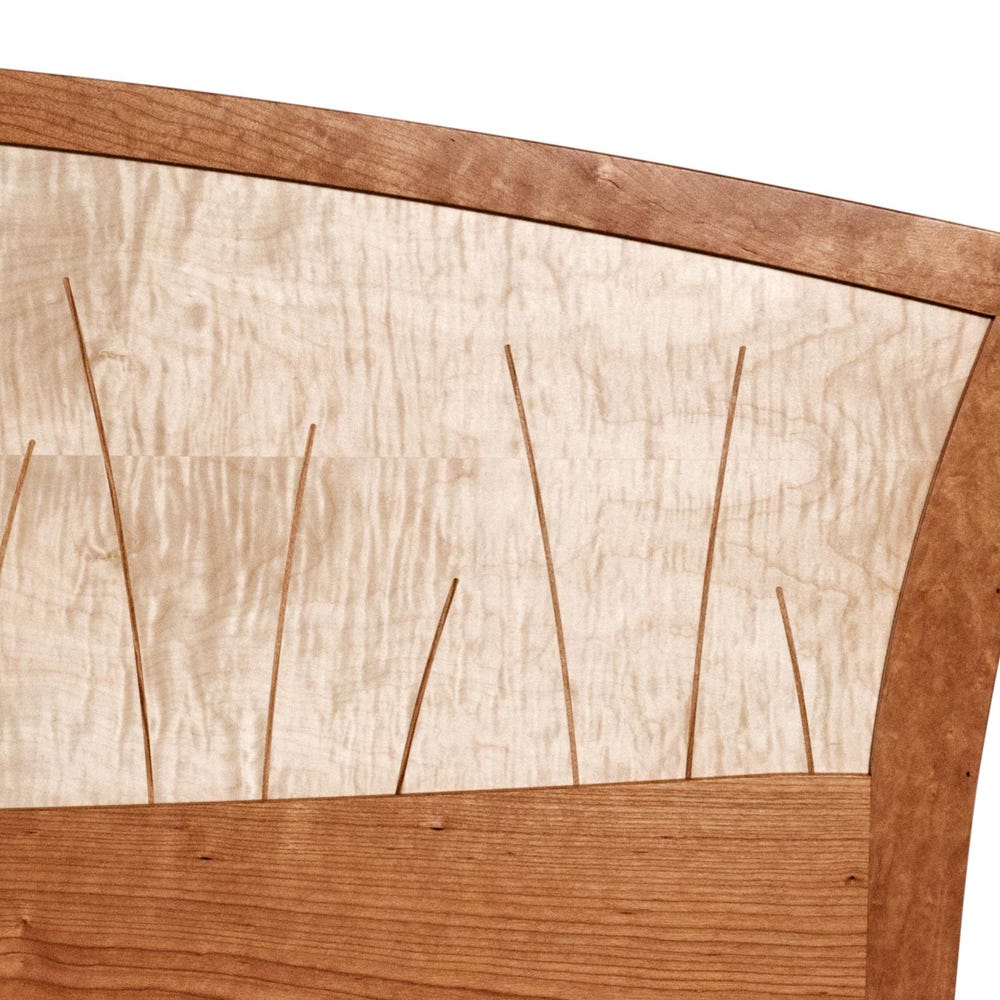 Handmade of solid wood, the headboard features curved inlays that evoke river rushes. The inlays are set into a backdrop of gorgeous curly maple that appears to ripple like water.