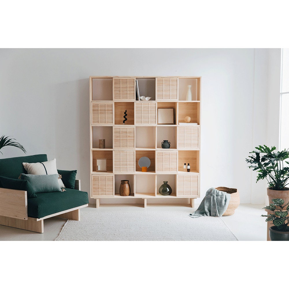 Introducing Xelida, a solid natural pine wood bookcase, combining the durability and elegance of the natural material, highlighting the beauty and texture of wood. Organize your space with our handmade, sustainable and resistant bookcase. This bookcase can be customized with 5 or 10 sliding lattice doors for a personal and functional touch. Customize it to your liking and enjoy the beauty and sustainability of natural materials.