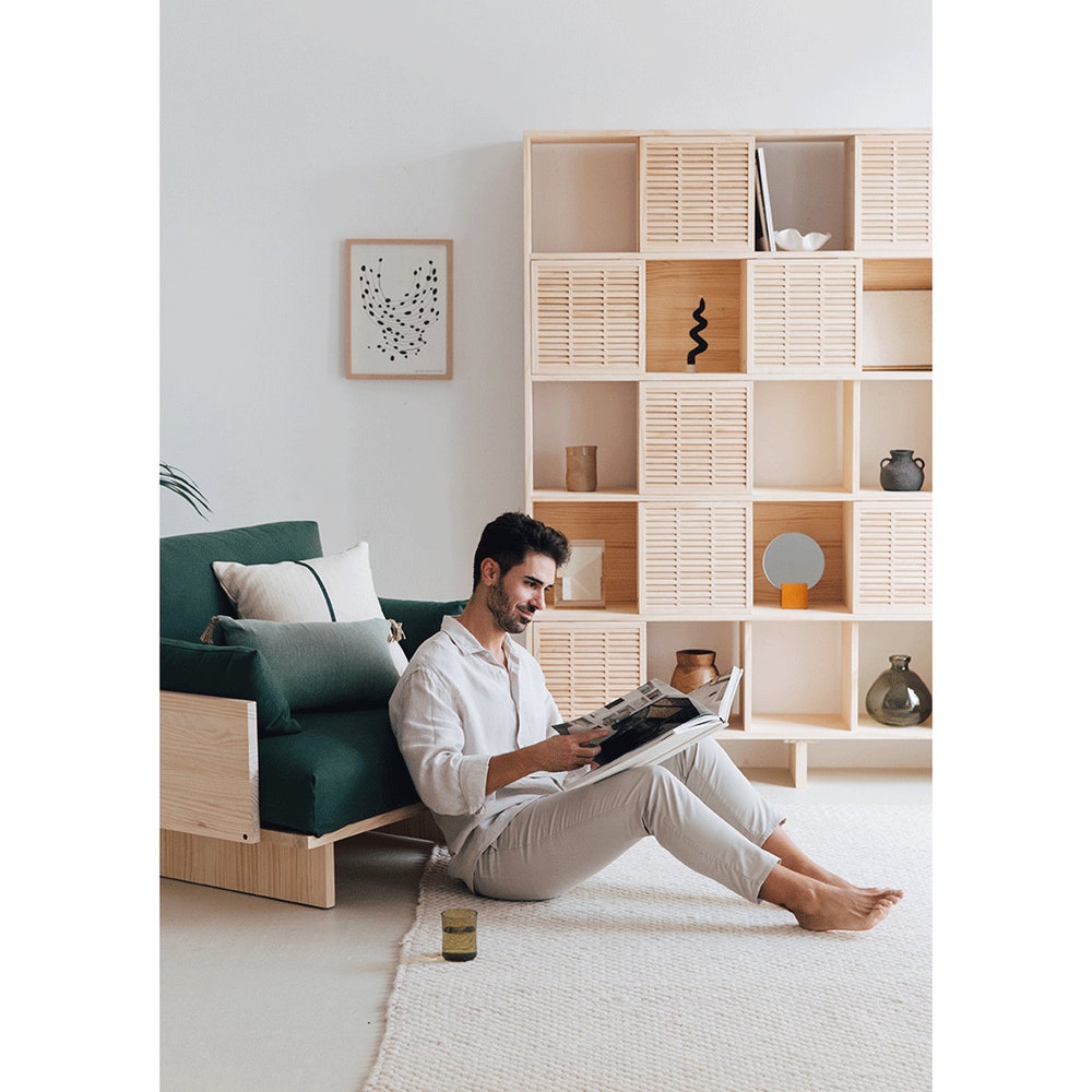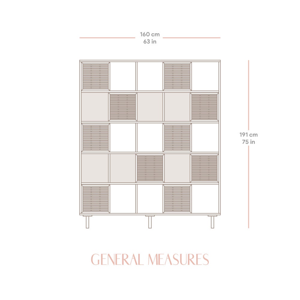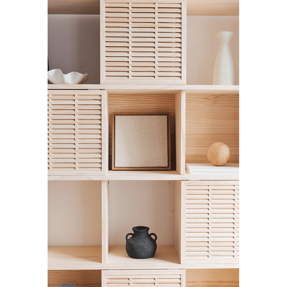 Our handmade lattice door, also known as “fresquera,” is the star material of this wood shelving. Its highly functional design has its roots in the tradition of the old Mediterranean “fridge,” which kept food fresh. Each lattice door is handmade by expert cabinetmakers and craftsmen of our land, making this bookcase a unique library decor piece.